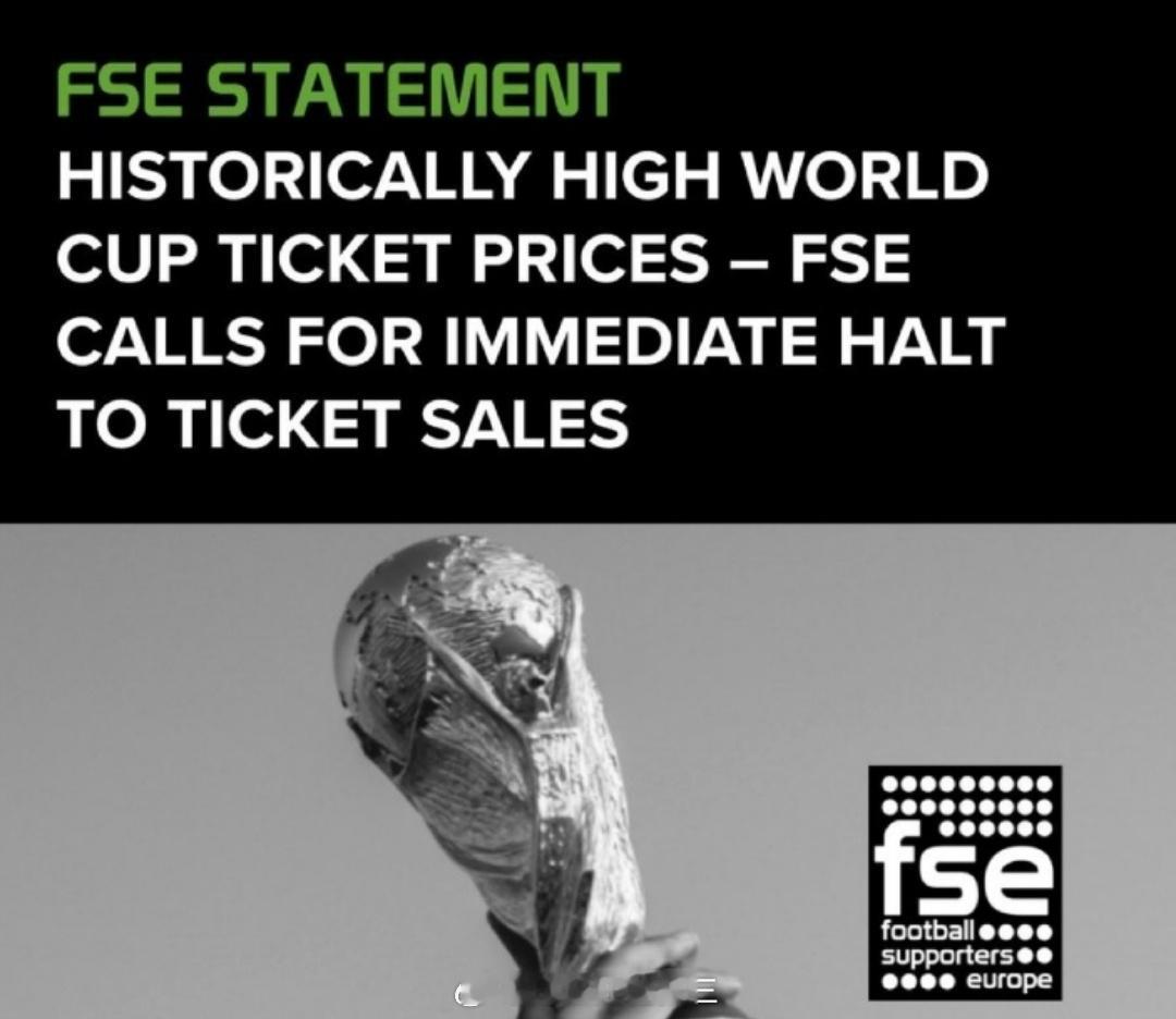 欧洲球迷组织抗议世界杯票价过高:几乎是上届五倍,令人愤慨欧洲球迷组织“欧洲球迷协会”发表声明,对于明年世界杯过高的球票价格予以了公开抗议。声明:世界杯票价创历史新高——欧洲球迷协会呼吁立即停止售票欧洲球迷协会对国际足联为明年世界杯向最忠实球迷设定的天价球票感到震惊。在国际足联逐步秘密公布的票价表中,分配给各参赛会员协会的球票价格已达到天文数字。这类球票通常由协会通过官方球迷团体或忠诚度计划分发给最核心的球迷。根据目前掌握的信息,若一名球迷通过配额追随主队从小组赛一路看到决赛,最低需花费6900美元(约合4.87万人民币)——这几乎是2022年卡塔尔世界杯票价的五倍。国家队球迷需在2026年初全额支付该费用,才能获得追随主队直至决赛的机会。更令人愤慨的是,最忠实的球迷无法通过本国协会获得最低价位的门票:国际足联选择将数量稀缺的4类门票留作公开发售,并采用动态定价机制。这是对世界杯传统的重大背叛,无视了球迷为这项赛事盛况所做出的贡献。世界杯历史上首次出现小组赛阶段门票价格不统一的情况:国际足联引入了可变定价政策,定价依据是诸如赛事“感知吸引力”等模糊标准。因此,不同国家队的球迷在赛事同一阶段购买同一类别的门票,需支付不同价格,而国际足联执行的定价结构完全缺乏透明度。2018年公布的申办文件曾承诺门票最低价仅21美元,如今这些门票何在?根据同一申办手册,最便宜档位的门票若追随主队到决赛,总价应为2242美元——这一承诺早已荡然无存。我们呼吁国际足联立即停止配额球票销售,与所有受影响方展开磋商,并重新审核门票价格及档位分配,直至找到尊重世界杯传统、普适性与文化意义的解决方案。