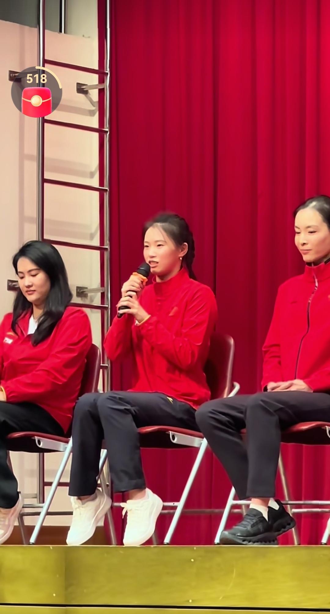 12月12日,中国跳水队运动员梦之队到澳门一学校参加活动,在活动中,陈若琳、吴敏霞和陈芋汐坐在台上与同学们进行互动。 陈芋汐坐在陈若琳和吴敏霞中间,陈芋汐穿着白色板鞋,黑色运动裤,红色运动上衣,戴着耳钉,梳着头发辫子,看起来很文静,陈芋汐在台上介绍自己的时候语言很简单。 陈若琳穿着粉色运动鞋,黑色裤子和红色运动上衣,长发乌黑发亮,看起来很漂亮。吴敏霞坐在台上,看起来很内敛。