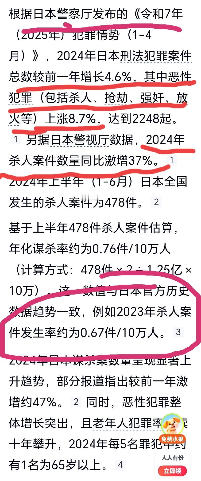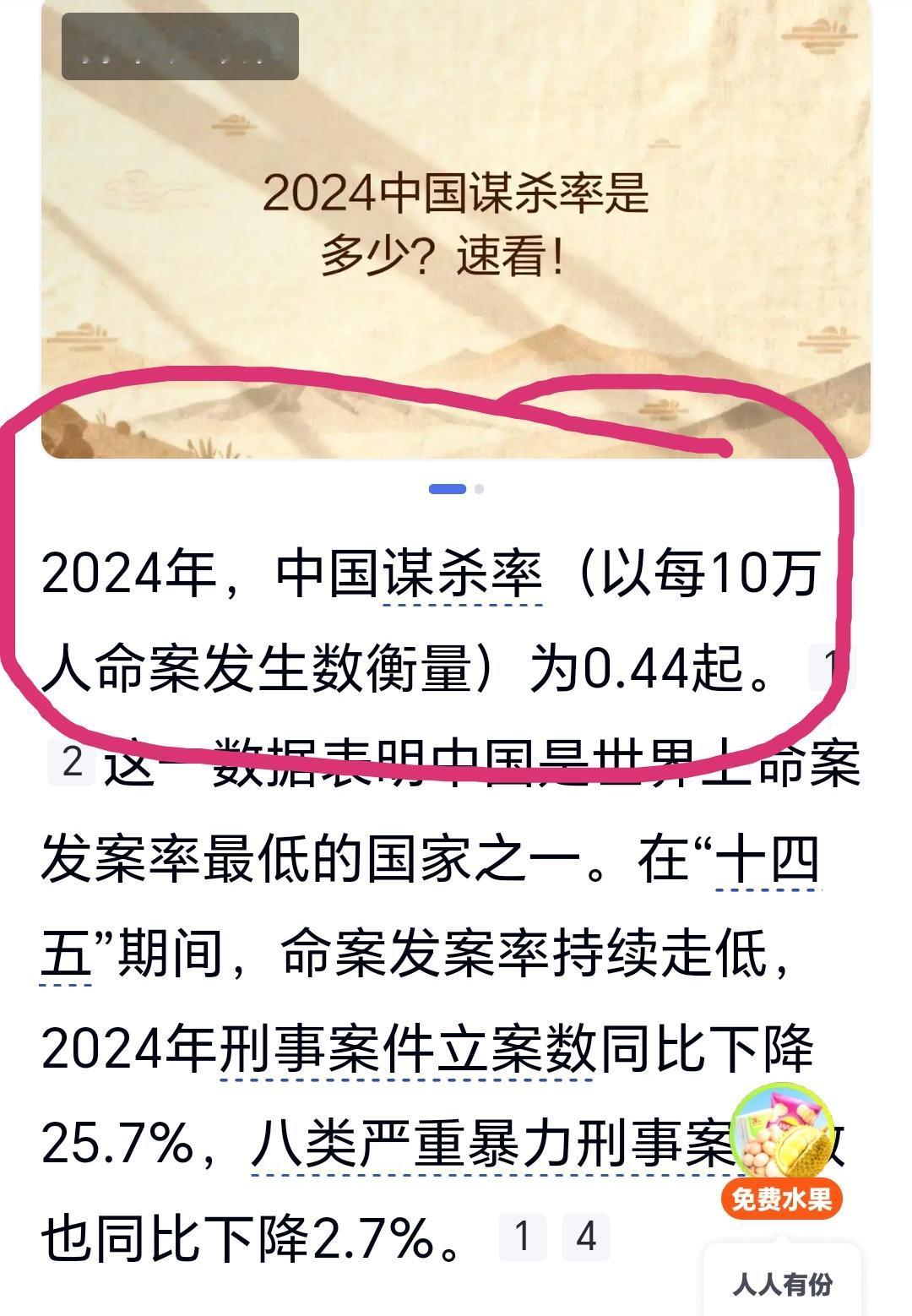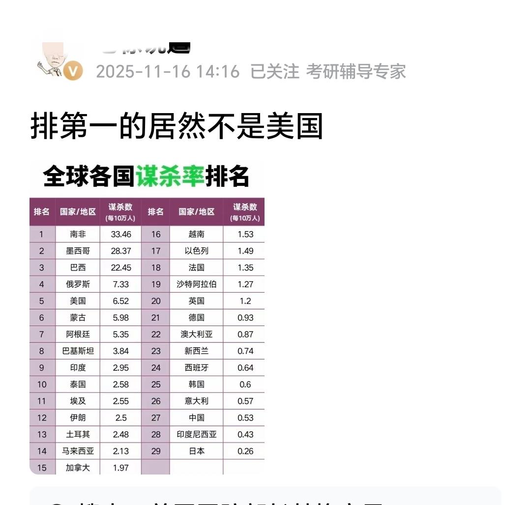现在咱妈不是说日本不安全吗?为什么日本谋杀率比中国还低啊?你看了这个是不是有这样的疑问? 其实呢,我们看看日本警察厅自己的公开数据。 杀人案件0.67/10万人,2023年的数据。而且日本的恶性案件增长8.7%,杀人案飙涨37%。说明日本的治安情况在明显恶化。 咱妈一心只想咱们好,有些人不开心了啊。 看到这个列表不由得感叹,按马斯洛需求理论,安全需求是最基本需求,那些所谓发达国家如果连基本人身安全都不能保障,这样的发达有什么意义。 美国居然不是第一?这样的话谁会问呢? 正常智力的人都会觉得应该是黑帮盛行的地方排第一。 虽然自由美利坚枪击每一天,但架不住人口总数多,所以排不到第一很正常。 但是美国治安差也是真的差。 顺便说一句,我们中国的命案率只有0.44/10万人,比日本也低很多哦。 惊不惊喜?意不意外? 安倍都可以被当街行刑的国家,居然还有人认为它的治安好。 我也是服了。 点右上角关注我,我们一起去看这个魔幻的世界