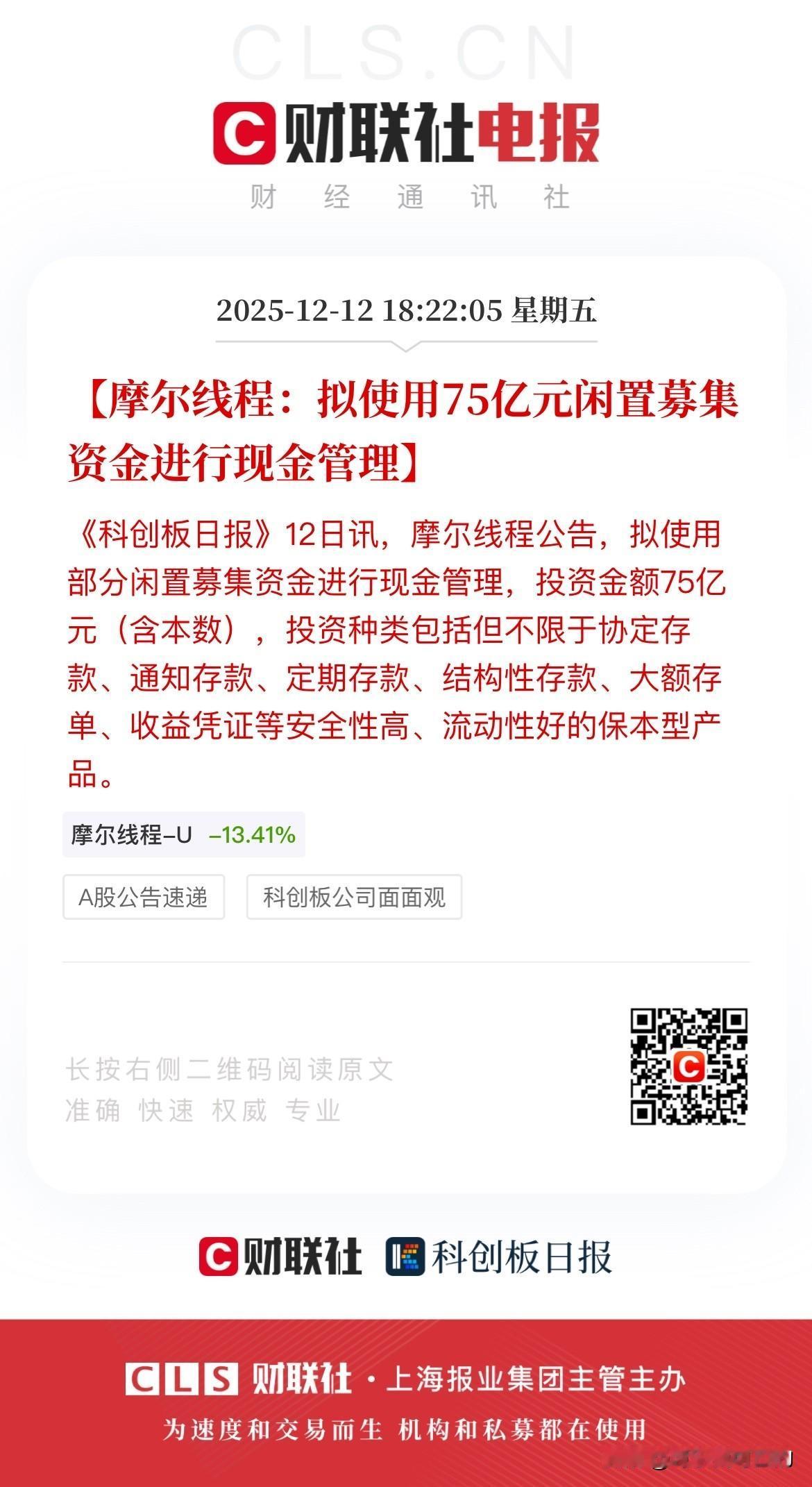 上市第6天,摩尔线程拟使用75亿元闲置募集资金进行现金管理,其实就是通常所说的理财! 要知道,摩尔线程上市一共募集了80亿,扣除发行费用后剩下75.76亿元,这也就是说摩尔线程把几乎所有的募集资金全拿去做理财了! 不是,摩尔线程你对的起股民给你投的钱吗?股民给你投这么多钱是让你去买理财的吗?那是让你去做研发,去搞生产,赶紧生产出咱们自己的高性能GPU! 还有,既然募集资金要拿去理财,那就说明这家连续多年亏损的科技公司不缺钱。那既然不缺钱,你又为什么要上市募集资金呢? 拿着巨额募集资金去理财,摩尔线程,真有你的!