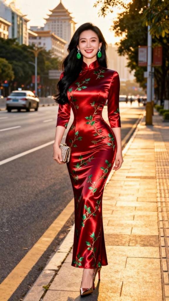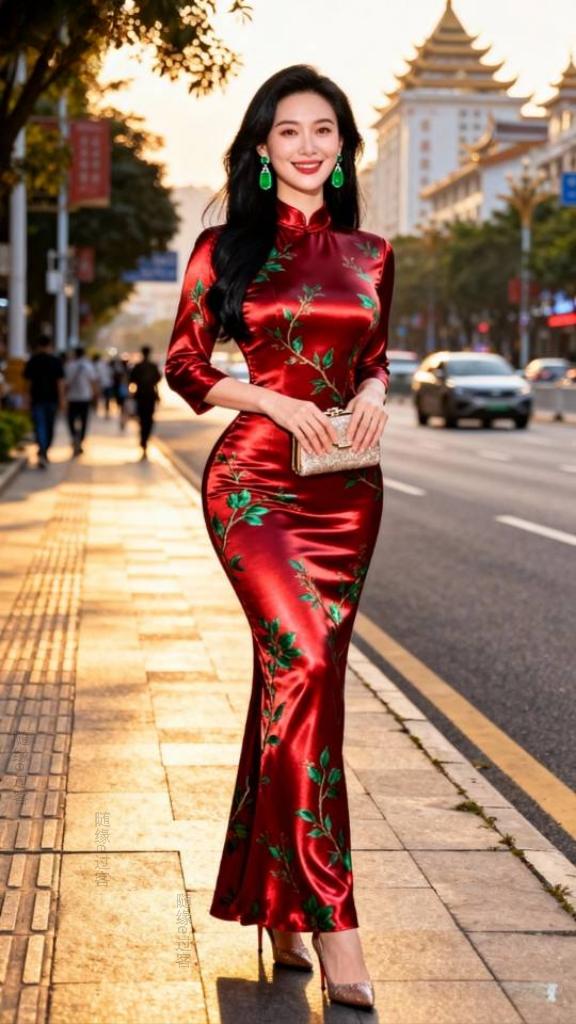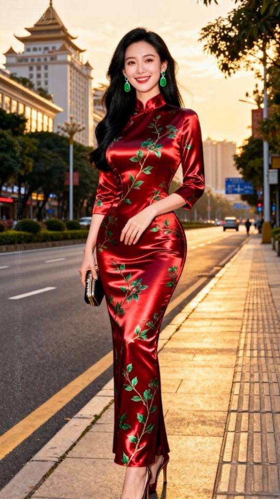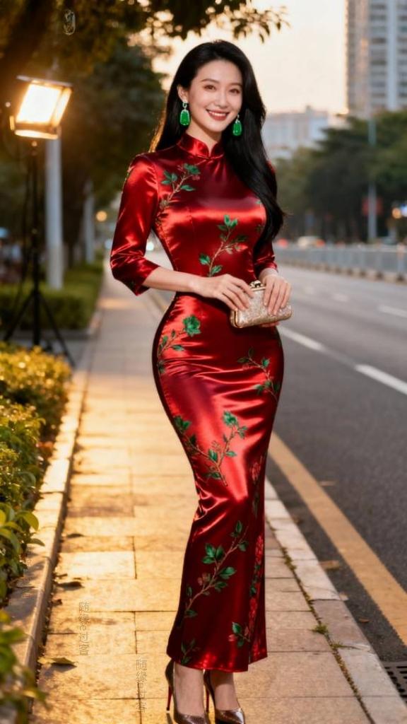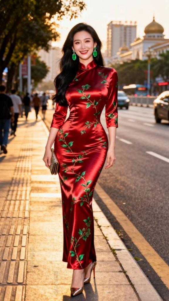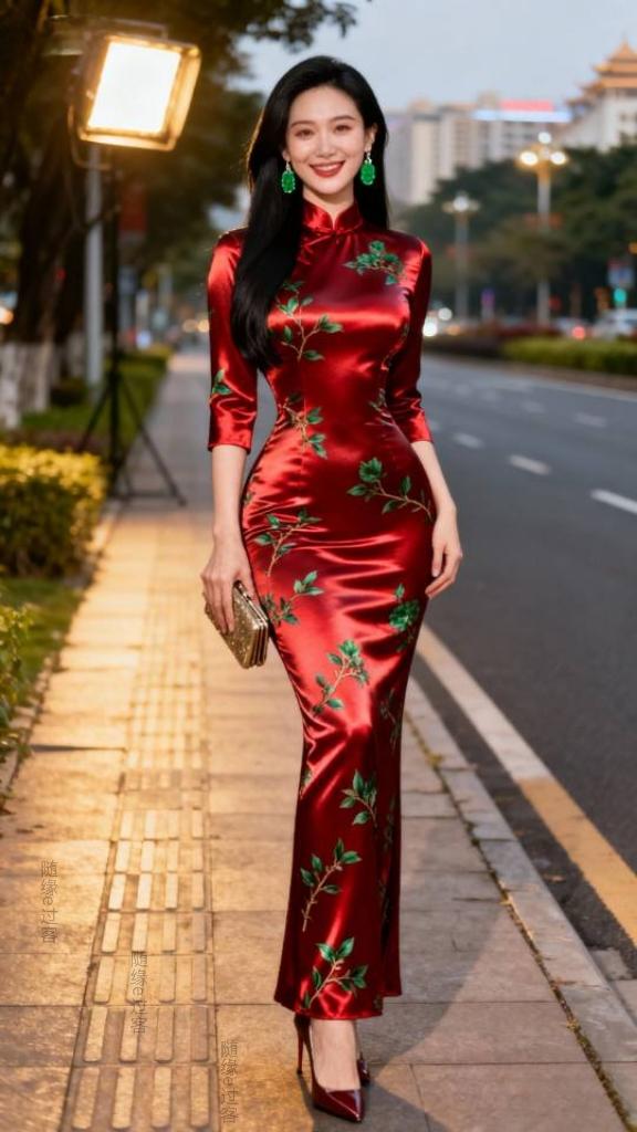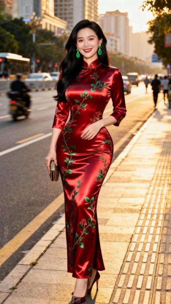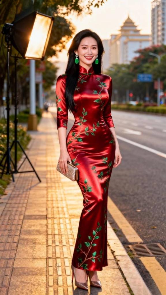 红旗袍裙女子城市街道旁写真。红礼服气质美女 街头红裙照 高雅气质美女 旗袍