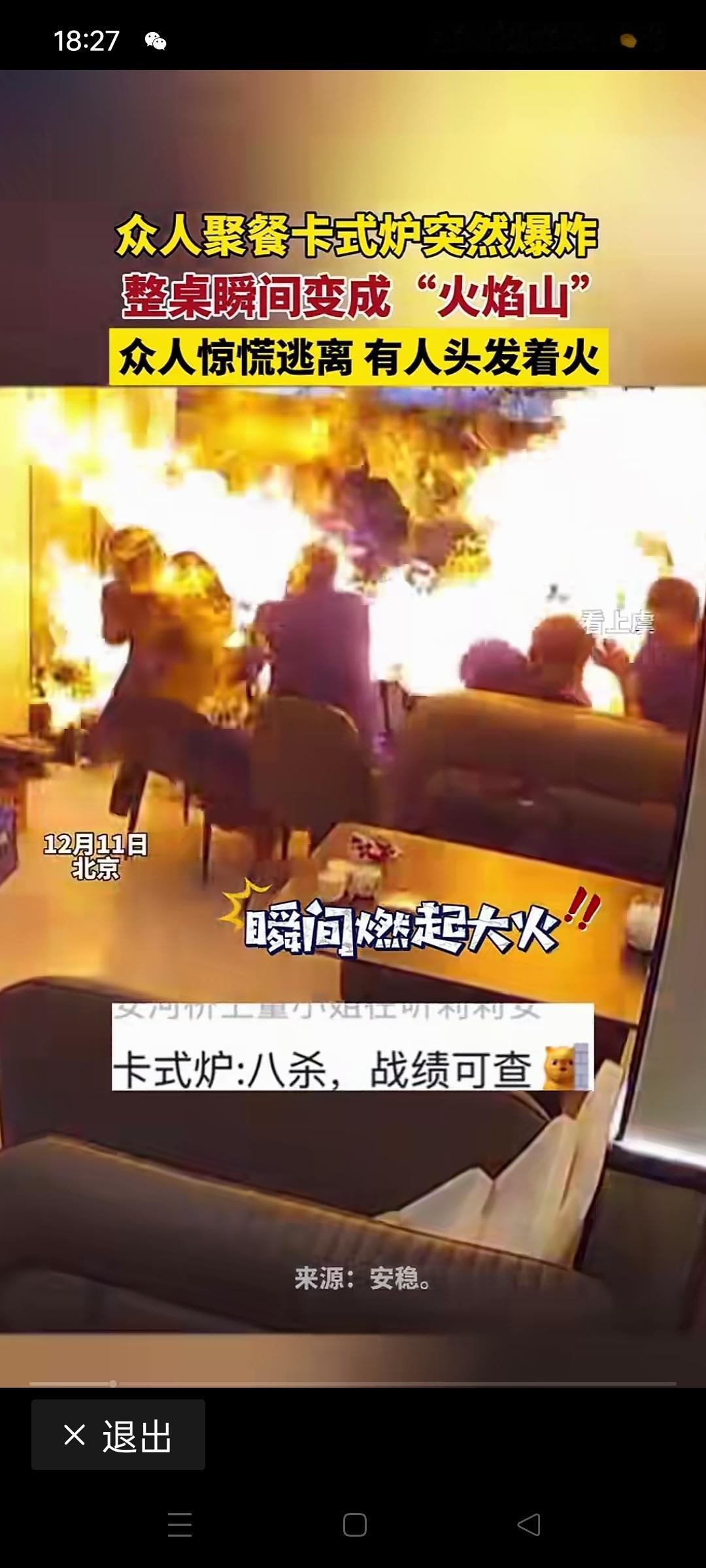 众人聚餐卡式炉突然爆炸,整桌瞬间变“火焰山”吓的众人惊慌逃离,幸运有惊无险,其中一位男子头发着火,头顶火苗就跑出来了,被烧成“卷卷”看着烧焦的头发,原谅我不厚道的笑了,众人聚会本想美美的吃一顿,没想到吃出一场灾难!没出危险是不幸中的万幸! 如有聚餐者,一定把卡式炉调好再用,以免发生意外!