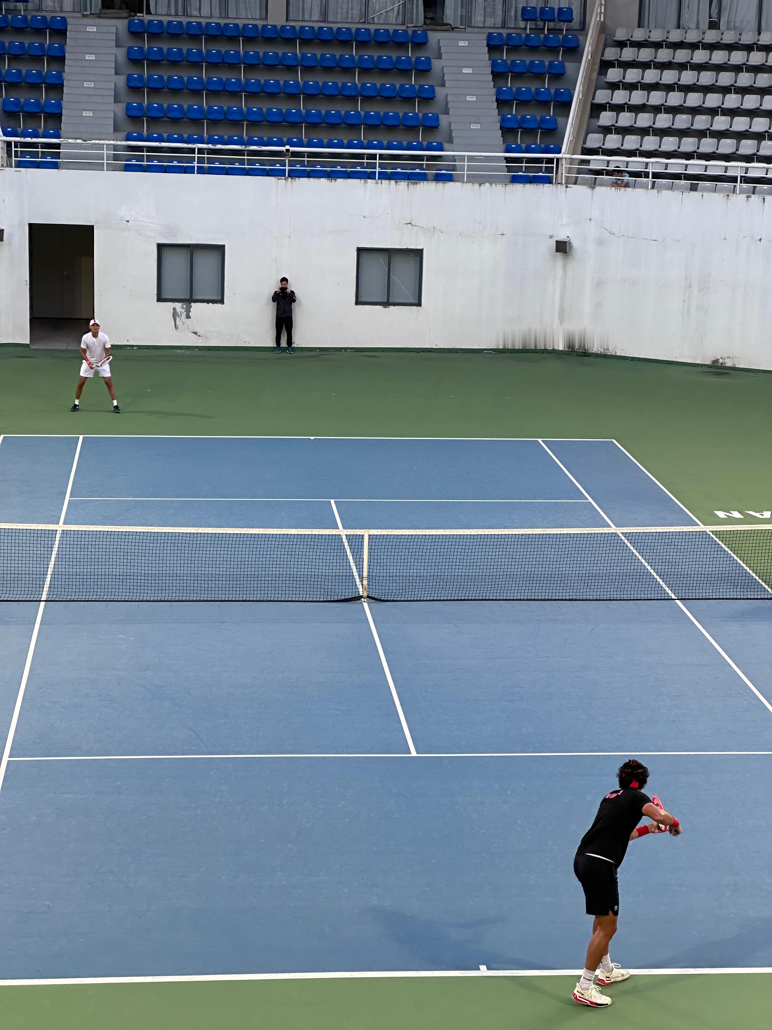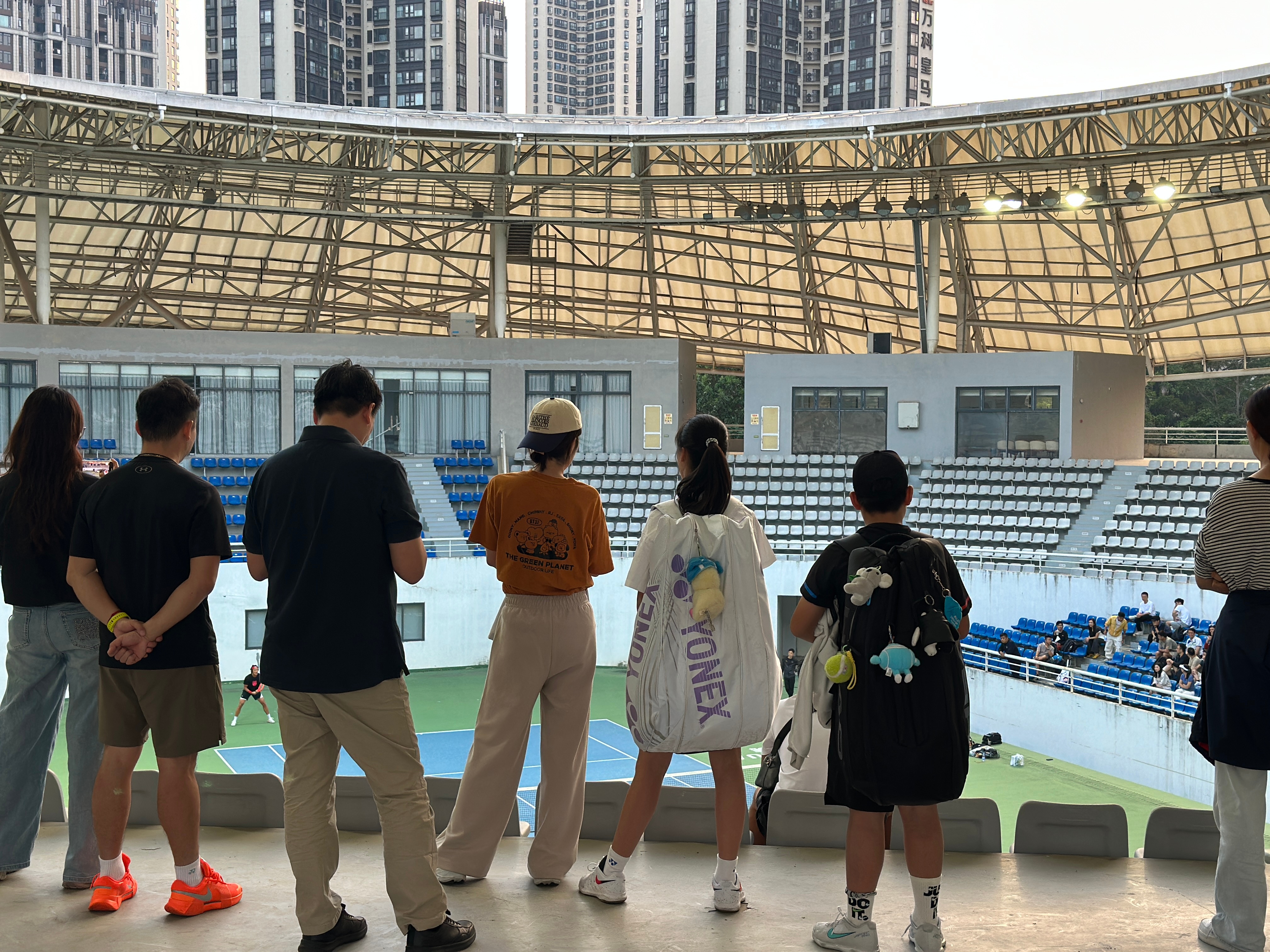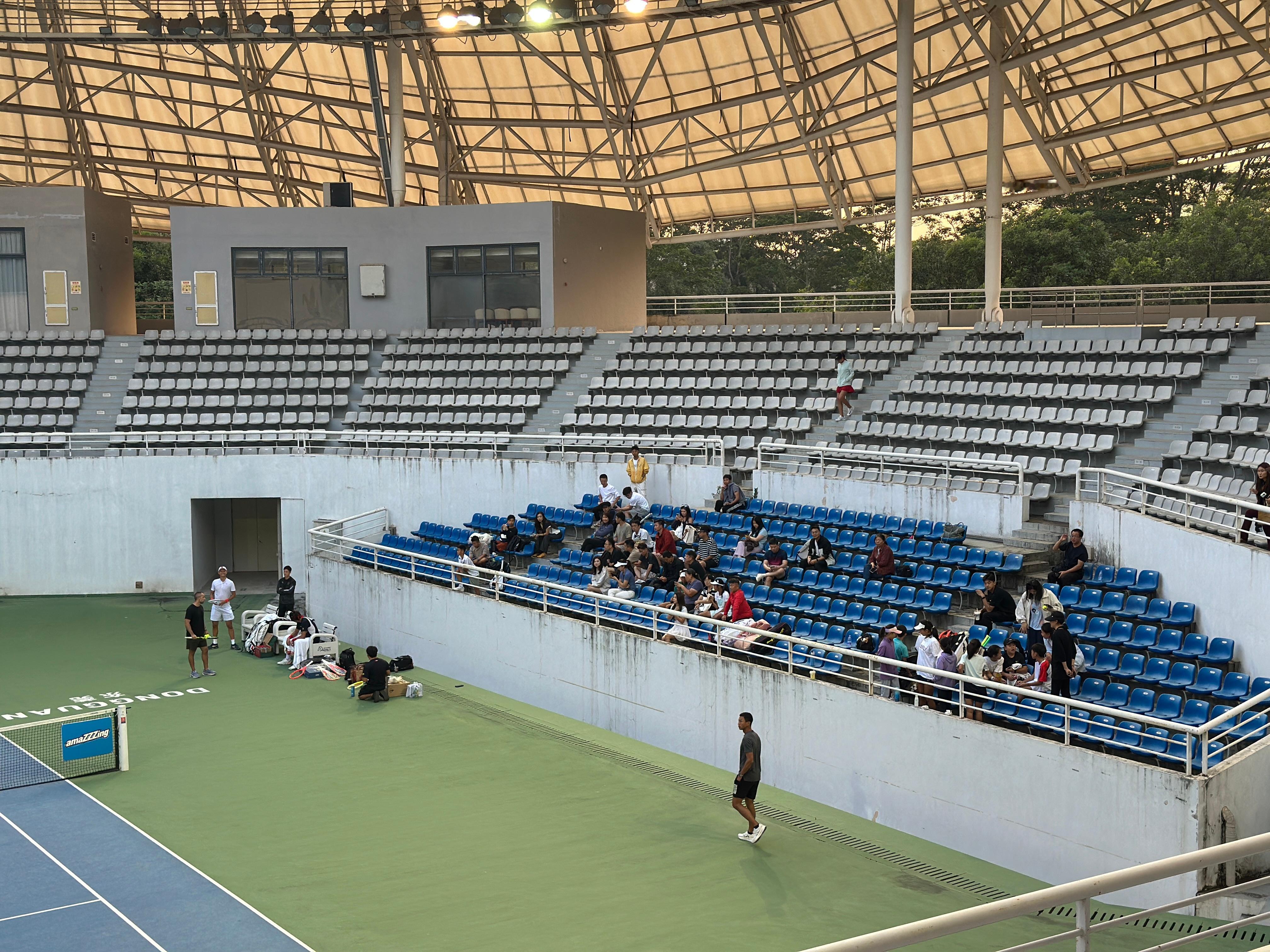 成人营和儿青少年营的营员,今天下午的一项活动安排是在东莞网球中心的中央球场观看职业级的训练赛。刚刚是张之臻对吴东霖,现在是张之臻对孙发京。张之臻那天直播也说了,肩膀基本好了,希望明年能打下一个完整的赛季。日头落了,小风转凉,开了灯接着打。 东莞·东莞市网球中心