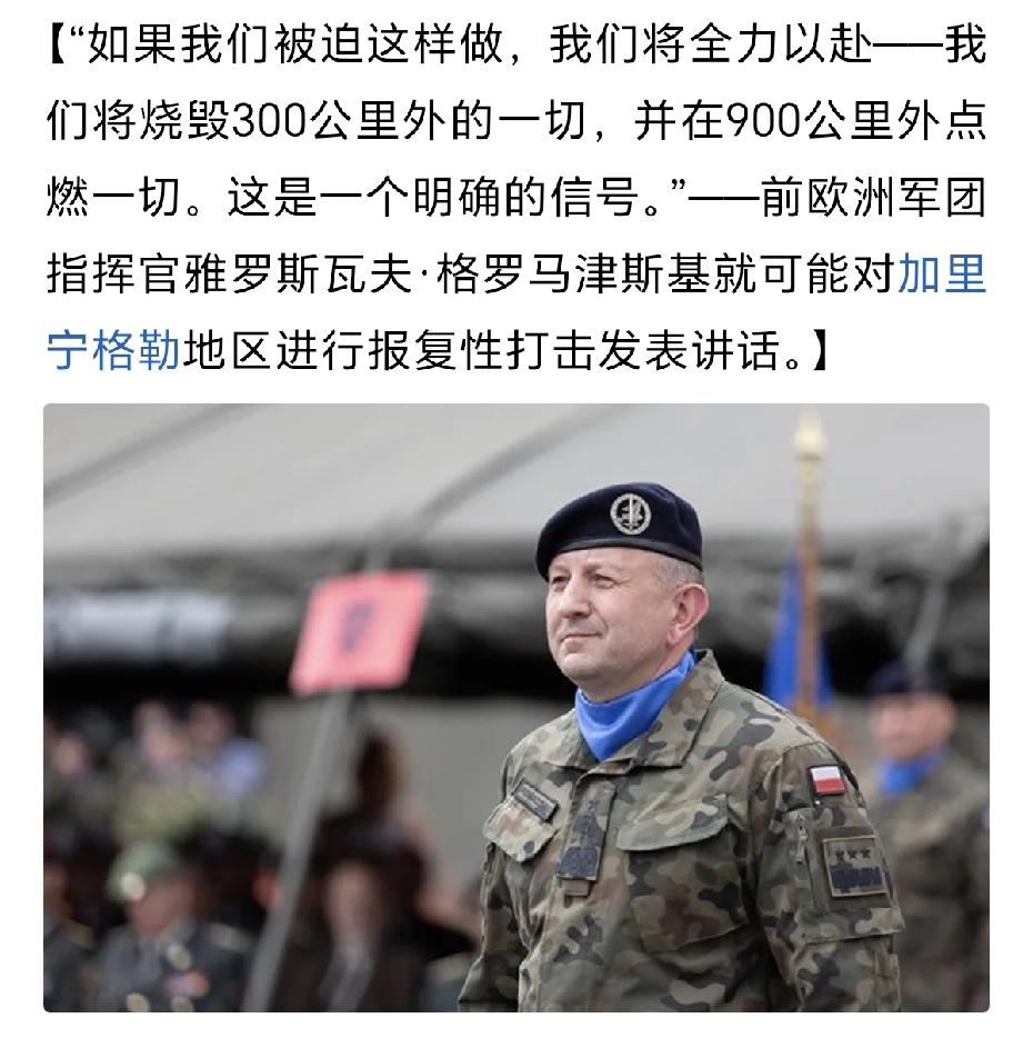 前欧洲军团指挥官?是个什么角色? 其实就是一个说话不用负责的角色。欧洲官方不敢放狠话,就让一个退役的人来说。 也是在试探俄罗斯的态度,如果俄罗斯当真了,欧洲立马夹着尾巴说,他代表不了官方。 如果俄罗斯当玩笑一样听,置之不理。欧洲就得了面子,你瞧瞧,我放的狠话多厉害呀!