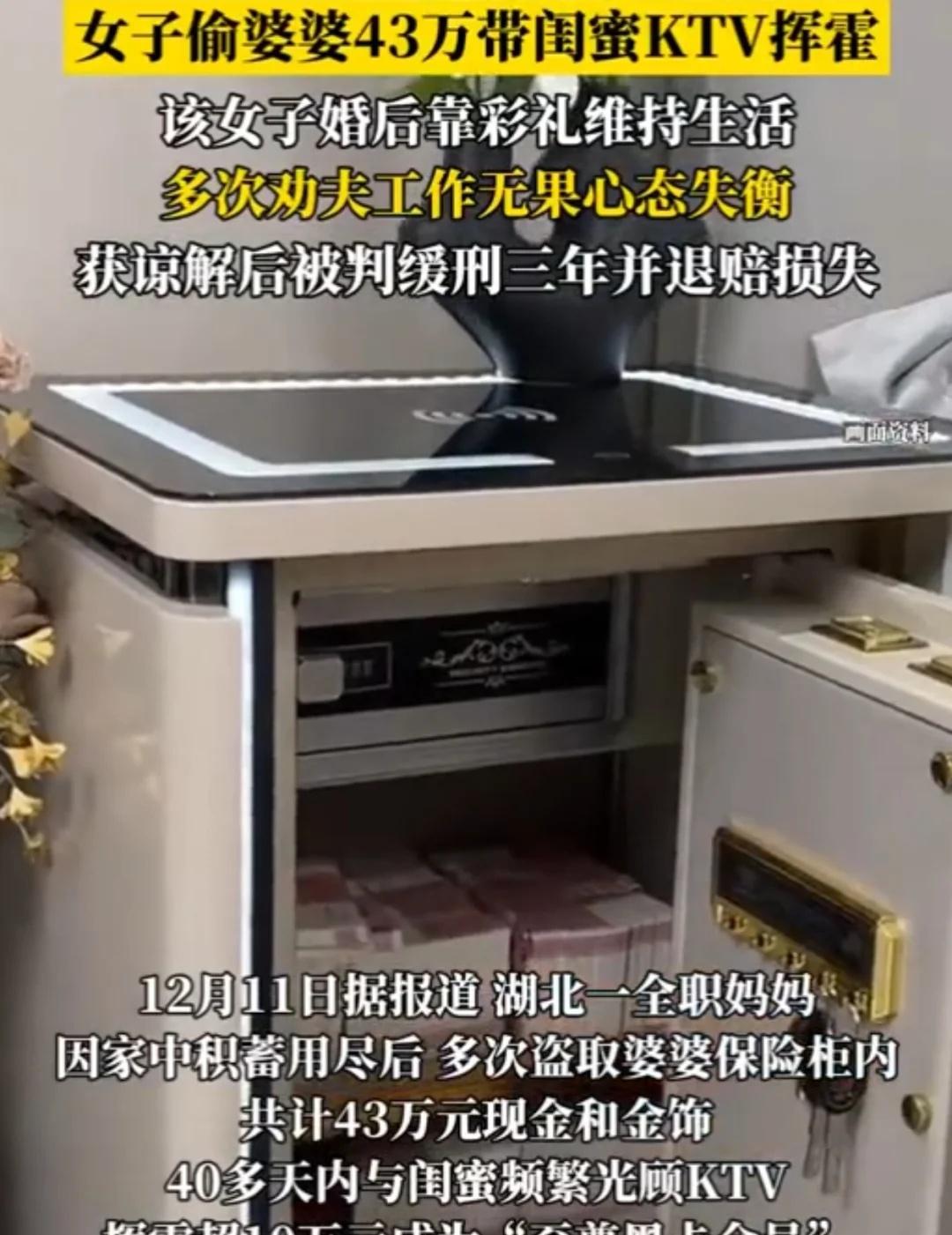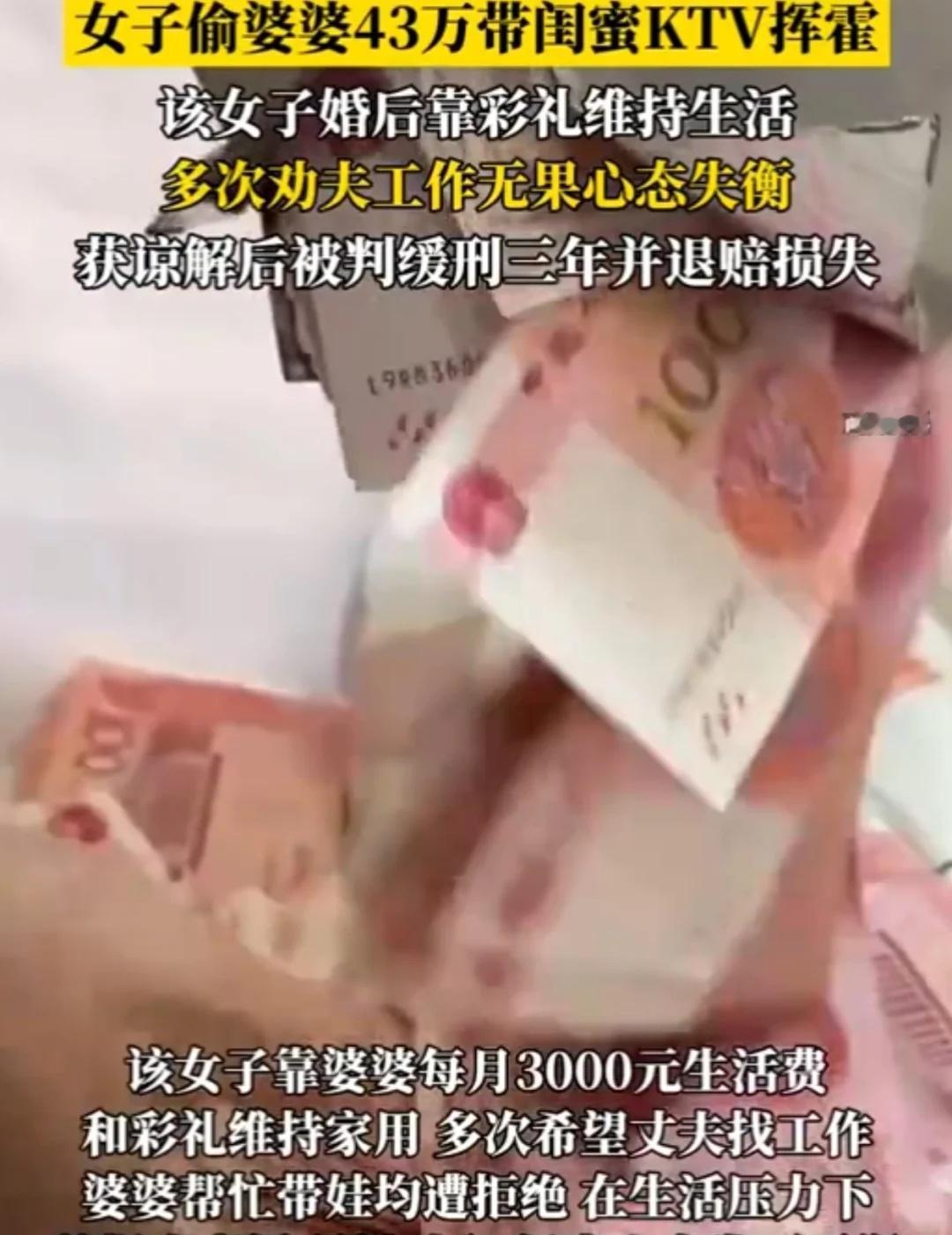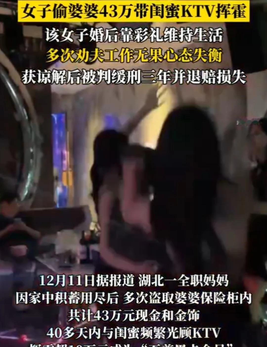 女子偷走婆婆43万元和闺蜜在KTV内挥霍完! “00后”张艾拉(化名)和丈夫刘勇(化名)2022年结婚后定居宜昌。婚后有了孩子,张艾拉便全职在家带娃,每月从婆婆谭玉(化名)那领3000元生活费。可丈夫刘勇一直没固定收入,家庭开支全靠结婚彩礼撑着,日子过得紧巴巴。 张艾拉心里苦啊,她多次劝丈夫出去工作,也盼着婆婆周末能搭把手带孩子,让自己能松口气。但丈夫依旧“躺平”,婆婆也没答应。生活的重担压得她喘不过气,甚至一度提出离婚。虽经家人劝和,可她心里的不平衡却像野草般疯长。 在极度压抑下,张艾拉做出了荒唐事。她偷偷打开婆婆保险柜,拿走43万元现金,一头扎进KTV开启“疯狂模式”。要知道,在酒吧消费超10万元就能成“至尊黑卡会员”,张艾拉把这43万挥霍得干干净净,仿佛这样就能摆脱生活的痛苦。 很快,事情败露,张艾拉因盗窃罪被法院判处有期徒刑三年、缓刑四年,还得缴纳5000元罚金,退赔全部款项。这起事件里,张艾拉触犯了法律,可背后的家庭矛盾也让人唏嘘。全职带娃的辛苦、丈夫的不上进、婆婆的不理解,都成了她走向错误的推手。 大家觉得在这件事里,丈夫和婆婆有没有责任?要是你是张艾拉,面对这样的生活困境,又会怎么做呢? 快来评论区说说你的看法。 社会新闻 正义永远不会缺席 遵纪守法人人有责 弘扬社会正气 维护社会公平正义 纪实故事 人生意外无处不在 反对一切暴力 遵纪守法才是正道