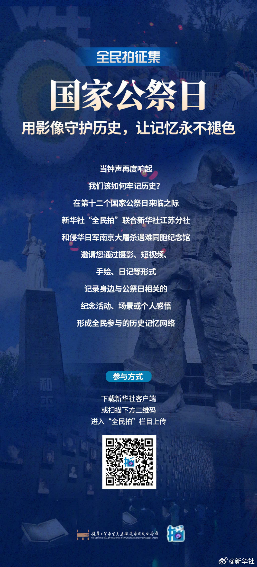 #影像守护历史记忆永不褪色#【#全民拍征集# | 国家公祭日:用影像守护历史,让记忆永不褪色】在第十二个国家公祭日来临之际,新华社“全民拍”联合新华社江苏分社和侵华日军南京大屠杀遇难同胞纪念馆,邀请您通过摄影、短视频、手绘、日记等形式,记录身边与公祭日相关的纪念活动、场景或个人感悟,形成全民参与的历史记忆网络。网页链接