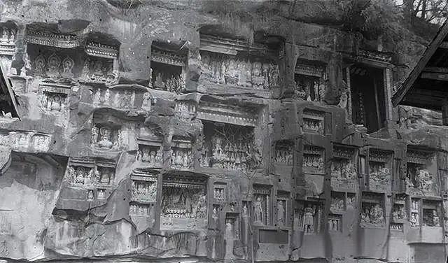 1914年3月31日,四川巴州南龛山石刻,整面崖壁被密密麻麻的佛龛填满,大小不一的龛窟如蜂巢般嵌在石间,每个龛里都雕着造像,虽经岁月磨蚀,仍能看出衣纹的舒展与神态的柔和。