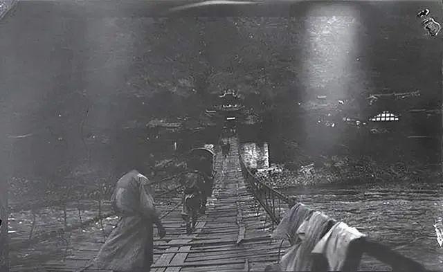 1914年7月3日,泸定桥,并非后世加固的样貌,数根黝黑的铁链横架在湍急的河面(虽未见水流,却能从桥身的悬空感揣度),桥面铺着窄窄的旧木板,缝隙间漏出下方的幽暗。桥身两侧的铁链上,简陋的绳索或细链充作护栏,带着几分摇摇欲坠的脆弱。 几个身影正走在桥上,近景处一人裹着宽大的长衫,步履略有些拘谨;稍远处的行人背着行囊,身影被桥的延伸感拉得细长。桥的尽头,模糊的楼阁依着山崖而建,檐角藏在阴翳里,像是这险桥的“终点标识”。