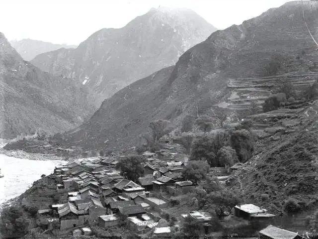 这是1908年7月1日的四川丹巴河谷村落,它嵌在险峻的峡谷间,两岸是陡峭的山壁(远处峰顶还覆着残雪),山脚下的河谷阶地上,挤着一片灰瓦民居——屋舍依坡而建、错落堆叠,黑瓦屋顶在草木间连成一片,旁边的江水泛着浅白的波光,是典型的“峡谷临江山村”格局。