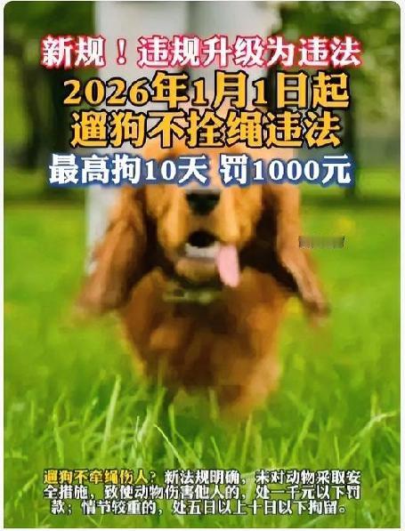 【养犬新规有新动静了!2026年起,遛狗不拴绳可能要被罚款,情节严重还会被拘留】 最近有个重要消息:明年(也就是2026年)开始,养犬新规实施后,遛狗不拴绳的话,可能要被罚款,情况严重的话还会直接拘留!这可不是小事哦。 新修订的《治安管理处罚法》已经明确了养犬的“硬规矩”:要是宠物伤人了还不管,罚款最多1000块钱;情况严重的话,直接拘留10天!以后养宠物可不能太随意啦。 早上的公园,李阿姨正牵着自家的小狗慢慢走。突然,一只没拴绳的金毛犬冲了出来,直接扑向旁边的小孩,把孩子吓得当场就哭了起来。以后这种“惊险”场景可能就少了——新规里明确规定,遛狗的时候必须牵绳,尤其是烈性犬,管理得更要严格。 养宠物的朋友们注意啦!这些行为可都是“雷区”,千万别碰:卖烈性犬却不改正的、宠物咬了人还不管不顾的,更别说故意让宠物去攻击别人。最关键的是,要是你家的狗不小心咬到了人,不光得赔医药费,说不定还得“进去待几天”,可别抱着侥幸心理! 其实文明养犬也不难做到:出门带根牵引绳、一个拾便袋,再按时给宠物打疫苗,这些小事做好了,既是对其他路人负责,也是为了咱们自家的毛孩子着想。毕竟谁也不想让自家的毛孩子惹出麻烦,你说对不? 最后想问问大家:你觉得小区里最该管的,是不拴绳的狗,还是不清理狗便的主人呢?也欢迎大家来聊聊自己的养犬故事呀~