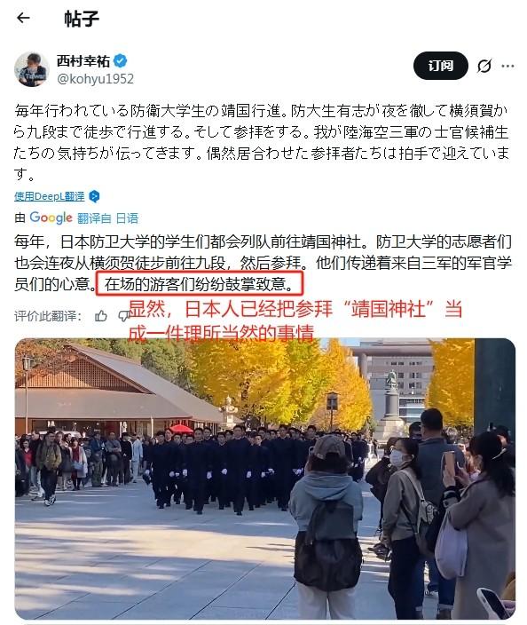 日本自卫队未来军官,集体参拜“靖国神社” 12月11日,有日媒记者披露,近期日本防卫大学学员集体从横须贺彻夜徒步前往“靖国神社”参拜。 防卫大学是日本自卫队初级军官的核心培训院校,其学员基本都是自卫队未来的军官苗子,因此这次防卫大学学员集体参拜“靖国神社”,无疑暴露出军国主义思潮在日本军事体系中的顽固存续。 从自卫队队员被曝光长期集体参拜靖国神社,近年来日本政府高层不断在历史问题上开倒车、甚至谋求突破“专守防卫”原则,这一系列动向表明,日本从未正确认识和深刻反省侵略历史。 更讽刺的是,按照日媒的说法,此类活动已经成为日本防卫大学的“惯例”,这更凸显出日本的某种双重标准。日本这种错误二战史观的延续,不仅伤害了曾遭受日本军国主义侵略的亚洲各国人民的感情,更是对战后国际秩序的挑战。 这件事最让人玩味的地方,在于日媒口中轻描淡写的一个词——“惯例”。似乎在防卫大学内部,这种集体参拜活动已经不是第一次,甚至已经形成了一种不成文的传统,一种代代相传的“仪式感”。 我们可以想象一下,一群风华正茂的年轻人,本应在课堂上学习战略战术、国际法和现代军事伦理,却在深夜里,用双脚丈量着通往一个极具争议地点的道路。 这趟漫长的徒步,对他们而言,究竟意味着什么?是一场体能的极限挑战,还是一次精神上的洗礼和思想上的“加冕”?当这种行为成为“惯例”,它就在无形中塑造着这些未来军官的历史观和价值观,将一种特定的历史叙事,深深地刻进了他们的职业起点。 靖国神社的特殊性,早已是国际社会公认的事实。它早已不是一个单纯的宗教场所或战争纪念地,因为它供奉着包括东条英机在内的14名二战甲级战犯。这些人,是发动那场侵略战争、给亚洲各国人民带来深重灾难的罪魁祸首。 对于曾经遭受日本铁蹄践踏的国家来说,靖国神社本身就是历史伤口上的一把盐。日本防卫大学的学员们,作为未来的自卫队干部,他们的职责本应是维护和平、捍卫宪法,但他们却集体参拜一个美化侵略战犯的地方。 这不禁让人想问,在他们所受的教育里,那场战争的真相究竟是如何被讲述的?那些被供奉起来的战犯,又被塑造成了怎样的“英雄”? 把视野拉得更广一些,你会发现,防卫大学学员的这次行为,并非孤立存在。它像一面镜子,映照出日本近年来在历史问题和军事道路上的一种整体转向。 从政府高层来看,尽管迫于国际压力,在任首相亲自参拜的行为有所收敛,但以“自民党总裁”名义供奉祭品的行为却从未间断。这实际上是一种“换汤不换药”的姿态。 更值得警惕的是,日本正在一步步地突破其和平宪法的限制,大幅增加防卫预算,甚至公开讨论拥有“对敌基地攻击能力”,也就是我们常说的“反击能力”。这种“反击能力”的实质,已经远远超出了“专守防卫”的原则范畴,标志着其军事战略正在发生根本性的转变。 当未来的军官在精神上向军国主义的象征低头,当现行的国家政策在行动上不断突破和平的底线,这两者之间形成了一种危险的共振。日本一方面在国际社会上极力扮演着和平主义者的角色,强调自己是“国际秩序的维护者”; 另一方面,其内部却涌动着一股试图重写历史、松绑军事的暗流。这种言行不一的做法,构成了一种令人不安的双重标准。 它不仅让曾经深受其害的亚洲邻国感到愤怒和失望,更是在侵蚀着二战后建立起来的国际秩序的根基。战后秩序的核心之一,就是对侵略历史的清算和对和平发展的承诺,而日本如今的种种动向,无疑是在挑战这一核心。 这整个事件的链条,从一群年轻学员的深夜徒步,到国家战略的悄然转向,揭示了一个令人忧虑的趋势:历史问题在日本远未得到真正的清算,反而被一些政治势力当作工具,用来凝聚国内保守力量,推动国家走向“正常化”的大国军事道路。 这种思潮的顽固存续,就像一颗埋在地区和平土壤里的种子,随时可能在不经意间生根发芽。 当一个国家的未来军事力量,其世界观的形成与一个充满争议、美化侵略的场所深度绑定时,这究竟会把这个国家,以及它所在的这个地区,带向一个怎样的未来?这个问题,或许值得我们每一个人去思考和讨论。