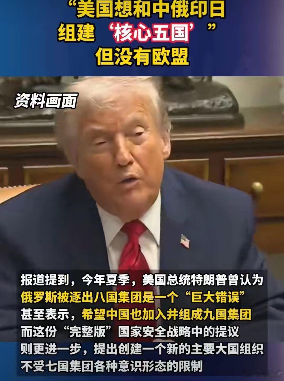 美国想和中俄印日组建核心五国美国欲组建中俄印日美“核心五国”,欧盟被排除在外据美国军事新闻网站“防务一号”报道,美方未公开的完整版国家安全战略中,提出了组建“核心五国”(Core 5,C5)的构想,成员国锁定美国、中国、俄罗斯、印度和日本,均为人口超1亿的大国,将效仿G7定期举办峰会,首要议程聚焦中东安全,推动以色列与沙特阿拉伯关系正常化。该构想突破了G7的意识形态束缚,此前美国总统特朗普曾主张让俄罗斯重返八国集团并吸纳中国组成G9,此次“核心五国”提议更进一步。值得关注的是,欧盟未被纳入这一组织,完整版战略还包含对华竞争、退出欧洲防务、重心转向西半球,以及靠“文化价值观”影响欧洲等要点,其后续推进及各方态度备受瞩目。