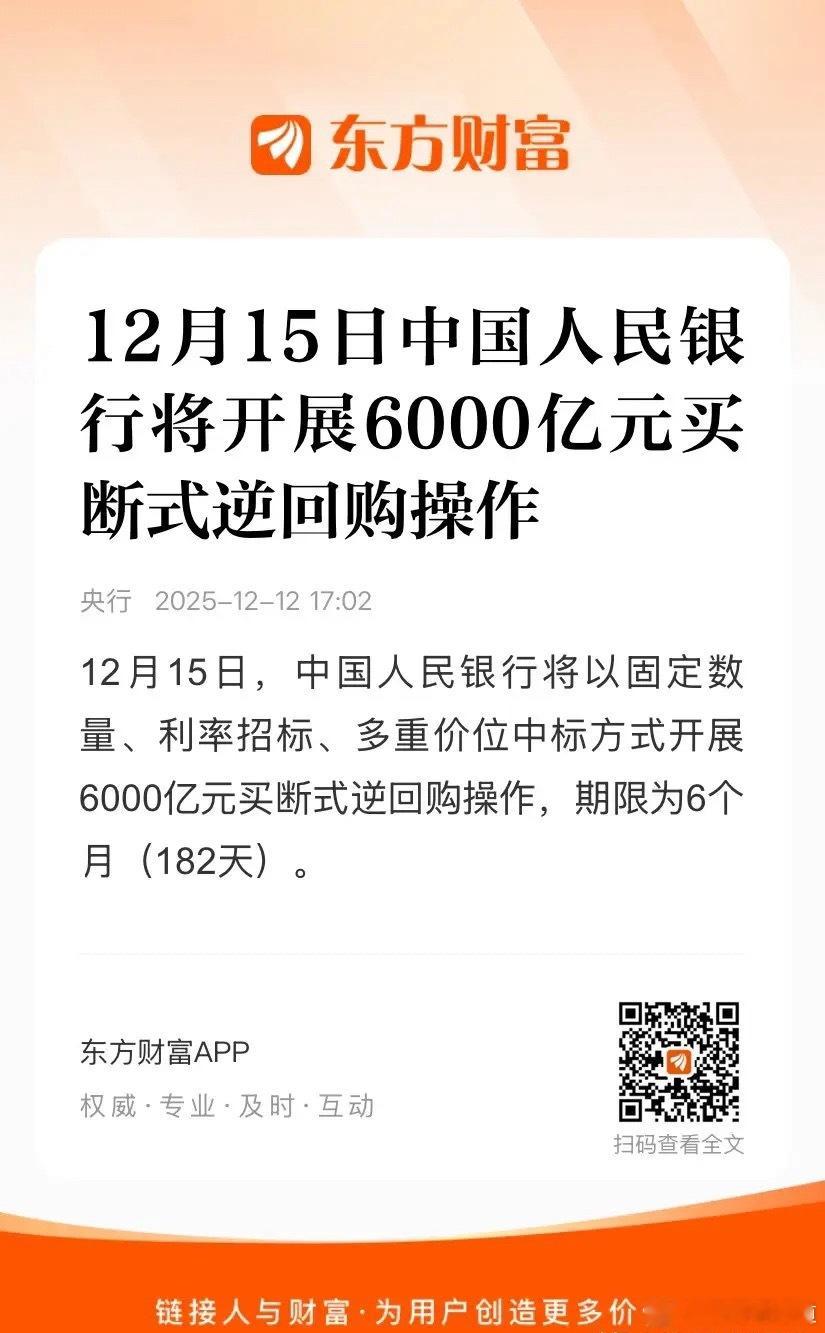 A股收盘后,又有利好消息;而到了下周一开盘,都会被解读为“利空”,因为利好消息都兑现了!果真是这样吗?一起解读下。还记得上一次8000亿元买断式逆回购操作的时间吗?2025年11月17号,当天板块收跌1.05%。当周的20号(周四),中金公司、东兴证券、信达证券三家公司发布公告,宣布合并重组。当周板块下跌4.83%。吓人!这一次,在二次探底的预期下,好像又是一样的味道,难不成,下周四中金公司“3合1”又要出新的公告?不过,央行12月15号开展6000亿元买断式逆回购的操作,对证券板块是明确的利好。将通过流动性改善、交易活跃、成本降低和政策协同四大路径提升券商业绩和估值。结合近期证监会“杠杆松绑”的政策,证券板块不排除真的会迎来“业绩+估值”双重提升。而且这一次期限长达6个月,为市场提供更稳定、持久的流动性且与近期政策也会形成强大的合力。今天尾盘集合竞价,港股证券的异动,不排除跟这个消息有关。这么关键的时刻,就看下周的A股市场,会不会有资金愿意买账了。