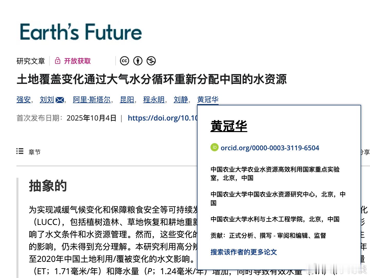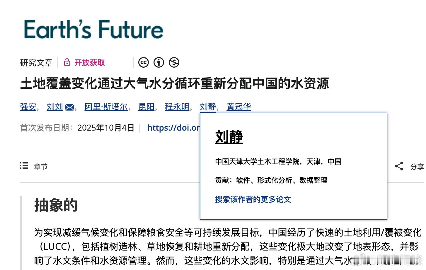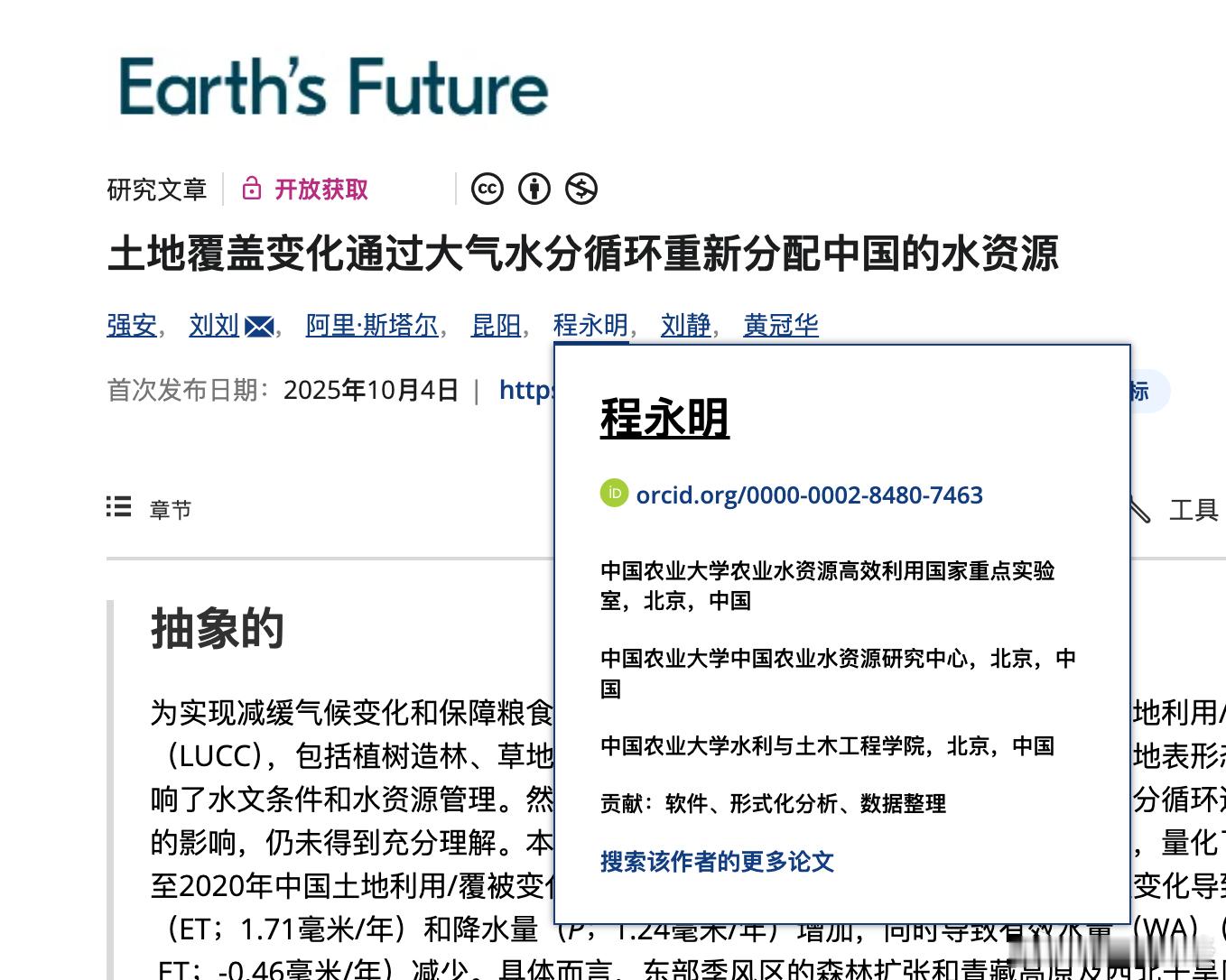【中国种植了780亿棵新树——却严重扰乱了其水循环】[亚马逊的树木砍不得,美加的大火是自然选择,中国的绿化有害......这些学校是吃饱了撑的么?荷兰一个人带着2所中国高校6个人搞出的“学术文章”,试问,拿了荷兰多少钱?他们做不到的你做到了就是原罪,建议罚这些人去西北种树](PopularMechanics)中国在建造事物方面尤为擅长,这早已不是秘密。世界最大的水坝?在中国。最大的高铁网络?同样在中国。最大的风电场?中国。太阳能阵列?阿根廷?真的?不,也是中国。最大的古代地标?你懂的。在建设狂潮中,中国也在持续发展。受最后一项基础设施成就的启发,中国自1978年起启动"三北防护林带"工程,即"绿色长城"计划,旨在防治水土流失、减少沙尘暴。据官方媒体宣布,这项工程已于去年全面竣工。据路透社报道,中国新增造林面积达11.6万平方英里,使全国森林覆盖率从1949年的10%提升至2024年的约25%。但《地球未来》期刊最新研究显示,这些新增林木(据估算自80年代初已达780亿株)对中国水资源分布产生了意料之外的影响。@ 天津大学、@ 北京中国农业大学 和荷兰乌得勒支大学的科学家发现,2001至2020年间,植被增加导致中国东部季风区和西北干旱区的水资源减少。据《生活科学》报道,鉴于这些区域约占中国国土总面积的74%,这一发现意义重大。研究指出,"绿色长城"等绿化工程,以及1999年启动的"退耕还林"和"天然林保护"计划等造林举措,均加剧了蒸散作用——该术语融合了蒸发与蒸腾作用(植物通过气孔释放水蒸气的过程)。研究作者指出:"这些变化导致降水模式改变,更多水汽被输送至青藏高原,使该地区水资源可用性提升。相反,中国东部和西北部地区水资源可用性下降,其中西北部损失最为严重,因大量水汽转移至青藏高原。"通过研究这些快速土地利用/覆盖变化(LUCC),作者还指出某些区域转变——如草原转森林或农田转草原——以不同速率影响着蒸散发、降水率和水资源可用性。例如,草原转森林增加了蒸散发和降水,但对水资源可用性产生了负面影响。遗憾的是,中国水资源分布与人口分布存在严重错位。研究显示,全国北部地区约聚集46%人口及半数以上耕地,但水资源可利用量仅占全国20%。作者强调,未来规划造林计划时必须充分考量这些改变后的水文循环规律。作者写道:“我们的研究结果表明,土地覆盖变化能够在不同区域之间重新分配水资源。理解这些影响对于规划中国的可持续土地和水资源管理至关重要。”[Yahoo和有关论文后的评论]· 所以气候变化是人类的错,是中国人干的。· 无论如何,如果该地区曾经是森林,他们试图让自然回归更自然状态的努力是值得称赞的。· 这个假新闻……事实上,植树有助于灌溉,水流会更强、更好……撒谎的混蛋。· 植树比砍树难多了。· 如果这项研究仅限于这篇优秀文章的内容,那它就是不完整的。亚马逊雨林已被证明需要连续的森林才能让水分迁移到更高的海拔。森林斑块之间被皆伐(大面积砍伐)的区域,已经阻止了水分向上迁移到更高海拔的森林。因此,蒸散作用(ET)对于本地或附近的森林降水至关重要,即使其中一些水分可能会逃逸到更高的高度,从而形成更远处的降水。然而,这证明了生物圈是一个综合系统,至少在水文方面是如此。可以说,全球范围的降水正受益于中国的植树造林,或者任何植树造林项目。· 总的来说,这不一定是一个糟糕的意外后果——水分通过(免费的)风被输送到了更高海拔的地面,在那里它进入了地下水循环,可以被积累,并且理论上,可以通过重力输送(引流)到需要的地方,同时也可用于水力发电。这可能需要从青藏高原的边缘向北方修建大规模的输水渠,但如果说有哪个国家能做到,那就是中国。对于那些从海洋带来过多湿气降水的地区,当然应该促进蒸散作用。降水形成于湿润空气遇到较冷环境的地方,但凝结同时也会提高该环境的温度。因此,云层卸载水分的界线被推向了离海岸更远的内陆。当然,这种机制覆盖的最大距离是有限的。绿色植被有助于延长这个距离。· 中国正在做一件伟大的事。澳大利亚应效仿中国。我们拥有大片可退耕还林的土地,这有助于降低大陆温度、减少二氧化碳排放、助力实现气候目标,还能大幅扩张野生动物栖息地。· 中国的燃煤电厂用于生产钢铁。这些钢铁被出口。最终,这些钢铁通过印度和越南等国家流入西方。所以,别再摆出一副高高在上的姿态了。西方并没有减少其碳足迹。它只是将碳足迹外包给了中国、印度、越南、巴西、哥伦比亚以及许多其他你们都瞧不上的国家。· 煤炭对中国而言是一项必要的投资,直至其可再生能源达到临界规模,否则中国将受制于西方国家,后者垄断了天然气等更清洁的能源。这关乎国家安全。此外,中国在可再生能源领域的投资,如太阳能和风能,比地球上任何其他国家都多。同时,中国也在迅速扩大其核能发电能力。· 我肯定这和人口过多、巨大的混凝土大都市,或者用那些可怕的大型水坝在大规模地阻挡和试图控制水流,甚至据说稍微影响了地球的自转,一点关系都没有。不,让我们来指责树木吧。都是它们的错……
