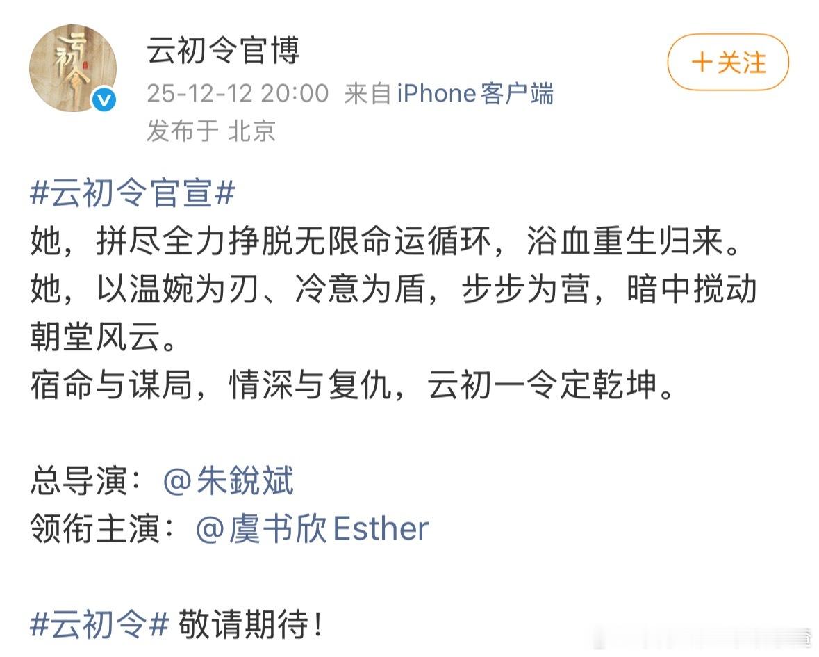 云初令官宣虞书欣总导演:朱锐斌
