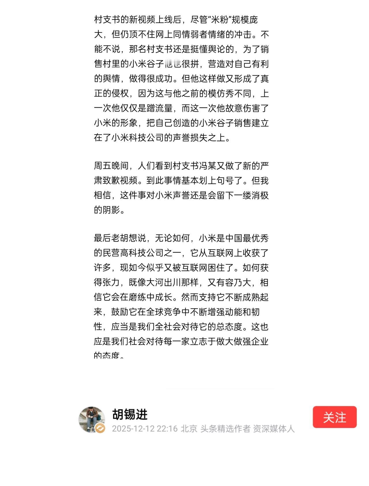胡锡进发文称,村支书冯某已经道歉了,这件事可以画上句号了。此外,老胡认为小米是一个优秀的企业,并希望小米胸襟广阔,通过不断磨练自己,让企业的韧性更强。 这件事情也给很多网友带来了思考,即遇到网络的一些事情时,先不要盲目听从一方的结论,要先思考一下,看看他是不是在博取流量。就像有的网友说,很多网络的事情,一直在反转,反转。 这位村支书冯某刚开始的一番说辞,的确是让广大网友都同情他。很多人以为他只是在帮老百姓卖小米,结果还被投诉。等事情进一步发酵时,大家才知道他说的与真实情况不是一回事。 像这种网络反转的事情还有很多,不过好就好在一种舆论环境:现在大家都不会都有自己的思考,用一句老话说,就是不会让别人牵着牛鼻子走了。 对于小米,也希望他能做好自己的产品服务,让消费者越来越满意。