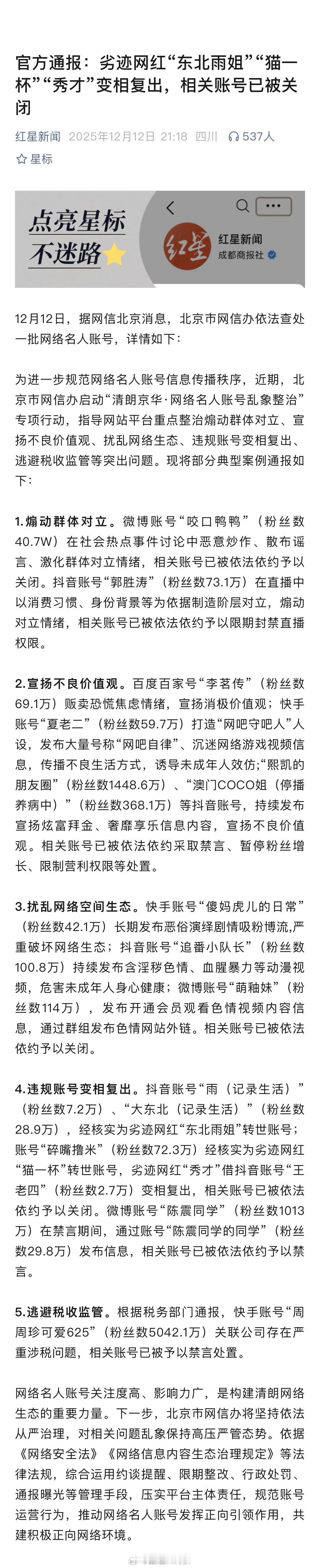 劣迹网红“东北雨姐”“猫一杯”“秀才”变相复出,相关账号已被关闭。通报里提了陈震