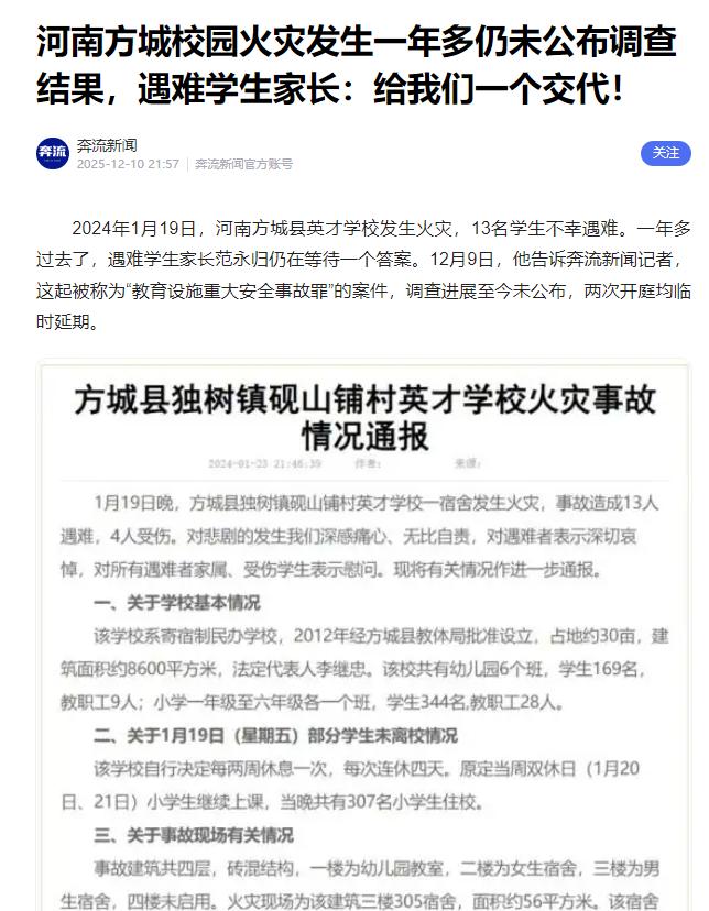 13个宝贝,遗体还在各自床上,保持躺睡状态……看到这个新闻,我的眼泪一下就下来了。尽管不认识这些孩子,但作为两个孩子的妈妈,我好心疼这些孩子,疼到哭了好一会止不住,把家里人都吓到了。 搜索了下事件详情。 原来这事发生在去年年初,2024年1月19日深夜11点,河南南阳方城119指挥中心接到报警,独树镇英才学校宿舍发生火灾,半小时后,火被扑灭,然而该校三年级男生宿舍,13个孩子已经遇难。 这是个私立学校小学,火灾发生在周末,但孩子们没有放假,也没有回家。学校是封闭式管理,有师生1200多人。孩子们多是周边村里的,离家比较远,上下学不方便,所以寄宿在学校。 发生火灾的宿舍,住了32个男生,非常拥挤。 遇难的13个孩子,平均年龄只有9岁!最后被发现的时候,还处于躺睡的姿势,是被眼呛到昏迷,失去了逃生能力,还是什么原因,还不知道。 此事再次被关注, 是因为过去将近两年了,事故原因还没有公布,而且当时解决问题的方式惹出了争议。 原来,在宝贝们的爸爸妈妈,痛的撕心裂肺,想去孩子一眼的时候,却被一张冰冷无情的协议拦住,签了就给看,不签连看一眼孩子都不让。而且协议上还说,只要签了字,拿了赔偿,就不能再去主张任何权利,不诉不访,而且必须对协议保密,否则乙方承担一切责任。 无法想象当时孩子的家长们,心情是怎样的。孩子们躺在冰冷的殡仪馆,他们却连看一眼都不能。本应该被安慰,本应该祈求他们的原谅(尽管这不太可能),但万万不该在此时,用一纸协议去威胁。 事故过去了六百多天, 仍然没有公布调查结果,遇难学生(图三)小南(化名)的爸爸范永归说,“感觉孩子一直在提醒我,要给他一个公道。”今年年底,两次开庭,又被通知延期,据说是“收到了新的证据。” 希望早日公布调查结果。 严肃处理相关责任人,还孩子们一个公道。真的是太心疼这些孩子了! 新闻来源:新华社、新京报、奔流新闻等
