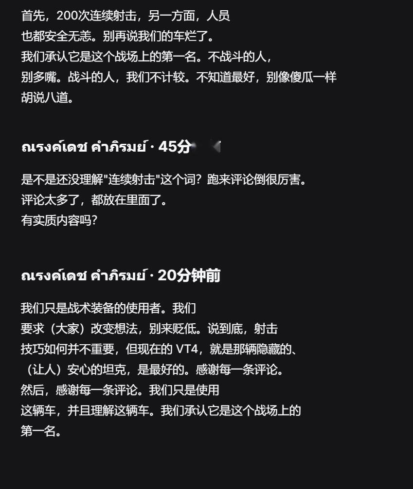 🔻泰军 VT-4 坦克手评价损失掉的这辆 VT-4:“但现在的 VT4,就是那辆隐藏的、(让人)安心的坦克,是最好的。感谢每一条评论。我们只是使用这辆车,并且理解这辆车。我们承认它是这个战场上的第一名。”海外新鲜事 热点现场