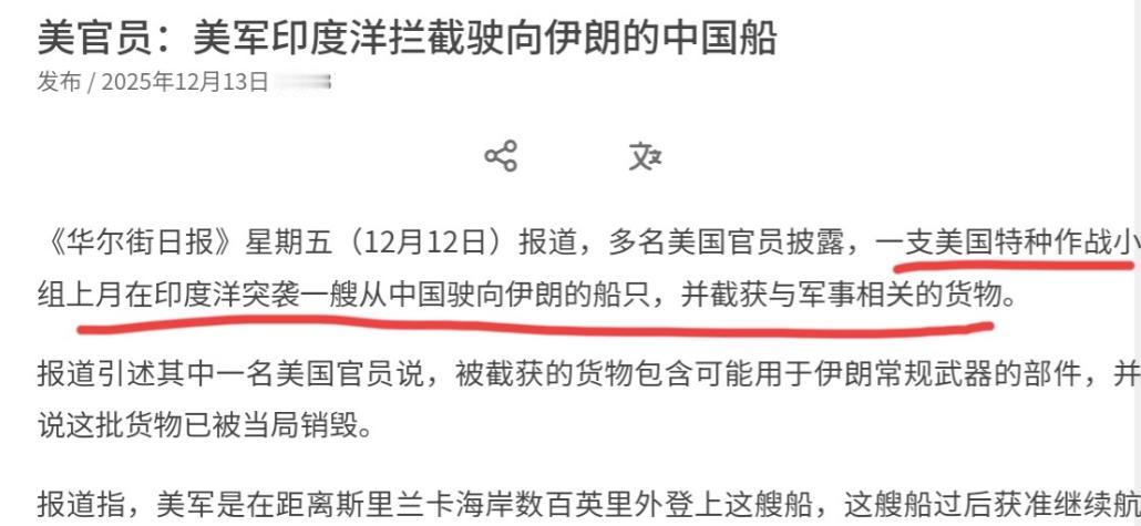这是装都不装了!一艘从中国开往伊朗的船只,在印度洋遭美国特种作战小组突袭,截获与军事相关的货物。《华尔街日报》报道,多名美国官员披露,此事发生在上月,被截获货物包含可能用于伊朗常规武器的部件,这批货物已被销毁。 这不就是 1993 年银河号事件的翻版吗?当年美国污蔑银河号载有化学武器原料,扣船搜了 21 天啥也没找到,现在换汤不换药,又拿 “军事货物” 当幌子,在公海随意登检他国船只。 回顾下当年的银河号事件,1993 年中国远洋货轮银河号正正常常航行,美国突然跳出来说船上有化学武器原料,强行要求登船检查。当时中国海军实力还不够,没法远洋护航,银河号被堵在波斯湾 21 天,船员断水断粮,最后美国联合沙特登船搜查,结果啥违禁品都没找到,最后连句正经道歉都没有。 32 年过去了,中国早已不是当年的中国,但美国的霸权嘴脸一点没变,这次直接派特种部队突袭,动作比当年还嚣张 根据《联合国海洋法公约》,公海上的船只只有涉嫌海盗、奴隶贩卖、无国籍这些特定情况,军舰才能登临检查,而且必须有实打实的证据,还得按程序来。 美国这次呢?既不是船旗国,也没有联合国授权,就凭着自己的官员嘴说 “有军事货物”,就派特种部队登船,这跟海盗拦路抢劫有啥区别?