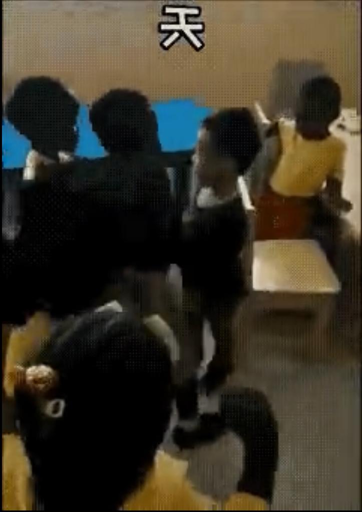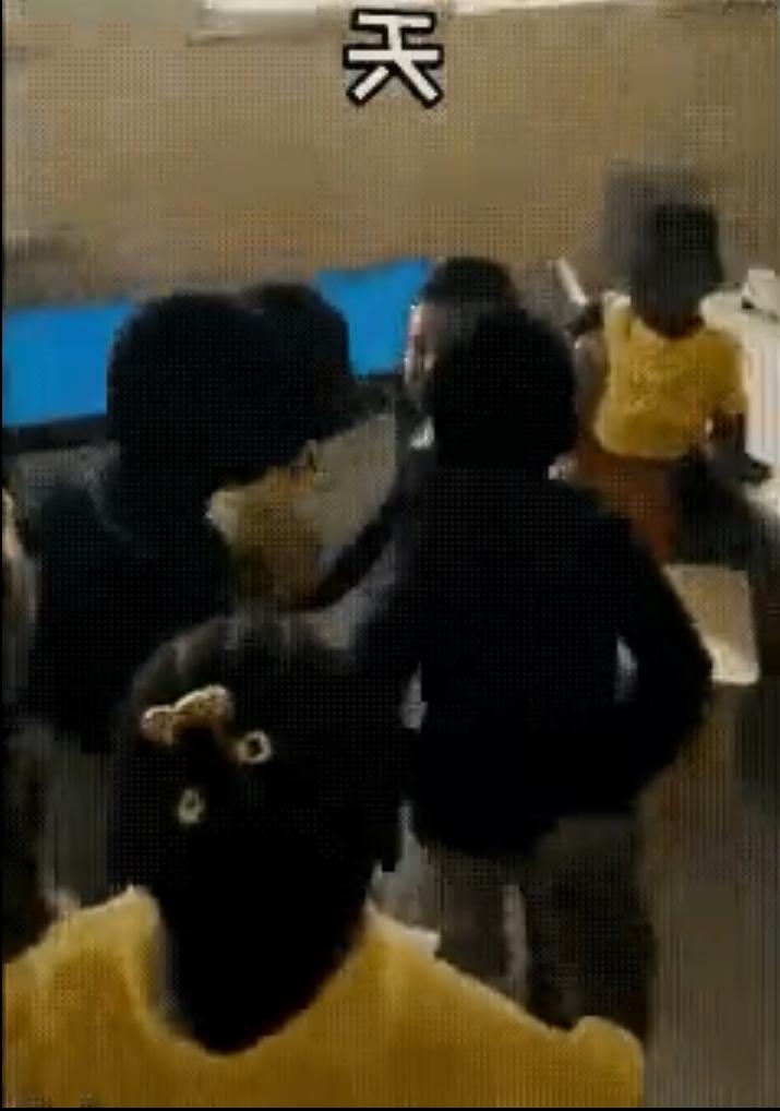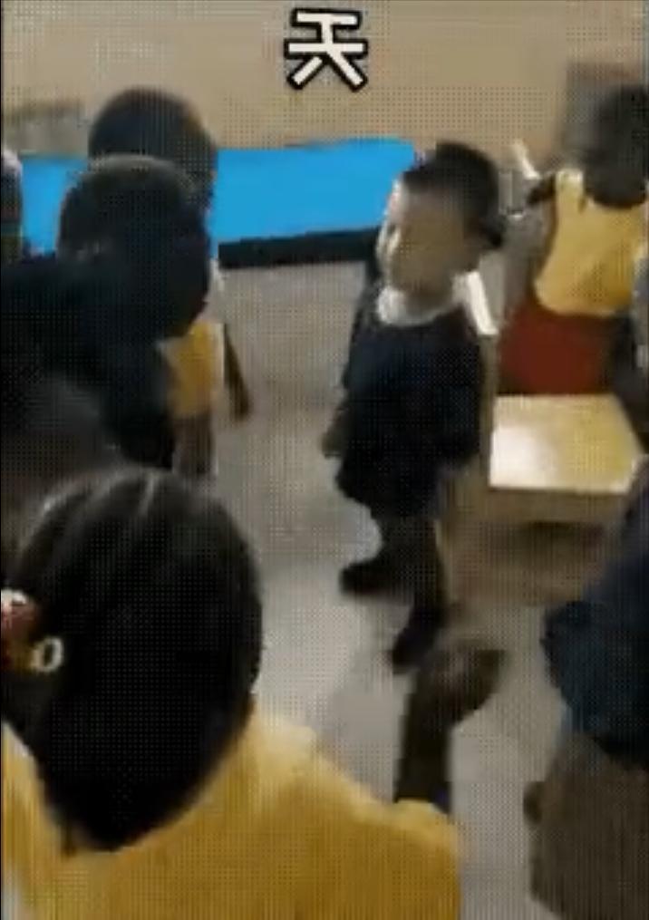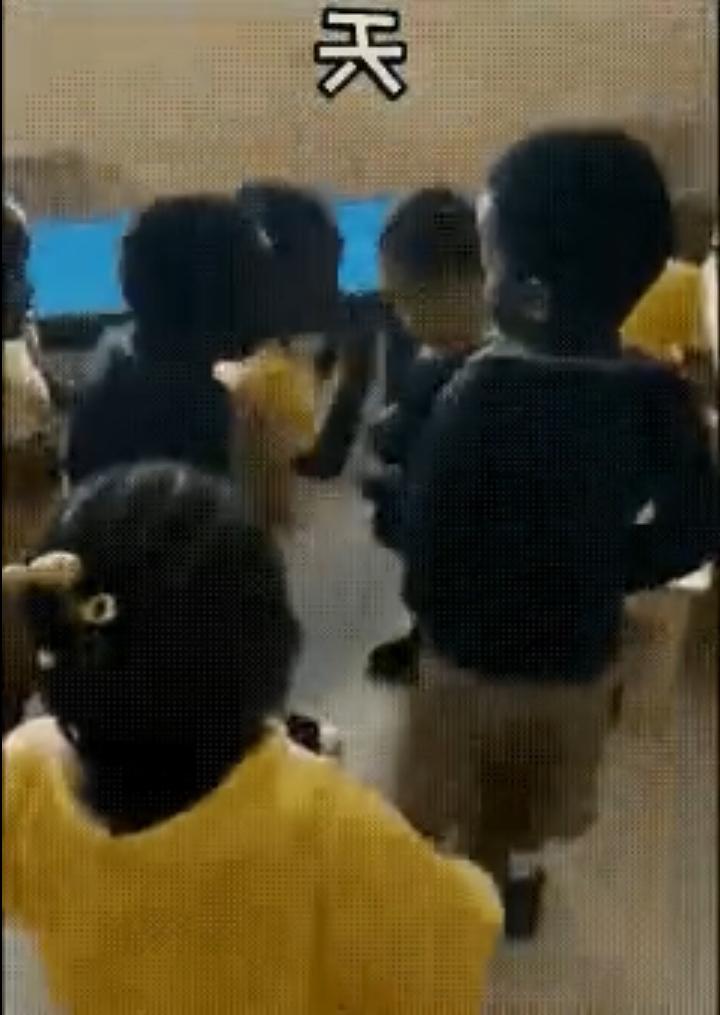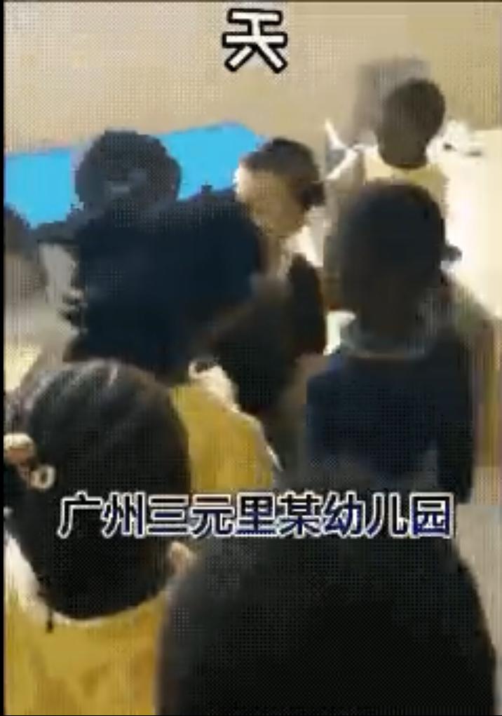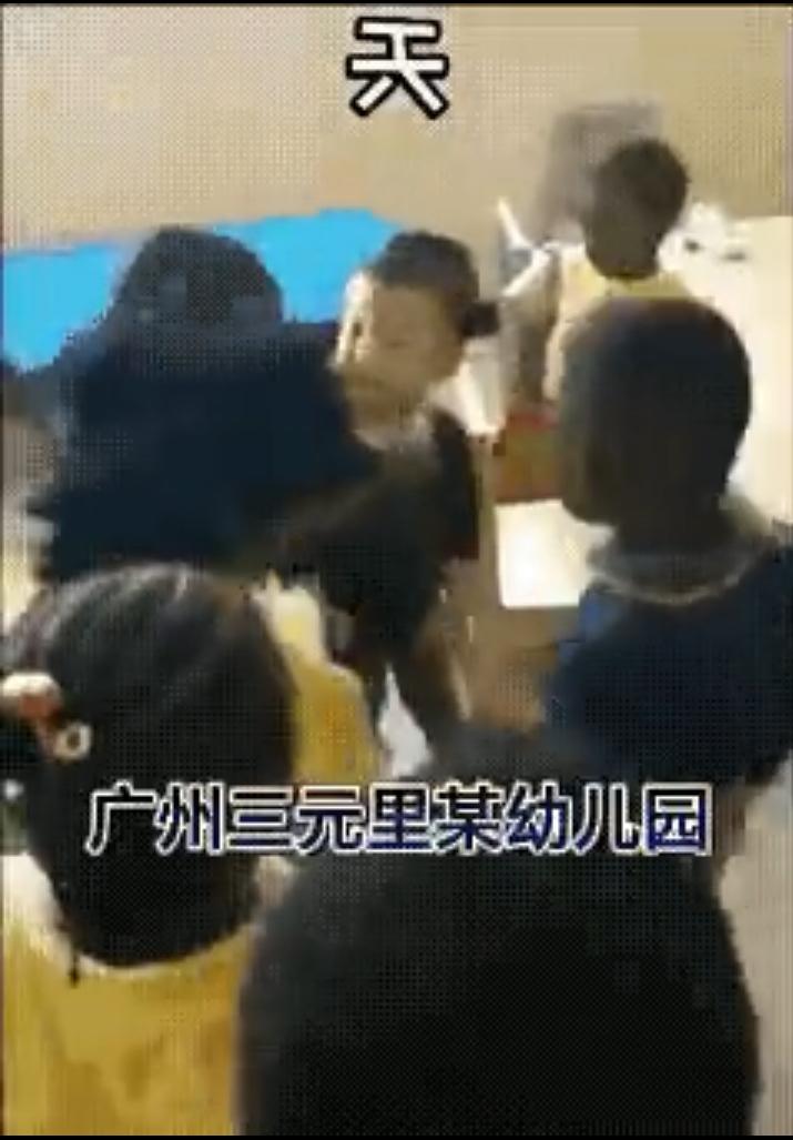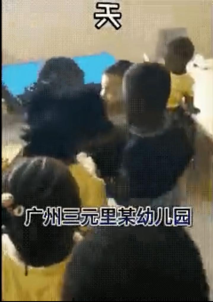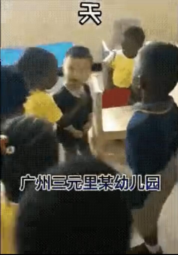 这是中国广州三元里的某幼儿园,只见一个黄皮肤的小孩周围全是黑人小孩,这些黑人小孩围绕在中国小孩旁边嬉闹玩耍,这个中国小孩可能怀疑这不是在自己的国家,而是在非洲的某地,自己成了那个异类。