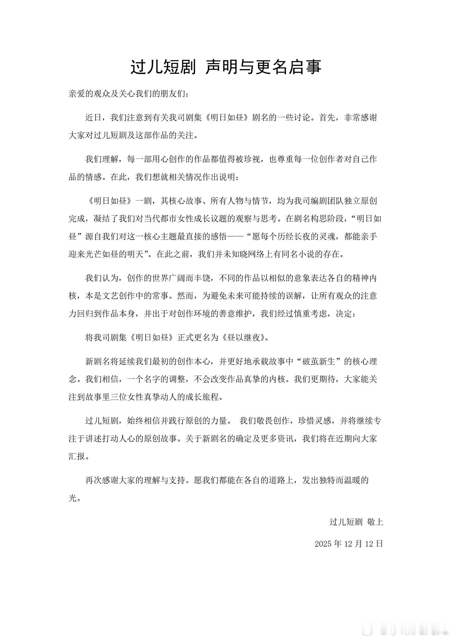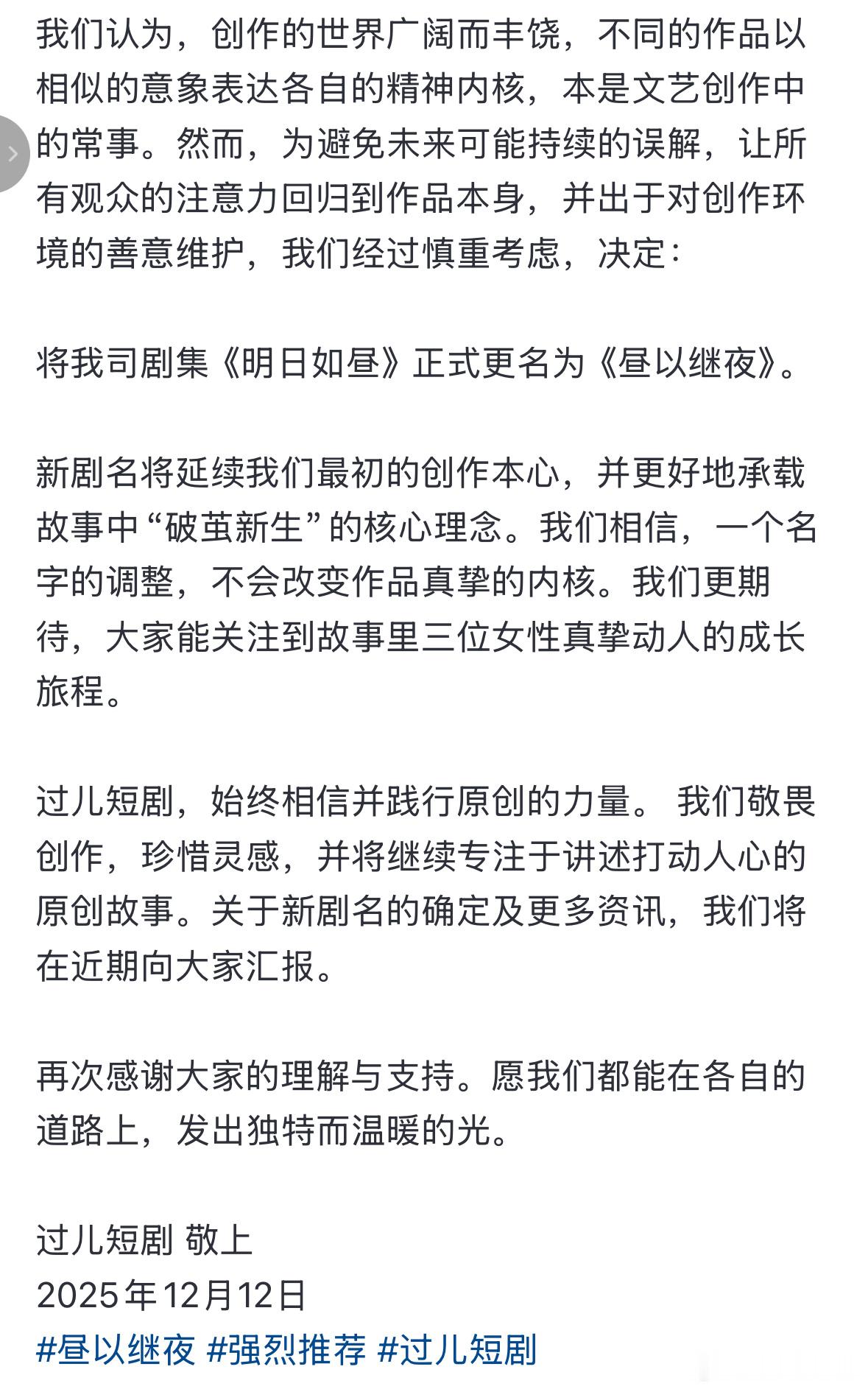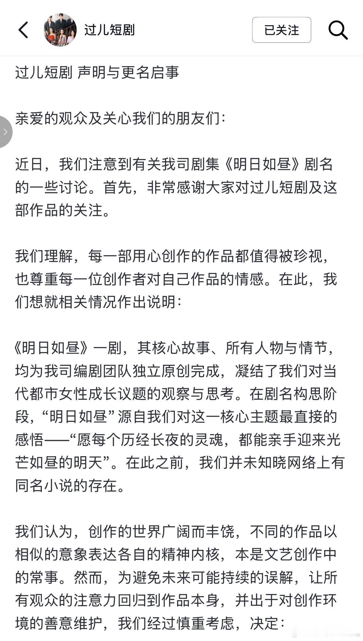 被作者随侯珠声明维权后,过儿短剧把新剧《明日如昼》名字改成《昼以继夜》了……