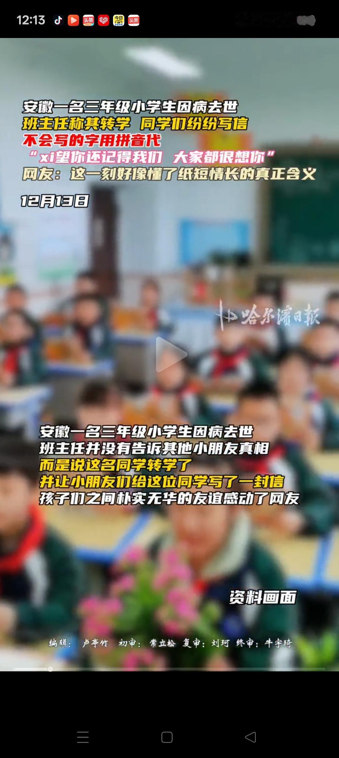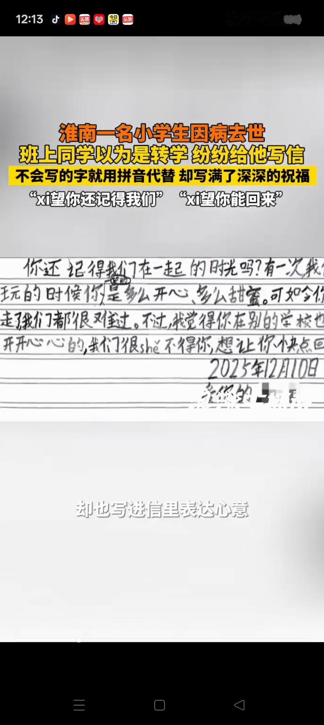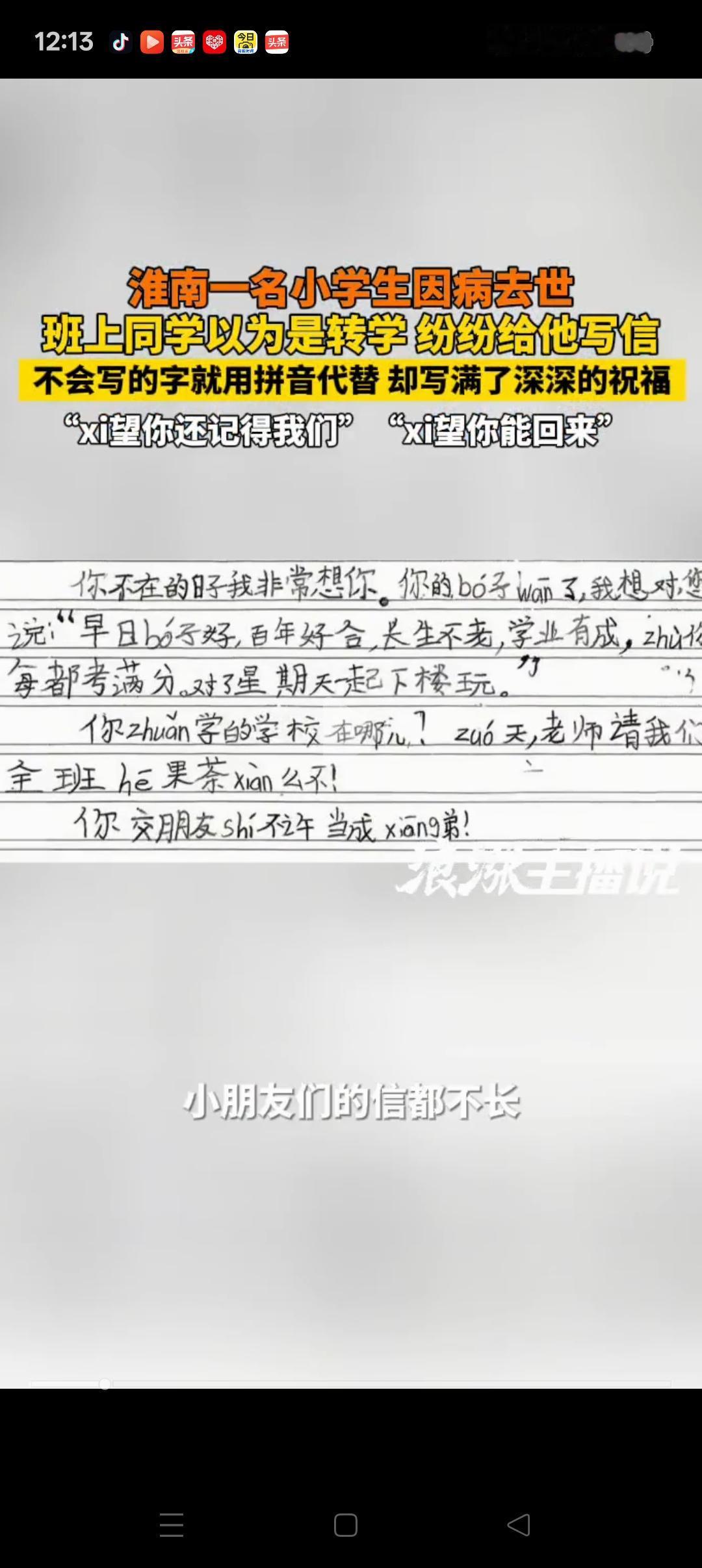 看哭了[流泪]!淮南一三年级小学生因病去世,班主任不忍心告诉同学们,而是说她生病了,不得不转学,让大家可以给她写封信。 小朋友们都很关心她,纷纷给她写信,塞满了整个书包,让老师一定要交给她。 有的小朋友给她送卡通橡皮,让老师转交给她。 还有的给她送卡片,献上自己的祝福,希望她早点回来 还有的哭着对老师说:让老师告诉她,他想她了,希望她早点回来。 是啊,学生们的友谊都是很单纯的。记得高中的时候,我的一个好朋友也是意外走了,那段时间可伤心了。直到现在,我有时间也会去他的坟前跟他聊会天。 所幸孩子的爸爸说:孩子走的时候没有痛苦,是在妈妈的怀里走的,她是幸福的,还带着微笑[祈祷][祈祷]