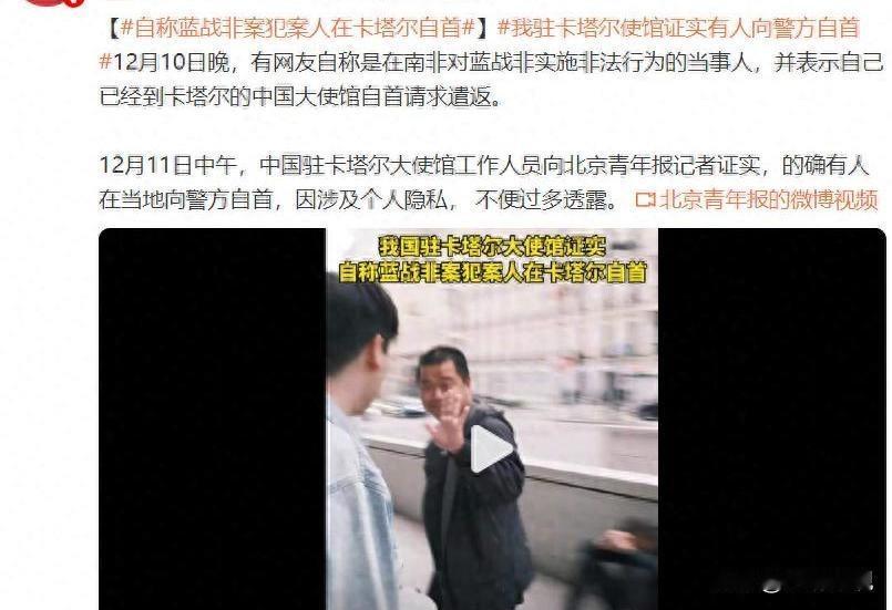 自称南非案当事人跑到卡塔尔自首,反转还是实锤? 12月10日晚,一网友称自己在南非对蓝战非做了非法事,已到卡塔尔中国大使馆自首,求遣返。12月11日中午,使馆工作人员回应,确有人在卡塔尔向警方自首,因个人隐私不便多说。时间线清晰,10日晚发声,11日中午确认。地点跨南非、卡塔尔,信息割裂,争议升级。自首是动作,不是结论。是否就是视频里那人,是否与蓝战非事件直接相关,还得警方查。遣返也不是一句话,程序跑完才有结果。网传细节多,真伪混杂,别拿猜测当证据。别急,先看权威通报。我的判断,别被流量牵着走,依法办事才稳。