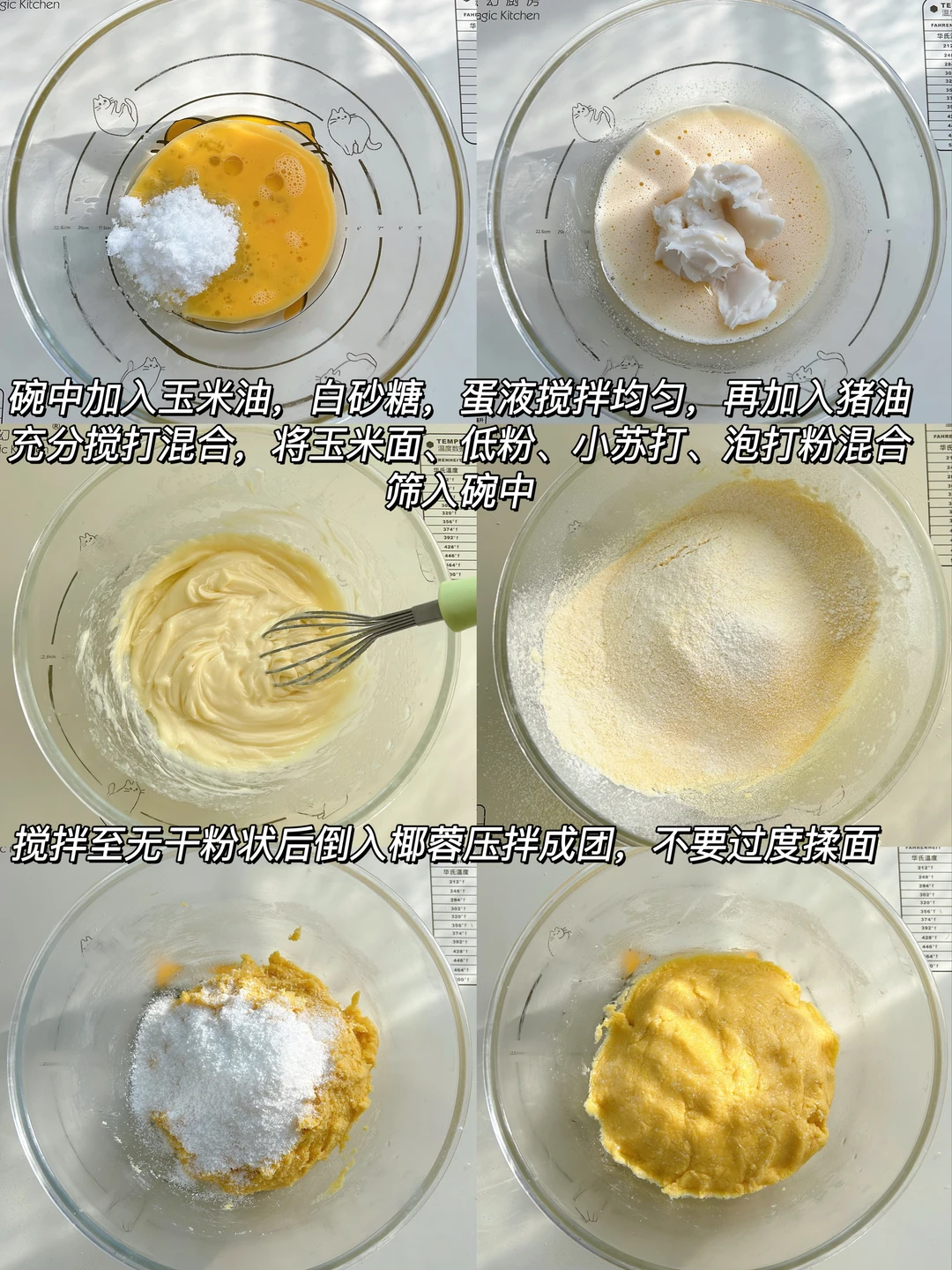 ✅食材:低粉135克,玉米面125克,玉米油40克,糖粉60克,全蛋液60克,猪油100克,小苏打3克,无铝泡打粉5克,椰蓉20克