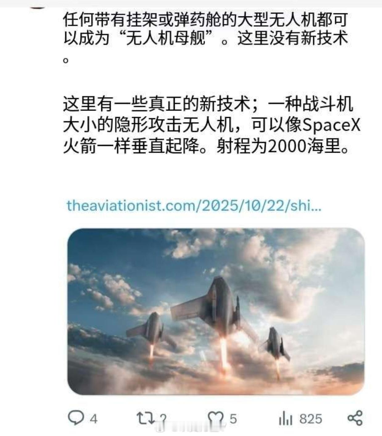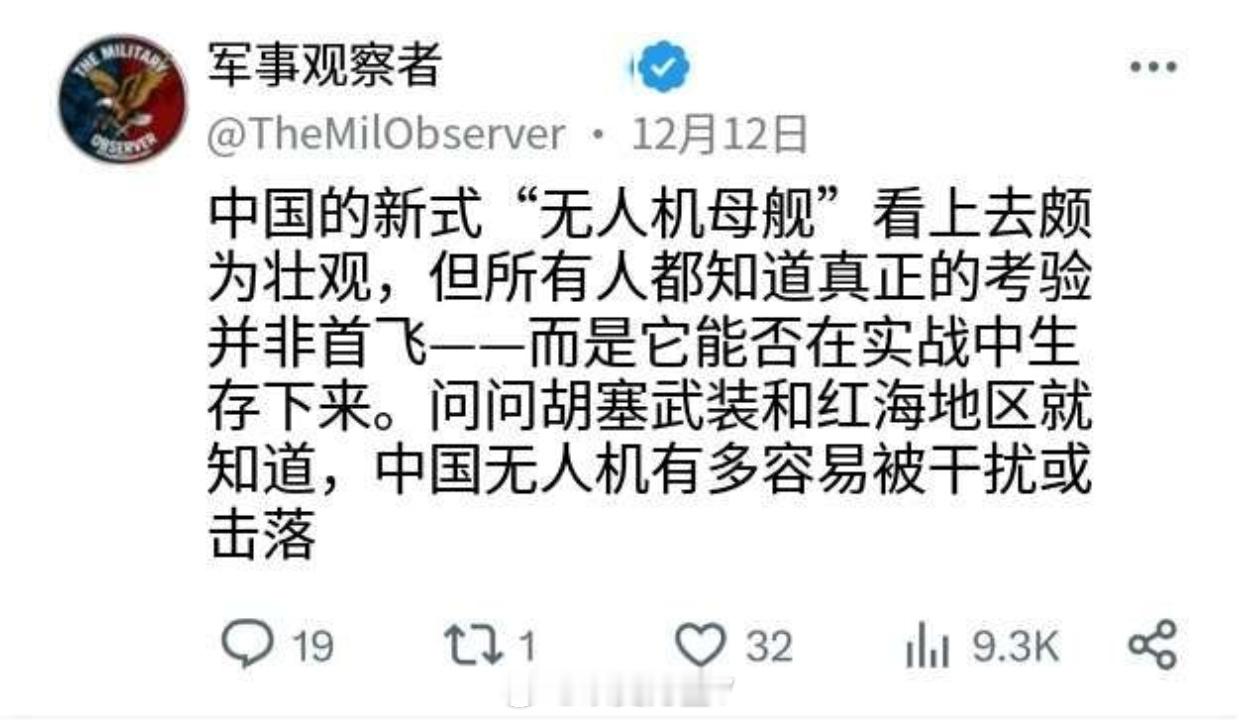 中国“九天”无人机母舰首飞了,国外对此还是很关注的。评论区有赞叹中国无人机技术的,有吐槽美国的,还有老生常谈说中国无人机技术不行的……真要是发生冲突,建议对方想想头顶上随时有一个能携带超过100架无人机及炸弹的家伙,还能携带空空导弹/反舰导弹……就问你怕不怕