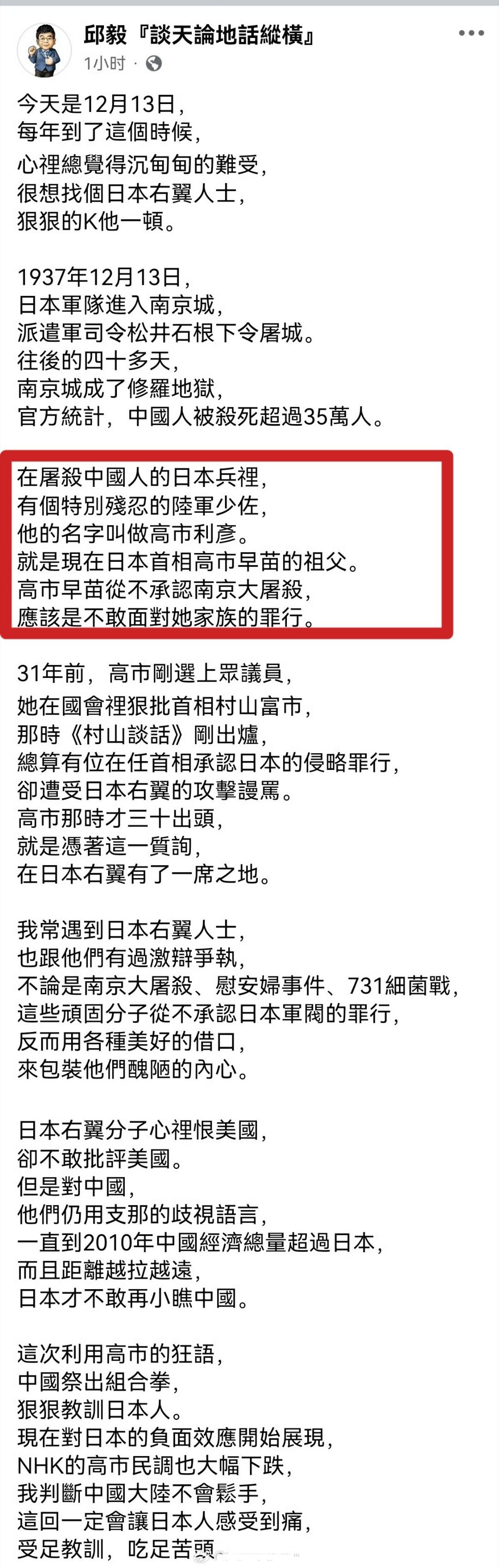 高市早苗的祖父手上沾满了南京人的鲜血!南京大屠杀死难者国家公祭日以国之名悼我同胞热点观点 邱毅:在屠杀中国人的日本兵里,有个特别残忍的陆军少佐,他的名字叫做高市利彦。就是现在日本首相高市早苗的祖父。高市早苗从不承认南京大屠杀,应该是不敢面对她家族的罪行。
