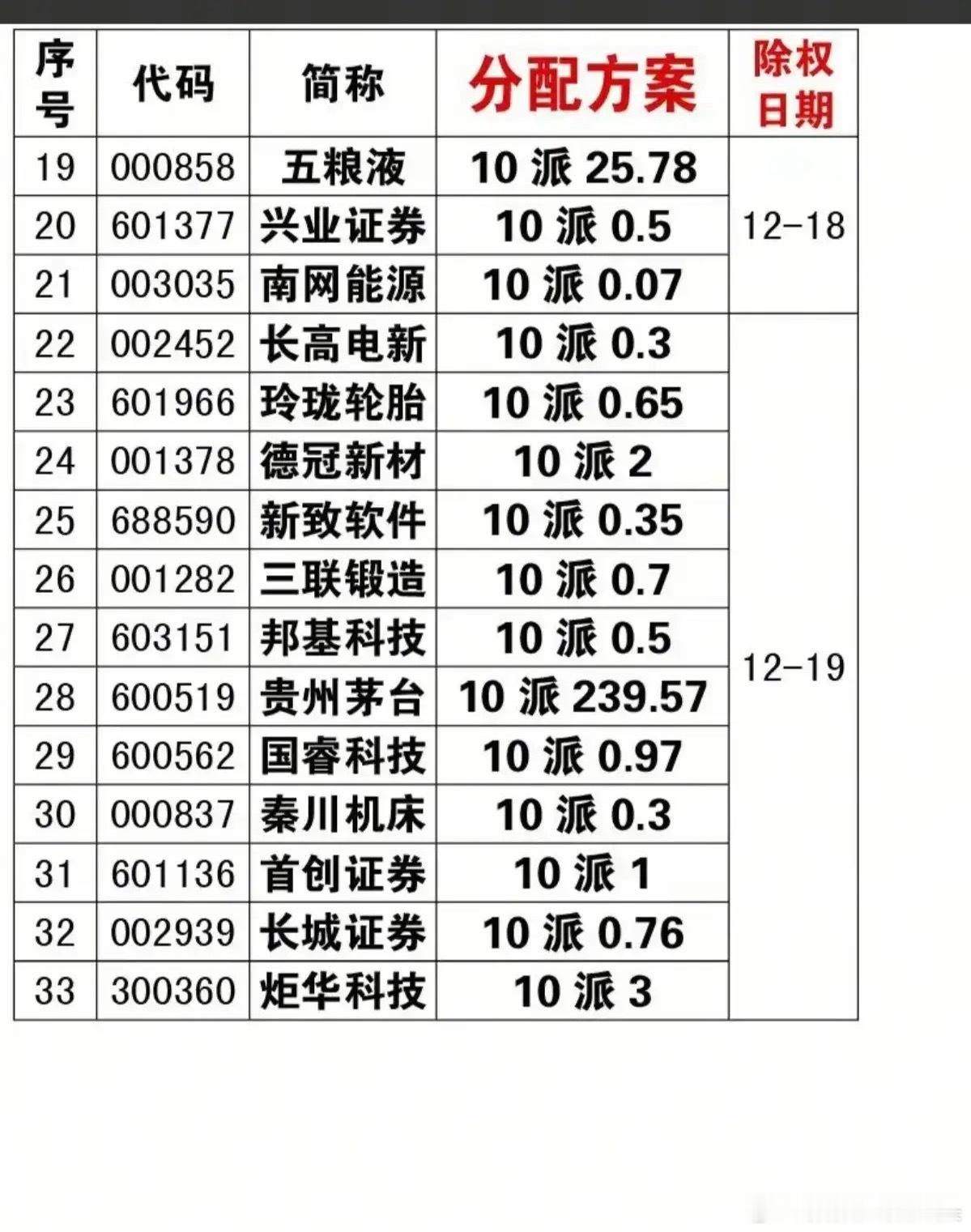 下周分红公司(部分)板块分析及个股解读一、板块综合分析此次分红公司覆盖银行、消费(白酒、乳业、啤酒)、制造、证券、新能源等多板块,分红力度呈现显著行业差异:白酒龙头贵州茅台、五粮液分红额居绝对首位,银行股分红保持稳健风格,消费类企业如伊利股份、重庆啤酒分红兼具稳定性与成长性,制造业、科技类企业分红金额普遍偏低,整体反映出不同行业盈利规模、盈利稳定性对分红策略的直接影响。二、重点分红个股解读1. 贵州茅台白酒龙头,推出10派239.57元的超高分红方案,分红规模居所有公司首位。依托高端白酒的高盈利与高现金流,持续保持高分红比例,是A股分红标杆企业,彰显业绩稳定性。2. 五粮液次高端白酒龙头,分红方案为10派25.78元,分红力度仅次于贵州茅台。公司盈利规模与现金流充裕,分红比例保持行业较高水平,体现白酒行业的盈利优势。3. 工商银行国有大行龙头,分红方案10派1.414元,银行板块分红代表企业。依托庞大的资产规模与稳定的息差收入,常年保持稳健分红,是低风险投资者的核心配置标的。4. 农业银行国有大行,分红方案10派1.195元,与工商银行分红策略一致。深耕县域与农村金融市场,盈利稳定性强,分红率长期保持在合理区间,股息率具备吸引力。5. 重庆啤酒啤酒行业龙头,分红方案10派13元,消费板块分红力度突出。依托高端啤酒产品升级实现盈利增长,现金流改善推动分红比例提升,体现消费升级的业绩红利。6. 伊利股份乳业龙头,分红方案10派4.8元,乳业板块分红代表。作为民生消费企业,盈利规模与现金流稳定,常年保持持续分红,彰显消费行业的盈利韧性。7. 中国中免免税行业龙头,分红方案10派2.5元,免税消费板块核心标的。依托免税渠道优势实现盈利增长,分红比例随业绩波动调整,反映消费复苏对企业分红的支撑。8. 宁波银行城商行龙头,分红方案10派3元,城商行中分红力度靠前。聚焦长三角区域信贷市场,盈利增速与资产质量双优,分红比例高于多数同业,体现城商行的成长优势。9. 圣农发展白羽鸡养殖龙头,分红方案10派3元,养殖板块分红代表。依托养殖规模化与产业链一体化,盈利改善后提升分红比例,反映农业板块的业绩弹性。10. 兴业证券券商板块标的,分红方案10派0.5元,证券行业分红体现。券商盈利受市场行情影响较大,分红比例相对保守,反映行业业绩的周期性特征。11. 炬华科技电力设备企业,分红方案10派3元,科技制造板块分红亮点。聚焦智能电表与电力物联网业务,盈利稳定后提升分红,体现细分制造领域的盈利改善。12. 龙佰集团钛白粉龙头,分红方案10派1元,化工板块分红代表。依托钛白粉行业周期复苏实现盈利,分红比例随行业景气度调整,反映周期行业的分红特征。13. 金明精机塑料机械企业,分红方案10派0.2元,制造业分红偏低标的。行业竞争激烈导致盈利规模有限,分红金额较低,反映中小制造企业的盈利现状。14. 南网能源新能源运营企业,分红方案10派0.07元,新能源板块分红代表。处于业务扩张期,利润更多用于项目投资,分红比例较低,体现成长型企业的分红策略。三、总结此次分红公司的分红表现与行业属性、企业发展阶段高度绑定:白酒龙头凭借高盈利展现超强分红能力,银行股以稳健分红成为低风险配置核心,消费类企业分红随业绩复苏逐步提升,而制造业、新能源等成长型板块因盈利规模或扩张需求,分红力度普遍偏低。投资者可结合行业景气度、企业盈利稳定性与股息率,筛选兼具分红价值与成长潜力的标的。本文涉及资讯、数据等内容来自网络公共信息,仅供参考,不构成投资建议!