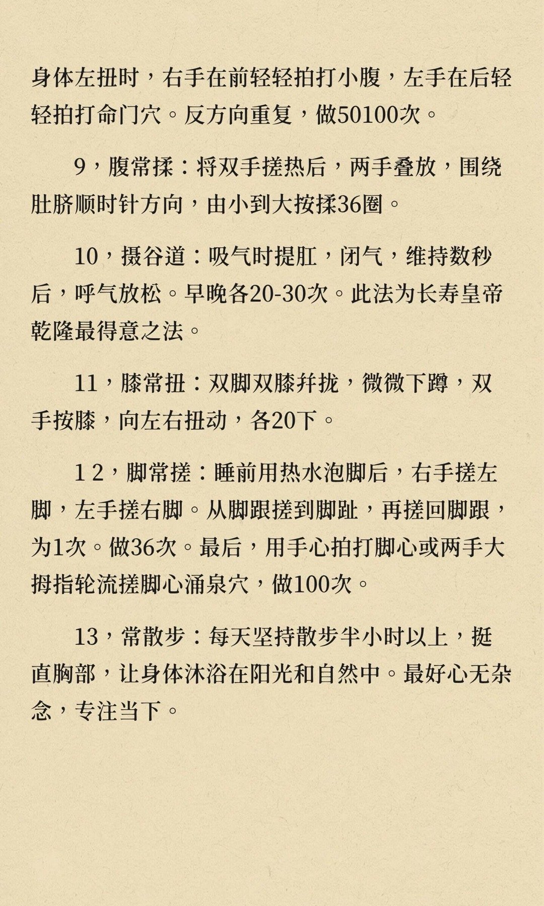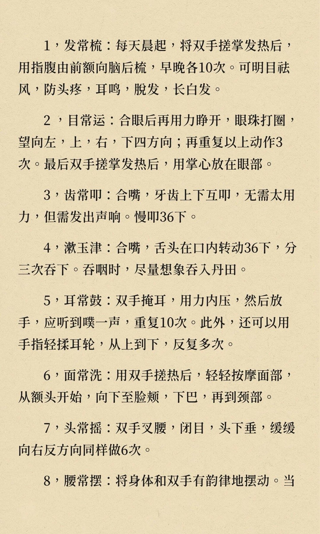 孙思邈养生十三法,保持年轻很容易孙思邈的"养生十三法"通过梳头、运目、叩齿、漱津、鼓耳、洗脸、摇头、摆腰、揉腹、提肛、扭膝、搓脚和散步等动作,疏通经络、调节气血,预防慢性病,延年益寿,尤其适合现代人日常保健。健康养生