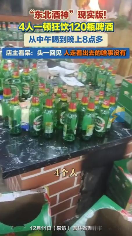 “强得可怕!”12月9日,吉林,4名男子在饭店聚餐时,一共要了12箱啤酒,平均每人喝了30瓶,结果喝完后各个都跟没事人一样,悠闲的走出了饭店!老板表示开饭店这么多年,也是要第一次遇到。网友:水里掺酒了? “这得喝多少酒才能做到啊?”四个男子在聚餐时,光啤酒就喝了12箱!结果他们居然还一副没事人的样子,轻松地走出了饭店。 按理说,正常人喝完这么多酒,至少应该表现出一些醉态,哪怕脸红或者走路有些晃动,可这四个人却毫无异状,喝完后走出饭店时,仍然悠闲自得,好像根本没有受到任何影响。 这一事件被网友曝光后,引发了热议。大家纷纷猜测,这四个人究竟是什么样的“铁人”?有人戏言,“水里掺酒了吧”。还有一些网友表示,“大概是老喝家了,喝多少都不醉。” 实际上,酒量好的人确实能在短时间内喝下很多酒,甚至可以保持清醒的状态。这些人可能拥有更强的酒精耐受力,也就是他们的身体对酒精的吸收和反应比普通人更慢,或者他们的大脑和神经系统对酒精的抑制反应不明显。 这种现象并不少见,常年饮酒的人,特别是那些所谓的“酒鬼”,他们的身体在长期的酒精刺激下,已经适应了大量的酒精摄入,甚至可以在看似超乎常理的情况下保持清醒状态。酒精对他们的影响可能会被延迟,表现出来的醉酒症状也相对较少。 这类人可能并不常见,但并不是不存在。在一些酒文化盛行的地区,能够喝下大量酒而不醉的人常常被视为“酒量好”的代表。 但无论如何,长期大量饮酒对健康的危害是不可忽视的,即使他们的酒量再好,频繁喝下如此大量的酒,对身体的负担也是巨大的。无论酒量如何,适量饮酒才是健康的生活方式。 信息来源: 闪电新闻丨“东北酒神”现实版!4人一顿狂饮120瓶啤酒 文丨小王 编辑丨史叔