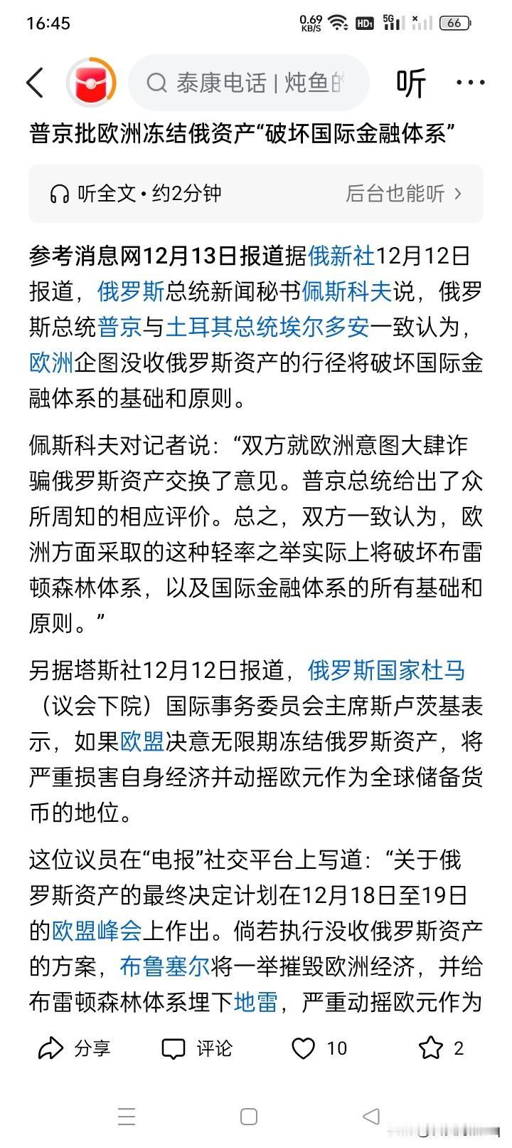 还有什么招? 12月12日,欧盟理事会紧急决定:将冻结俄罗斯的资产似乎无限期进行下去,直到乌克兰战争结束,俄罗斯赔偿乌克兰在战争中的所有损失。乌克兰的战争,目前没有任何结束的迹象,俄罗斯赔偿乌克兰在战争中的全部损失,更是遥遥无踪的事情。这就是说,欧盟冻结俄罗斯的资产,现在根本就不要去想什么时候解冻的问题。同时,欧盟理事会也没有称这是欧盟成员国一致同意作作出来的决定,这说明欧盟似乎已经废弃了一票否决权。 欧盟的做法,实际上很可能也是对美国的回应。因为美国曾经在提出的所谓乌克兰和平协议的28条里,以及美国总统特朗普提出的“战后经济方案”中,都试图将这笔2100亿欧元的庞大资金,纳入自己对乌克兰重建或俄罗斯的投资中。这种现象,无疑让欧盟提高了警惕。欧盟手里冻结的俄罗斯资产,怎么可能心甘情愿让美国作为投资使用? 据俄罗斯总统新闻秘书佩斯科夫声称:俄罗斯总统普京和与他会面的土耳其总统埃尔多安一致认为:欧盟企图没收俄罗斯的资产的行径将破坏国际金融体系的基础和原则。 现在看来,至于俄罗斯以后会不会对欧盟采取别的什么特别让欧盟头痛的措施,只好拭目以待。