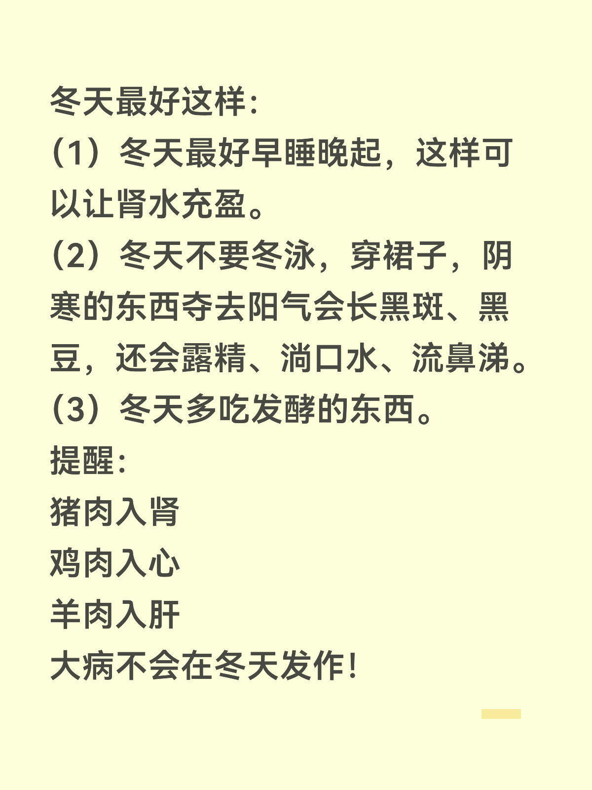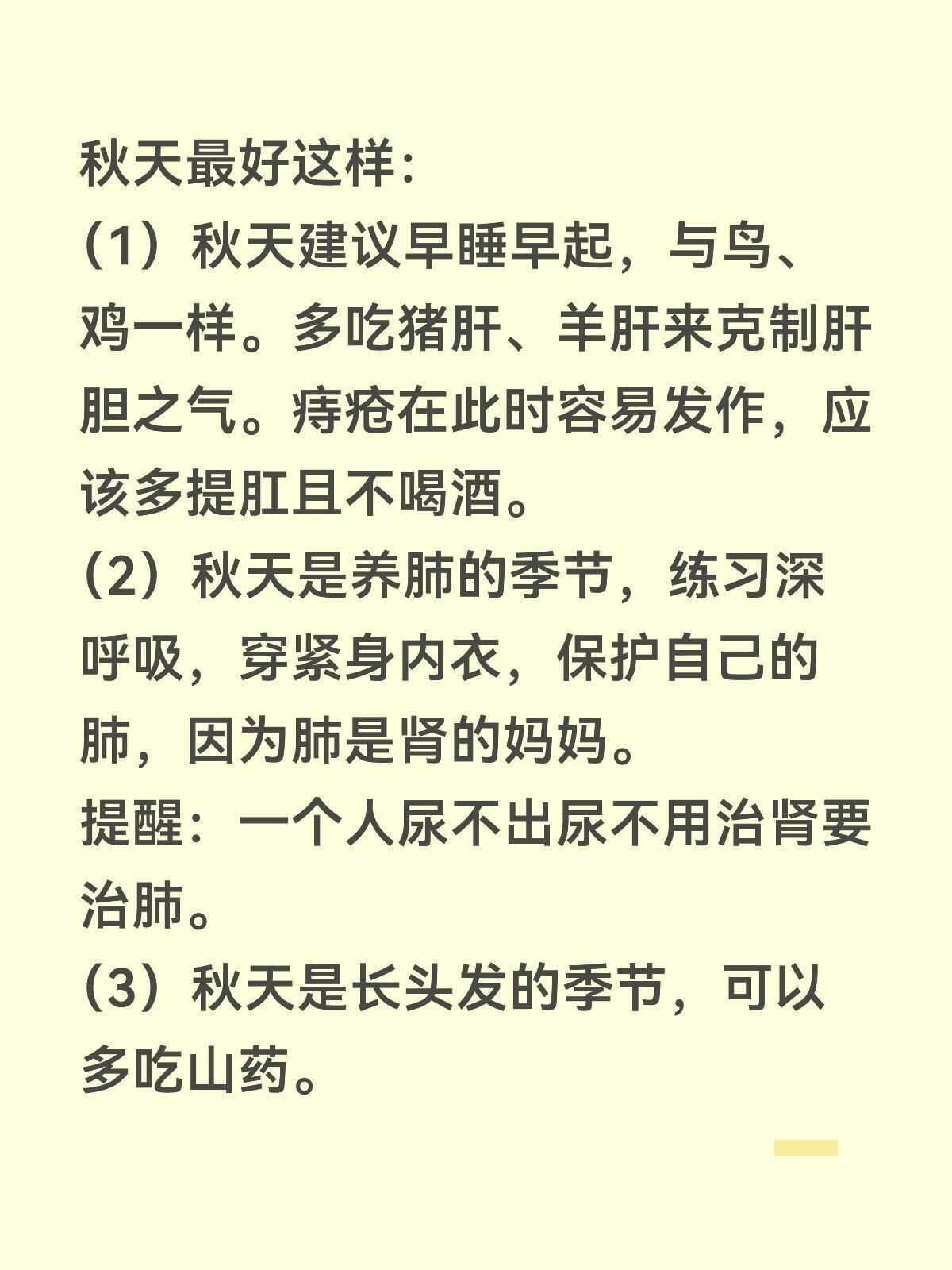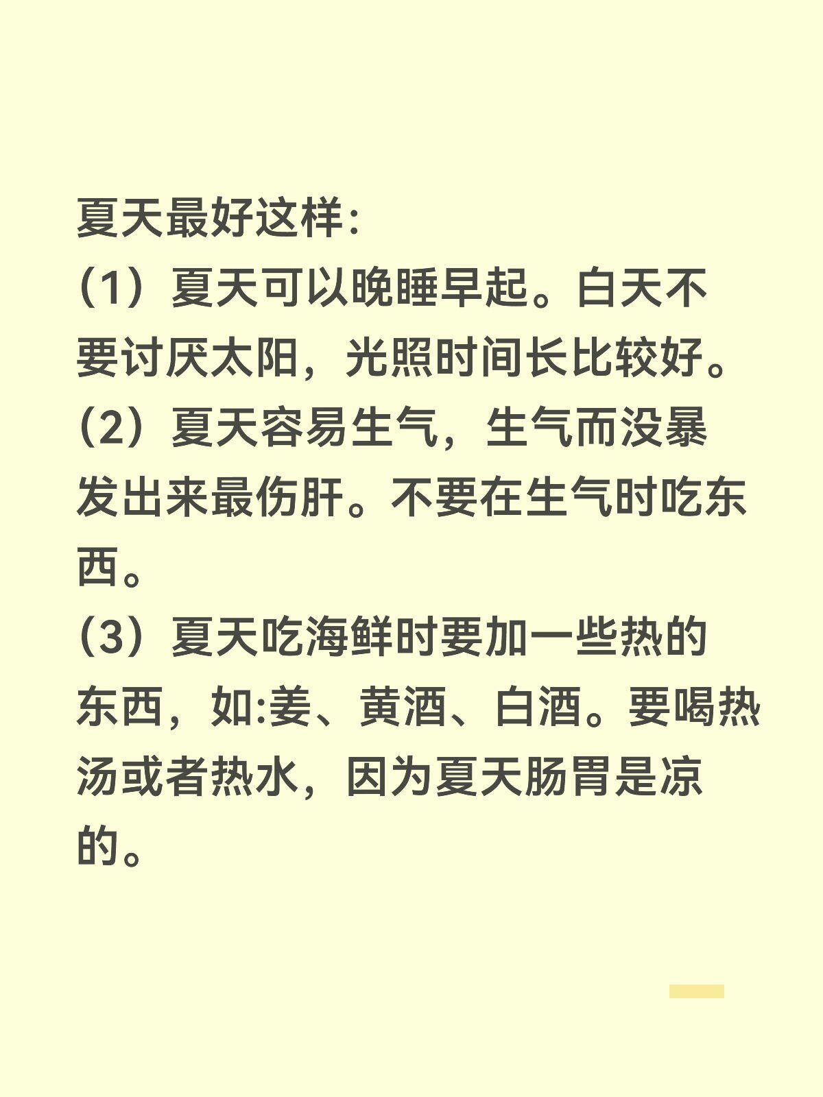 左耳听 右手记四气调神论1春天最好这样:(1)春天,人要大步在户外散步(不是跑),最好把头发散开!形体放松才能让气体运行好。(2)小手术最好选择在春天,因为春天是生发之气时。夏天最好这样:(1) 夏天可以晚睡早起。白天不要讨厌太阳,光照时间长比较好。(2)夏天容易生气,生气而没暴发出来最伤肝。不要在生气时吃东西。(3) 夏天吃海鲜时要加一些热的东西,如:姜、黄酒、白酒。要喝热汤或者热水,因为夏天肠胃是凉的。秋天最好这样:(1)秋天建议早睡早起,与鸟、鸡一样。多吃猪肝、羊肝来克制肝胆之气。痔疮在此时容易发作,应该多提肛且不喝酒。(2) 秋天是养肺的季节,练习深呼吸,穿紧身内衣,保护自己的肺,因为肺是肾的妈妈。提醒:一个人尿不出尿不用治肾要治肺。(3) 秋天是长头发的季节,可以多吃山药。冬天最好这样:(1) 冬天最好早睡晚起,这样可以让肾水充盈。(2)冬天不要冬泳,穿裙子,阴寒的东西夺去阳气会长黑斑、黑豆,还会露精、淌口水、流鼻涕。(3)冬天多吃发酵的东西。提醒:猪肉入肾鸡肉入心羊肉入肝大病不会在冬天发作!健康养生中医养生