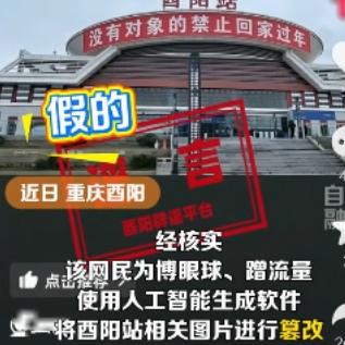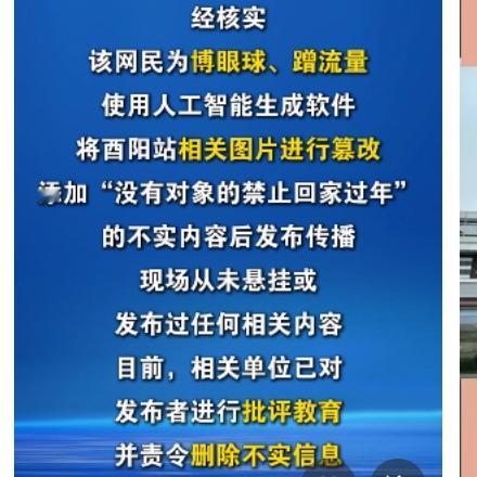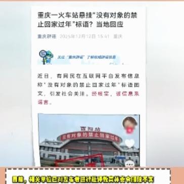 春节返乡季惊现离谱谣言!网传重庆某火车站挂出“没对象禁止回家过年”标语,图片一刷爆全网,瞬间戳中单身网友的心巴,不少人直呼催婚都卷到火车站了,还有人慌了神怕真影响回家团圆。 千万别被带节奏!官方很快下场辟谣,这事儿纯纯是假的。原图其实是重庆酉阳站,有人为了博眼球蹭流量,用AI瞎改图片加不实标语,现场压根没挂过这东西。目前相关部门已经批评教育了发布者,还让他赶紧删了虚假信息,没让谣言继续乱传。 网络不是法外之地,瞎造谣博关注可不是小事,搞不好还得担责任。年底真假消息掺着来,碰到这种离奇内容别瞎转发,先查官方通报辨真假才靠谱,别被假消息搅了过年的好心情。回家过年本来就是跟家人团圆的暖心事儿,哪能靠有没有对象说了算。 你刷到过这条假消息吗?对这种为流量乱造谣的操作,你怎么看?