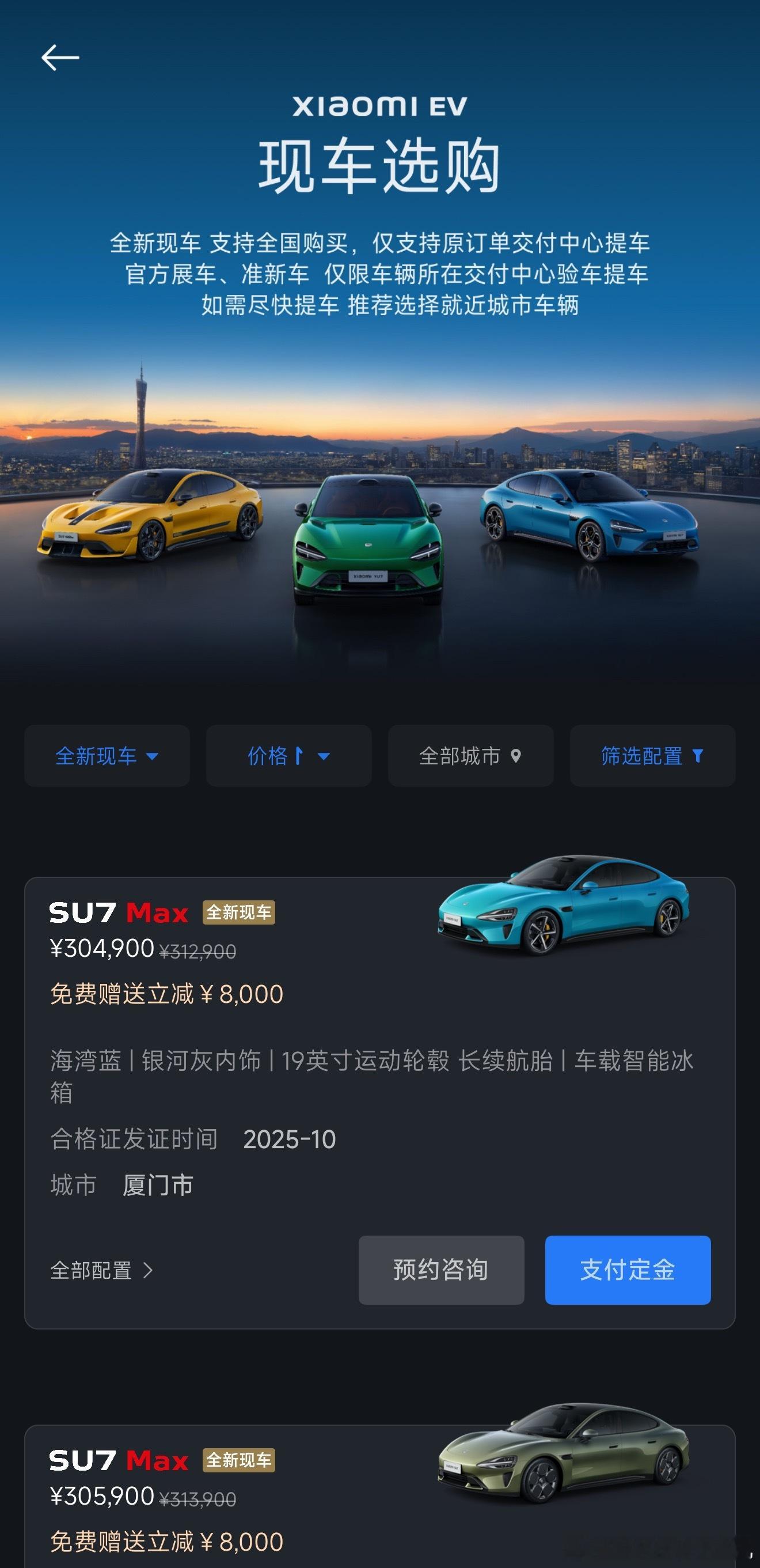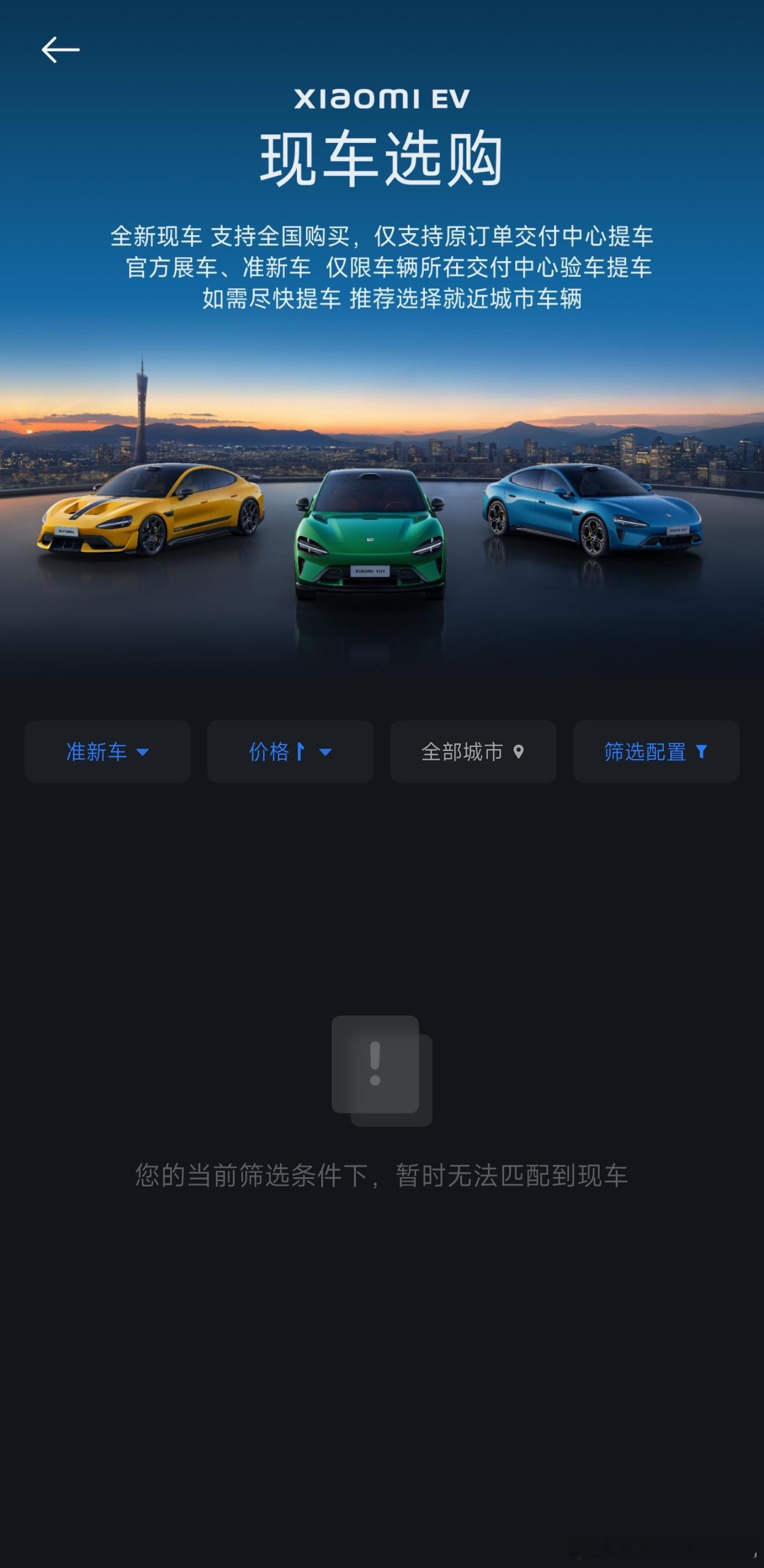 小米汽车前些天推出的现车选购。好像展车和准新车已经售罄了?现在已经没法搜索出车源了