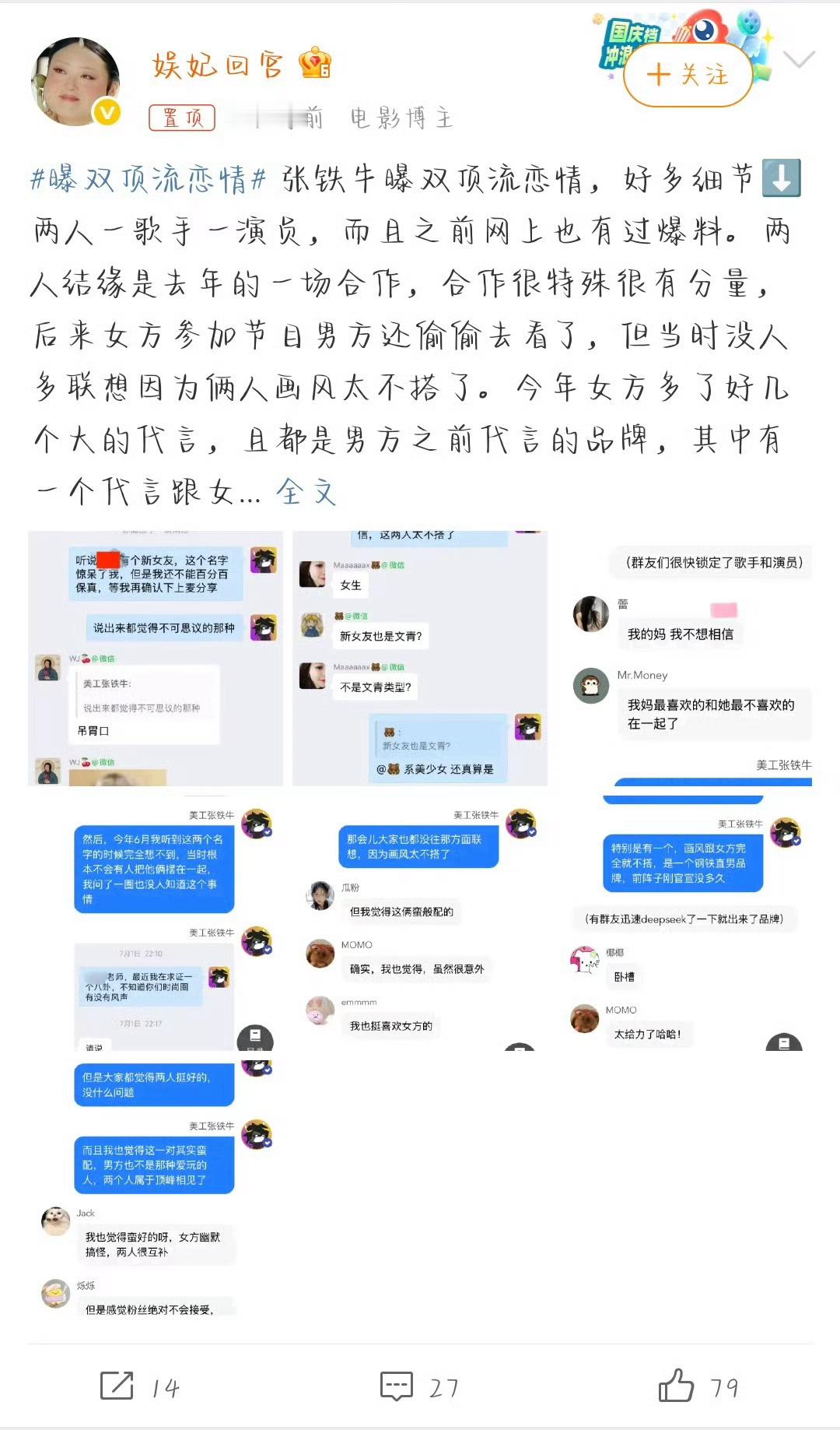 所以一谈到恋情就是顶流,就是各种猜测,所以到底是谁就不能直接说出来吗?今年第几次了,能不能直接说出来。你们觉得是谁?