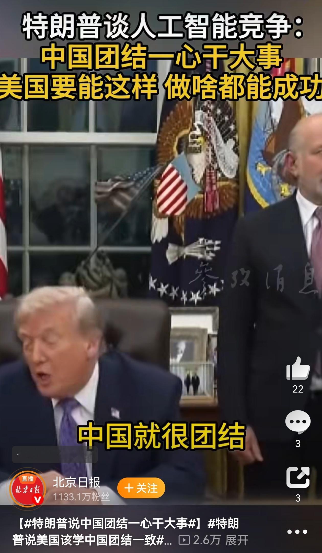 特朗普说中国团结一心干大事,对此特朗普羡慕的不行。美国各州在制定不同的人工智能法律,而特朗普正在忙着阻止。