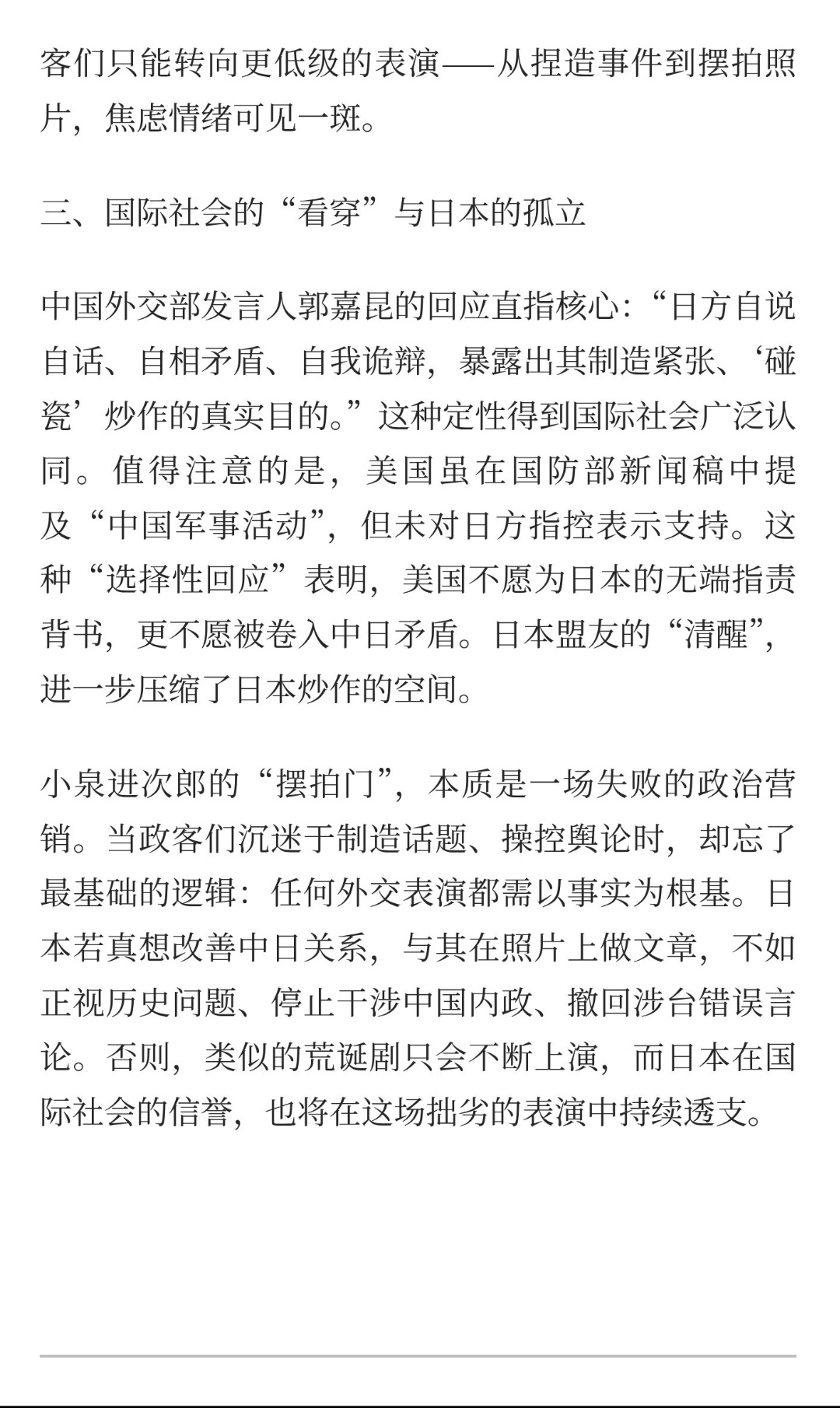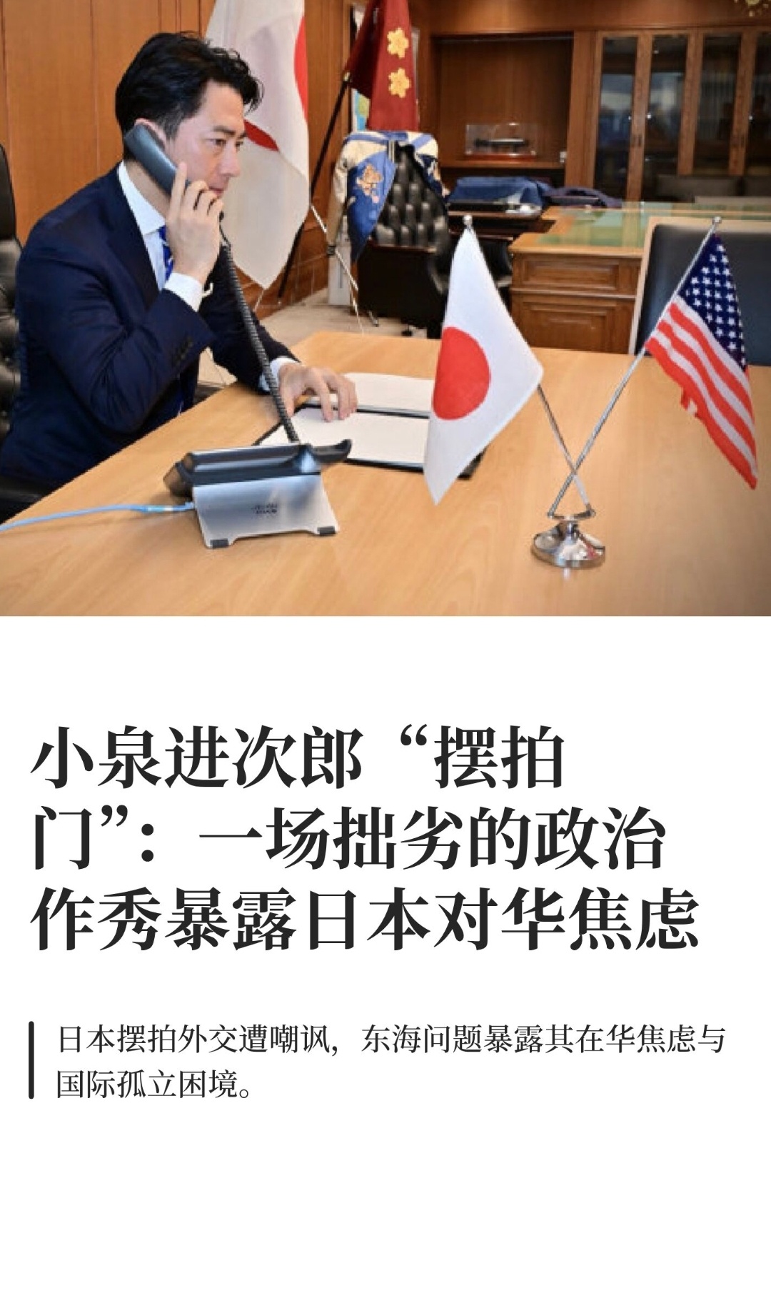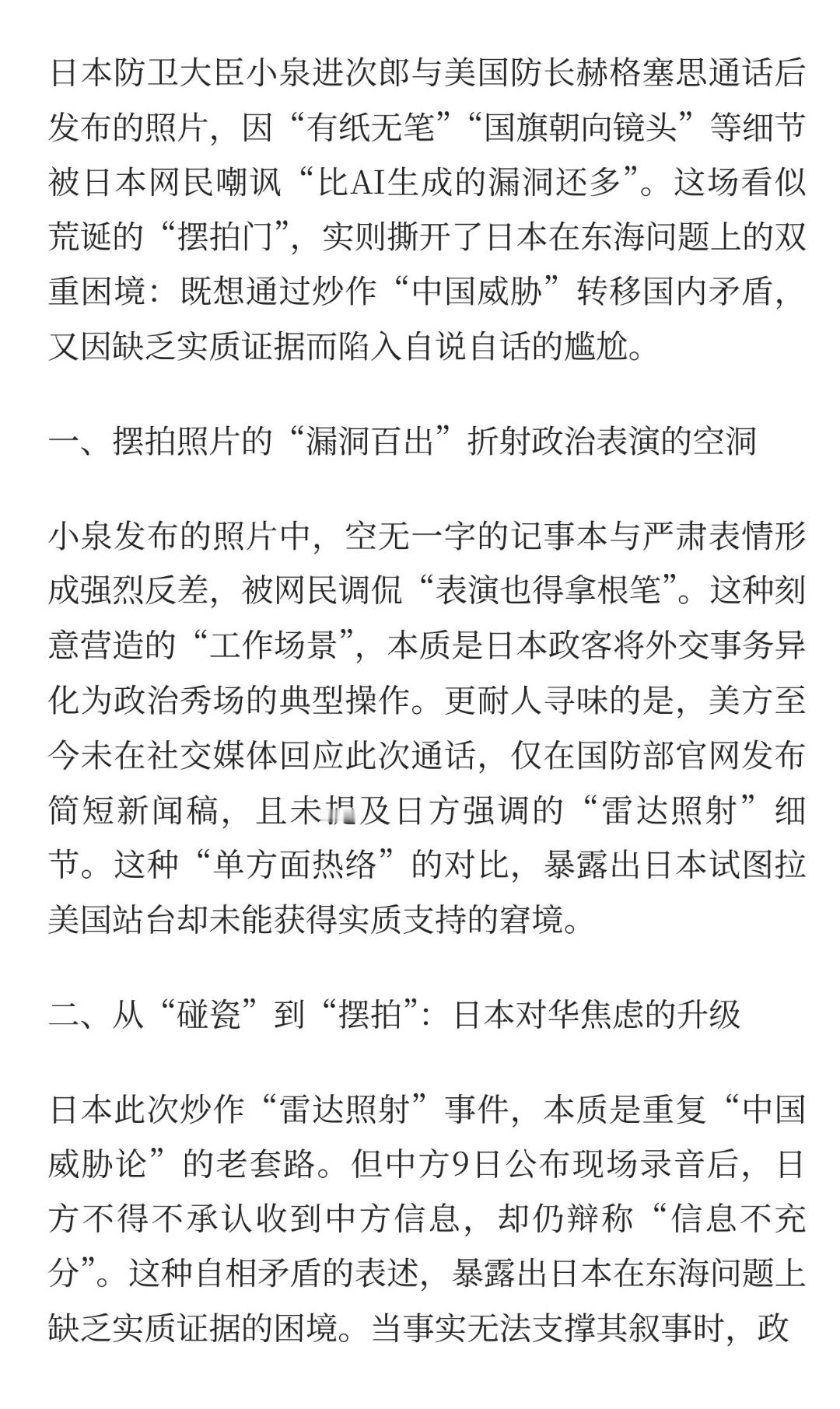 | 日本防卫大臣小泉进次郎与美国防长赫格塞思通话后发布的照片,因“有纸无笔”“国旗朝向镜头”等细节被日本网民嘲讽“比AI生成的漏洞还多”。这场看似荒诞的“摆拍门”,实则撕开了日本在东海问题上的双重困境:既想通过炒作“中国威胁”转移国内矛盾,又因缺乏实质证据而陷入自说自话的尴尬。小泉发布的照片中,空无一字的记事本与严肃表情形成强烈反差,被网民调侃“表演也得拿根笔”。这种刻意营造的“工作场景”,本质是日本政客将外交事务异化为政治秀场的典型操作。更耐人寻味的是,美方至今未在社交媒体回应此次通话,仅在国防部官网发布简短新闻稿,且未提及日方强调的“雷达照射”细节。这种“单方面热络”的对比,暴露出日本试图拉美国站台却未能获得实质支持的窘境。日本此次炒作“雷达照射”事件,本质是重复“中国威胁论”的老套路。但中方9日公布现场录音后,日方不得不承认收到中方信息,却仍辩称“信息不充分”。这种自相矛盾的表述,暴露出日本在东海问题上缺乏实质证据的困境。当事实无法支撑其叙事时,政客们只能转向更低级的表演——从捏造事件到摆拍照片,焦虑情绪可见一斑。中国外交部发言人郭嘉昆的回应直指核心:“日方自说自话、自相矛盾、自我诡辩,暴露出其制造紧张、‘碰瓷’炒作的真实目的。”这种定性得到国际社会广泛认同。值得注意的是,美国虽在国防部新闻稿中提及“中国军事活动”,但未对日方指控表示支持。这种“选择性回应”表明,美国不愿为日本的无端指责背书,更不愿被卷入中日矛盾。日本盟友的“清醒”,进一步压缩了日本炒作的空间。小泉进次郎的“摆拍门”,本质是一场失败的政治营销。当政客们沉迷于制造话题、操控舆论时,却忘了最基础的逻辑:任何外交表演都需以事实为根基。日本若真想改善中日关系,与其在照片上做文章,不如正视历史问题、停止干涉中国内政、撤回涉台错误言论。否则,类似的荒诞剧只会不断上演,而日本在国际社会的信誉,也将在这场拙劣的表演中持续透支。