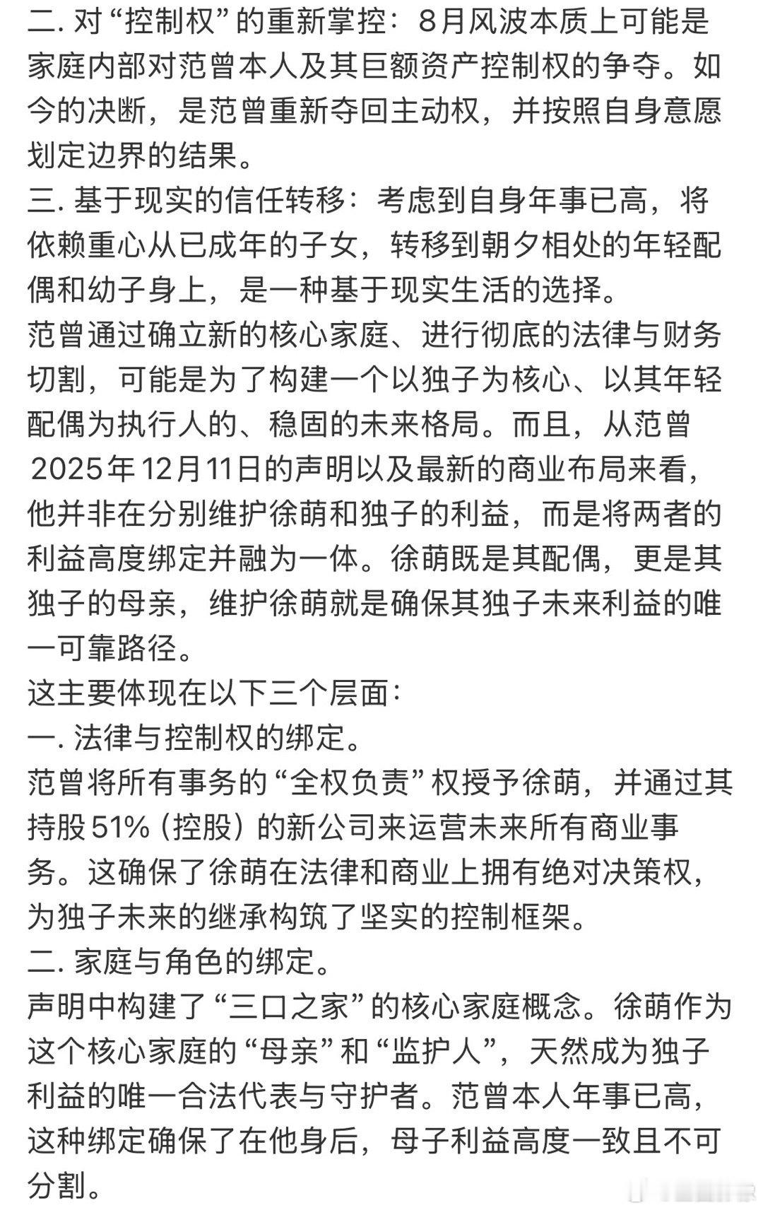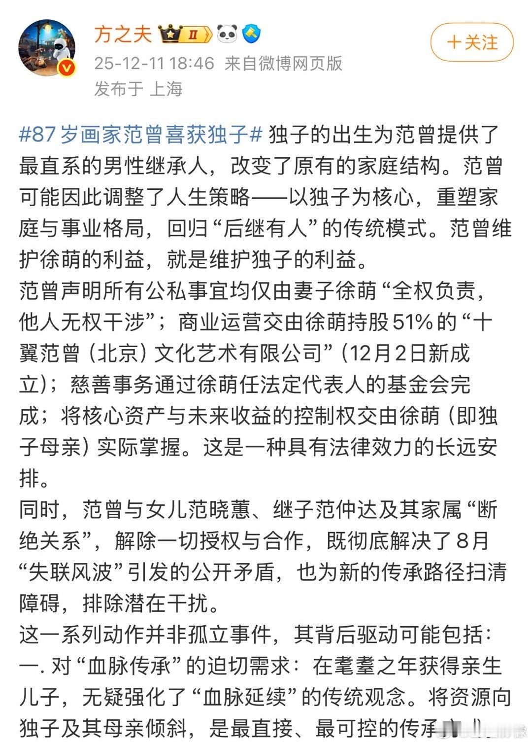 财经博主分析得挺到位,既然孩子还小,就得趁早做打算,范曾现在让徐萌掌控多数财产,也是为了避免今后一些人的小心思伤害到儿子。徐萌跟孩子是一体的,给徐萌保障就是给孩子的未来上保险,范老考虑得挺长远。