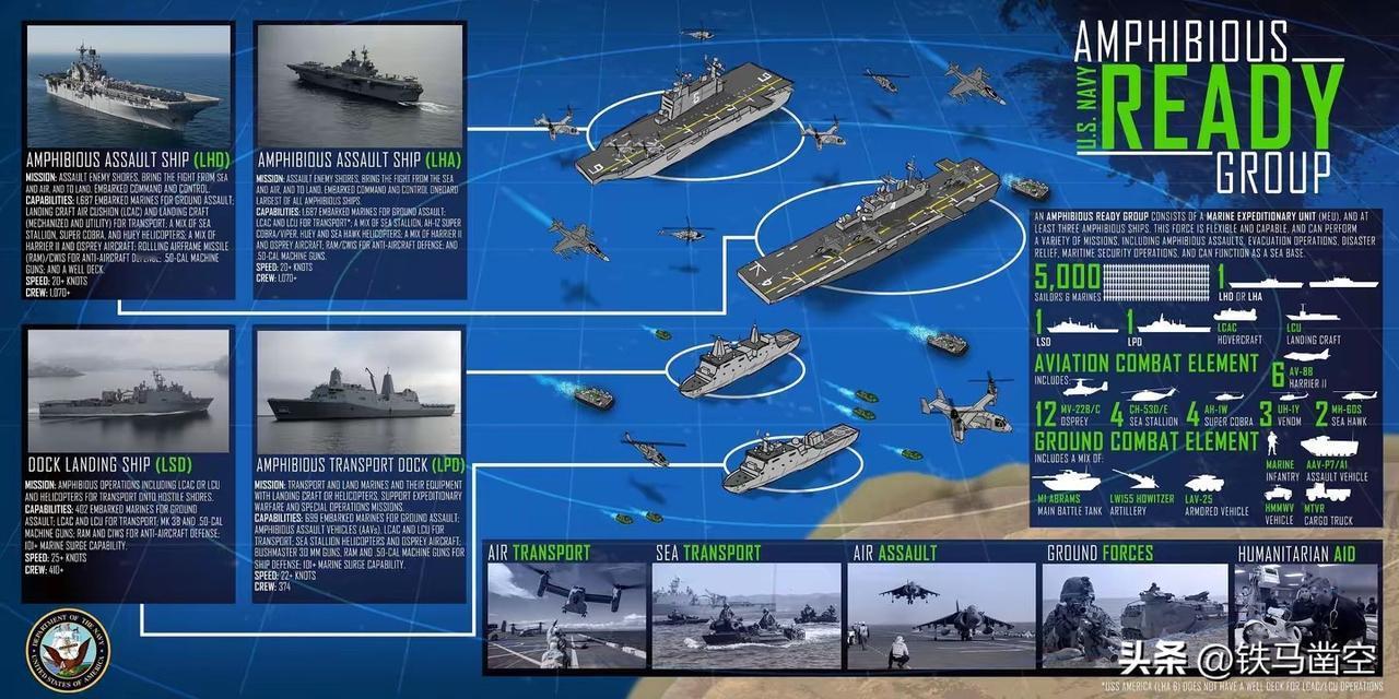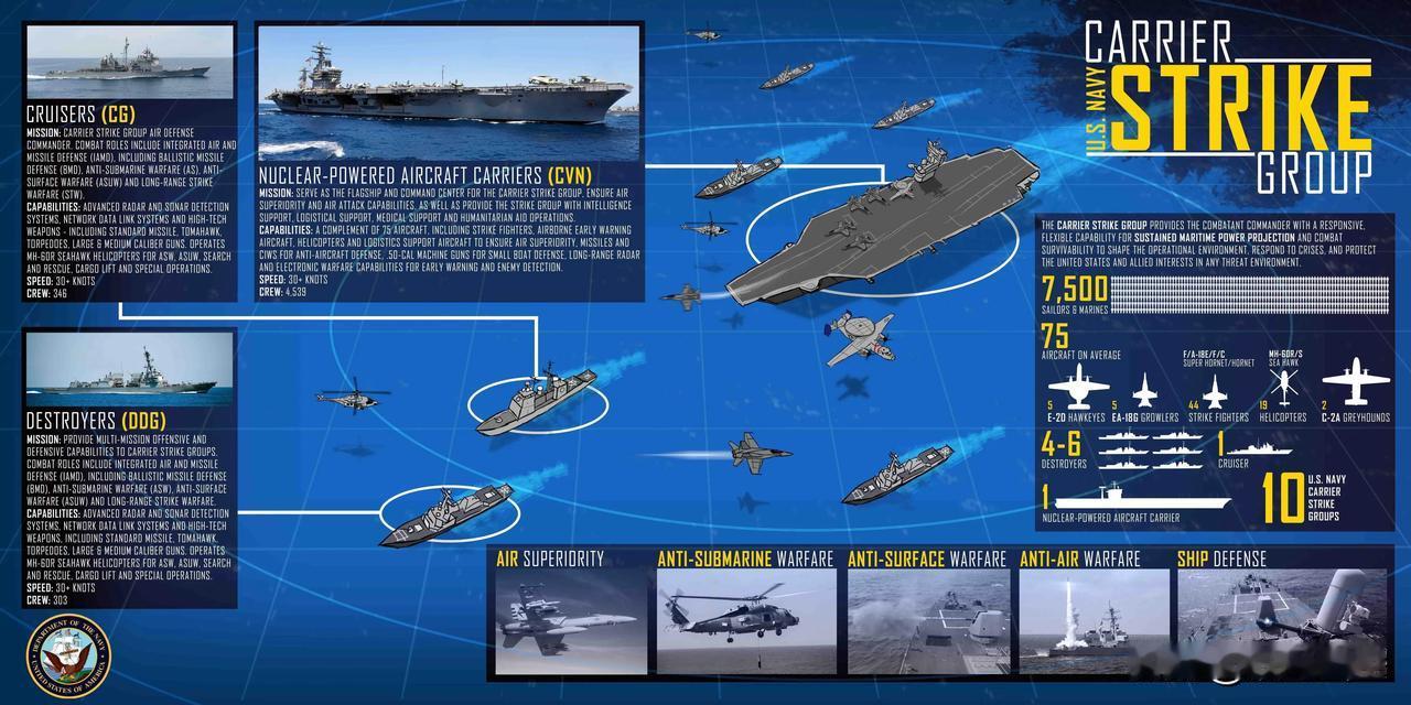 美军航母打击群(CSG)与两栖戒备群(ARG)是其远洋力量核心,两者定位与功能不同。 CSG是海空打击平台,核心是核动力航母及其70余架舰载机,主要任务是夺取制海制空权,进行高强度远程打击。典型编队包括巡洋舰、驱逐舰和核潜艇等。 ARG是两栖投送力量,核心是两栖攻击舰(可搭载F-35B战机与直升机),搭载约2200人的陆战队远征队。主要任务是将部队由海向陆投送,执行登陆、撤侨等行动。编队通常包括两栖运输舰和船坞登陆舰。 两者可独立行动,也可协同作战。在高强度两栖战役中,CSG为ARG提供空中掩护与远程火力支援,而ARG的F-35B则负责近距支援,形成互补。 美国航母战斗群 两栖攻击群 美国海军 军事 军迷发烧友