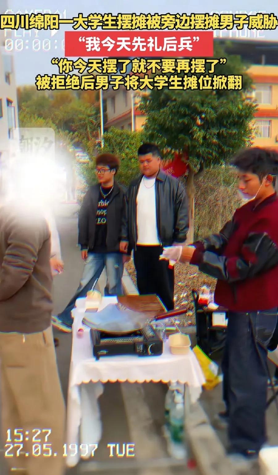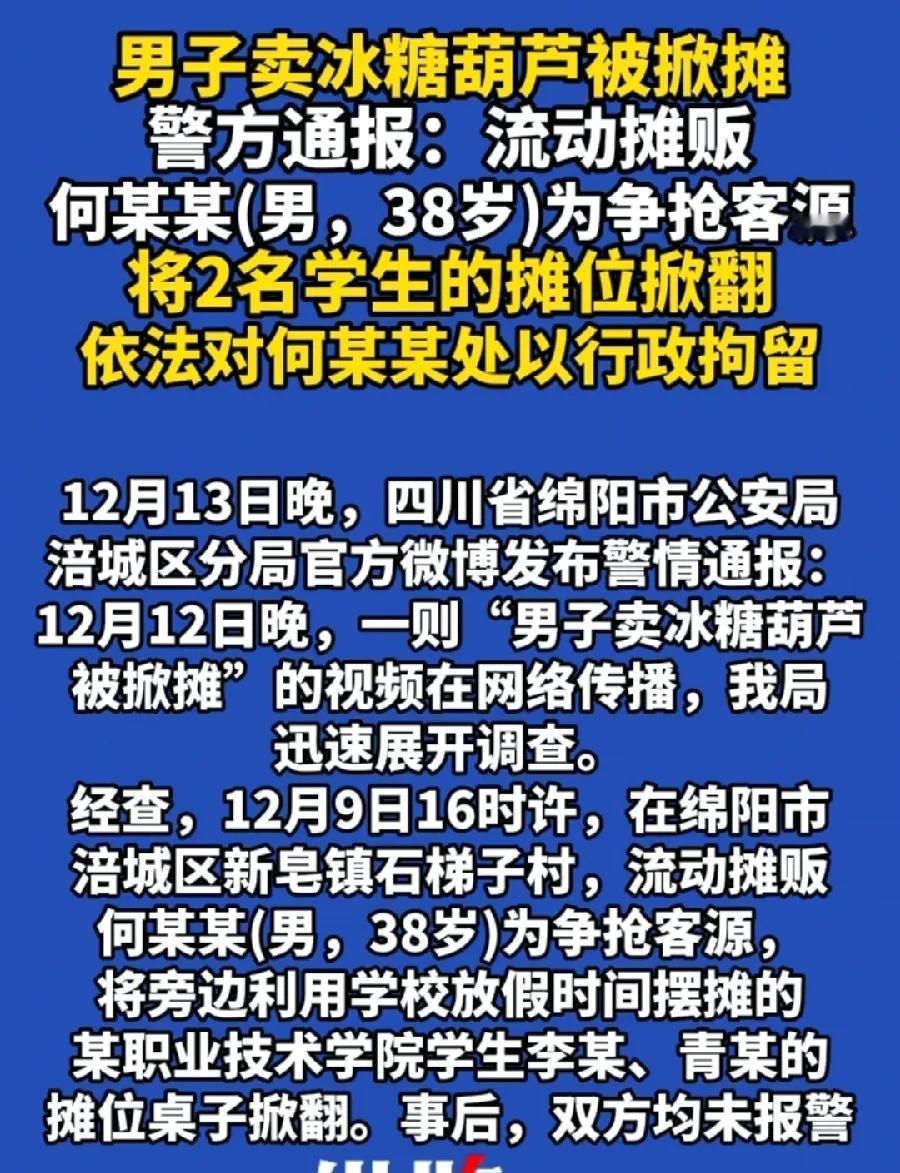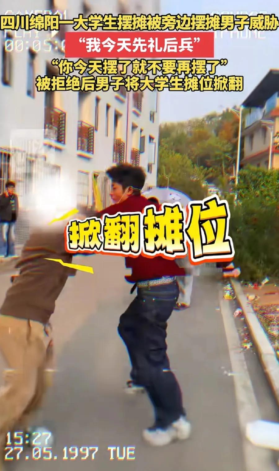 这下好了, 大客户来了[捂脸]! 四川绵阳,一大学生摆摊卖糖葫芦,被同行的商贩一把推翻,还警告他明天别来了。 大学生也是不怂,被推翻的一瞬间就冲了上去,和对方差点打起来。 最后男子被帽子叔叔带走,经过调解,他道歉并做出了赔偿,双方和解。 看视频,这个大学生的摊位没有几根糖葫芦,摆放也很简单,没啥创意,一看就不是做生意的料,本来都坚持不了几天的[笑哭] 这下好了,喜提大客户,还得说谢谢啊。 还是男的格局太小了,做的蠢事,让人看了想笑。。