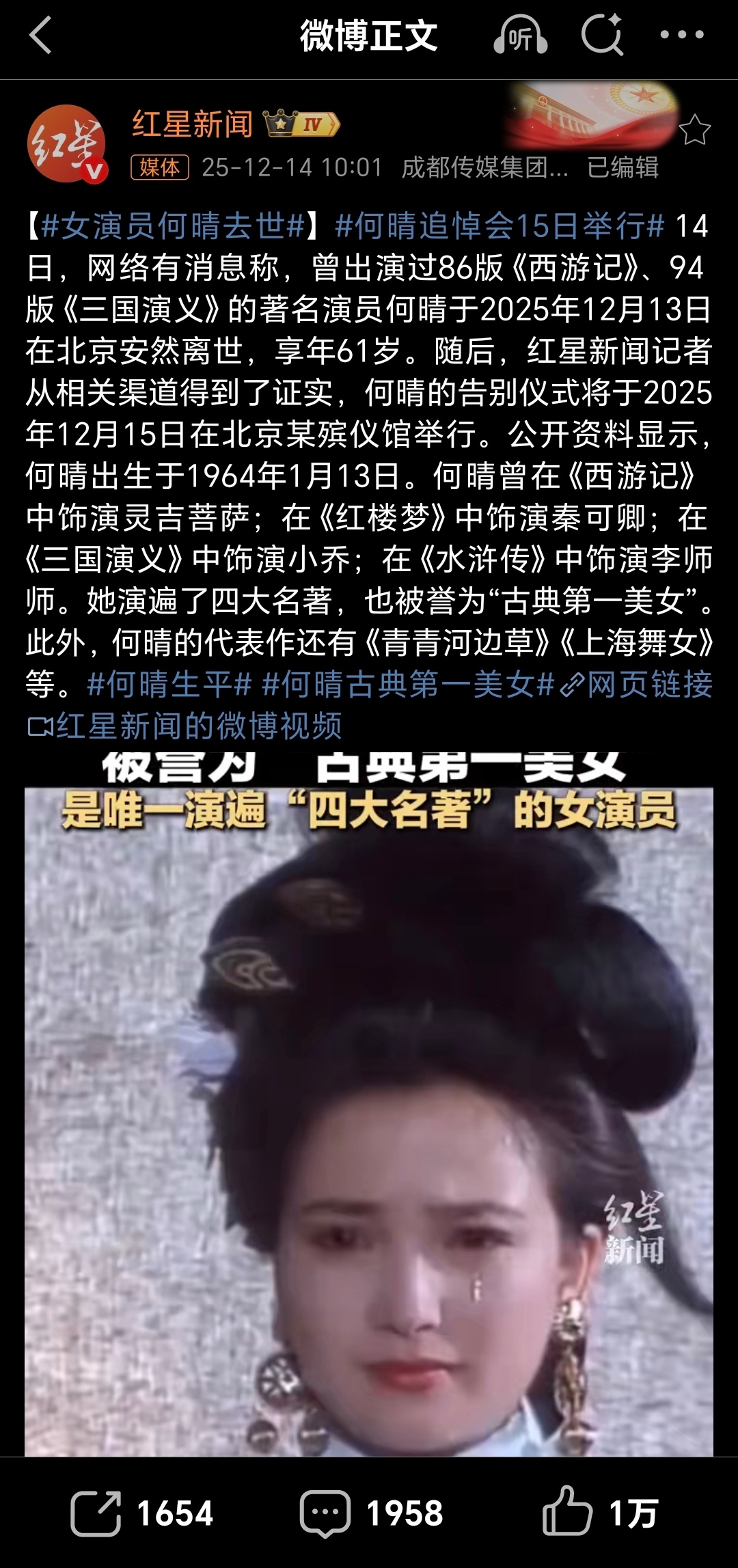 演员何晴去世早上看到何晴老师去世的传闻时,还希望是假的,没想到……她是我们这代人心中独一无二的“古典第一美人”,是唯一演遍了四大名著的女演员。灵吉菩萨、小乔、秦可卿、李师师,每一个角色都那么经典。愿天堂没有病痛,一路走好