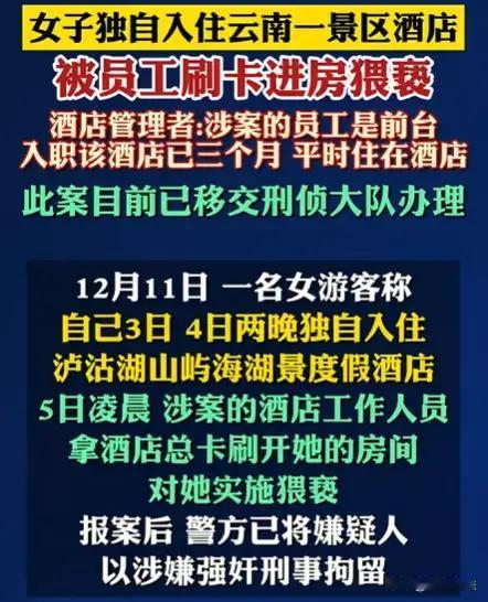 根据现有信息,云南丽江泸沽湖酒店员工持总卡闯入女住客房内实施猥亵事件,涉及刑事犯罪、酒店管理责任及消费者维权等多重问题。结合相关法律规定和案件细节,分析如下: ------ 一、核心事实梳理 1. 事件经过 • 2025年12月3日至4日,女游客独自入住泸沽湖山屿海湖景度假酒店(花海码头店)。 • 12月5日凌晨,酒店前台员工王某持万能总卡擅自刷开房门,对正在睡觉的女游客实施猥亵。 • 女游客惊醒后反抗并报警,警方以涉嫌强奸罪对王某刑事拘留。 2. 涉事方回应 • 酒店:承认事件属实但称系“员工个人行为”,仅发一条微信道歉;事发后仍照常营业,直至记者介入才显示“暂无房型”。 • 景区:未公开回应,女游客要求景区加强酒店管理检查。 • 警方:立案侦查并移交刑侦大队,调取监控、床单等证据。 ------ 二、法律责任分析 (1)王某的刑事责任:涉嫌强奸罪 • 法律依据: • 王某持总卡强行进入住客房间实施猥亵,违背受害者意志,符合《刑法》第二百三十六条强奸罪中“以暴力、胁迫或其他手段强奸妇女”的构成要件。 • 司法实践中,侵入私密空间实施性侵害可能被认定为强奸未遂或强制猥亵罪,具体需根据行为程度(如是否意图发生性关系)认定。 • 现状:警方以涉嫌强奸罪立案,王某已被刑拘,案件正进一步侦查。 (2)酒店的民事及行政责任 • 安全保障义务缺失: • 根据《民法典》第一千一百九十八条,酒店作为经营者,未确保客房物理安全(万能总卡管理失控),未严格审核员工背景(王某入职仅3个月),构成重大过失。 • 酒店声称“系员工个人行为”不能免责,需对员工履职中的侵权行为承担替代责任。 • 事后处置不当: • 未及时停业整改、未正式道歉、推诿责任,违反《消费者权益保护法》对消费者尊严和安全的保障义务。 • 行政处罚风险: • 市场监管部门可依据《治安管理处罚法》对酒店处以警告、罚款或停业整顿。 (3)受害者的维权路径 • 刑事附带民事诉讼: • 在王某刑事案件审理中,可主张医疗费、心理治疗费、精神损害赔偿等(需提供医疗记录、心理咨询凭证等证据)。 • 单独起诉酒店索赔: • 要求酒店承担违约或侵权责任,索赔范围包括:人身损害赔偿(《民法典》第一千一百七十九条)、精神抚慰金(最高法司法解释)、赔礼道歉等。 • 向监管部门投诉: • 向文旅部门、消协投诉酒店安全隐患,推动行政处罚及行业整改。 ------ 三、社会警示与行业漏洞 1. 酒店管理乱象 • 万能总卡滥用:员工可随意进入客房,暴露权限管理漏洞(如未设置分级门禁、未记录刷卡日志)。 • 员工监管缺位:未建立入职背景审查、定期培训及行为监控机制。 2. 行业整改建议 • 强制技术升级:推广“智能门锁+人脸识别”,限制非授权人员进入客房。 • 建立黑名单制度:对涉事酒店及员工纳入旅游信用系统,限制从业资格。 ------ 四、受害者后续行动建议 1. 固定证据 • 保存报警记录、立案告知书、酒店沟通记录、医疗证明等。 2. 法律协助 • 申请法律援助或聘请律师,准备刑事附带民事诉讼材料。 3. 舆论监督 • 通过媒体持续发声,推动监管部门介入调查酒店安全管理体系。 注:本案中酒店推责话术(“员工个人行为”)系行业常见逃避手段,但法律上经营者必须对员工职务行为负责。受害者坚持维权有望获得合理赔偿,并推动行业安全标准提升。上海猥亵事件 动车猥亵