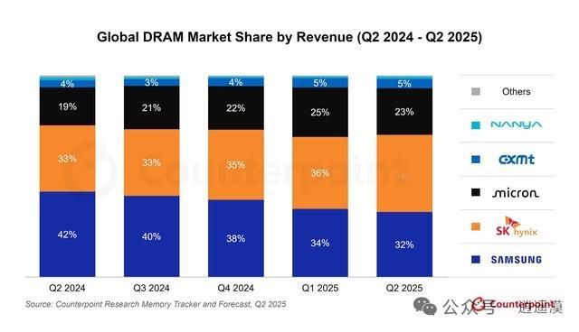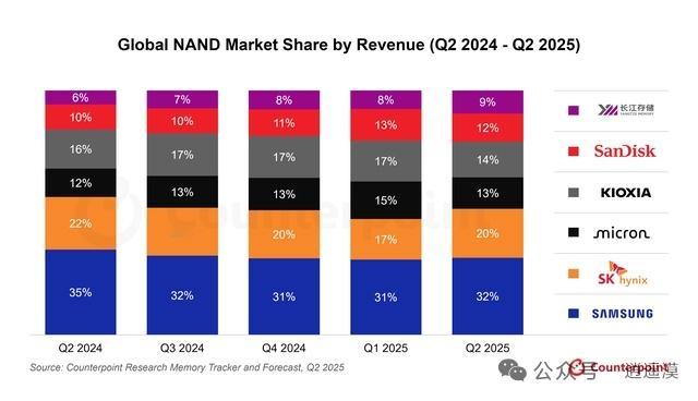 中国存储器终于有市场份额了NAND存储,也就是手机存储和固态硬盘这些,2025年2季度长江存储份额来到9%。前面是三星、SK海力士、美光、铠侠、闪迪。DRAM也就是内存、HBM这些,长鑫存储份额有5%了。前面是三星、SK海力士、美光,后面还有台湾的南亚科技。可以看出,韩国两家在DRAM上优势更大,EUV光刻机作用很大。NAND份额更为分散,中国公司技术水平很不错了。芯片业还是得讲市场份额。中国公司任重道远,技术不断突破,但还处于顽强生存的阶段。