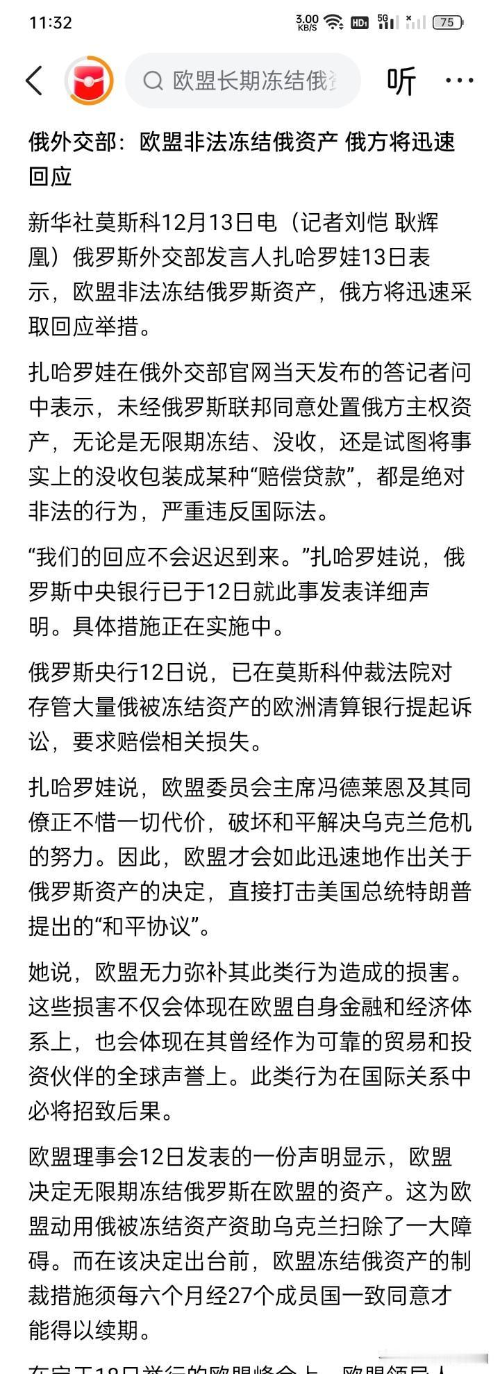 迅速回应搬出来他? 欧盟非法冻结俄资产,俄罗斯将迅速回应!这本来就是一个很大的事,欧盟冻结俄罗斯庞大的2100亿欧元资产,这笔巨额资产,差不多可以买下全世界的很多的某个国家。 大概不少人都已经知道,俄罗斯的央行已经在莫斯科的仲裁法院,提起对存有大量俄资产的欧洲清算银行的诉讼,要求归还冻结的资产,并赔偿由于冻结资产造成的一切损失。然而,让人不得不考虑的是,莫斯科的仲裁法院的裁定能管得了欧洲清算银行的那一块吗?欧盟会在乎莫斯科仲裁法院的裁决吗?否则,无论如何裁决又有什么意义呢? 目前,还没有看到俄罗斯采取其它措施或行动的消息。 不过,俄罗斯外交部发言人扎哈罗娃似乎搬出来了美国总统特朗普,她说:欧盟委员会主席冯德莱恩及其同伙,正在不惜一切代价,破坏乌克兰战争停战和签署和平协议的努力,就是直接打击特朗普的提出的“和平协议”。