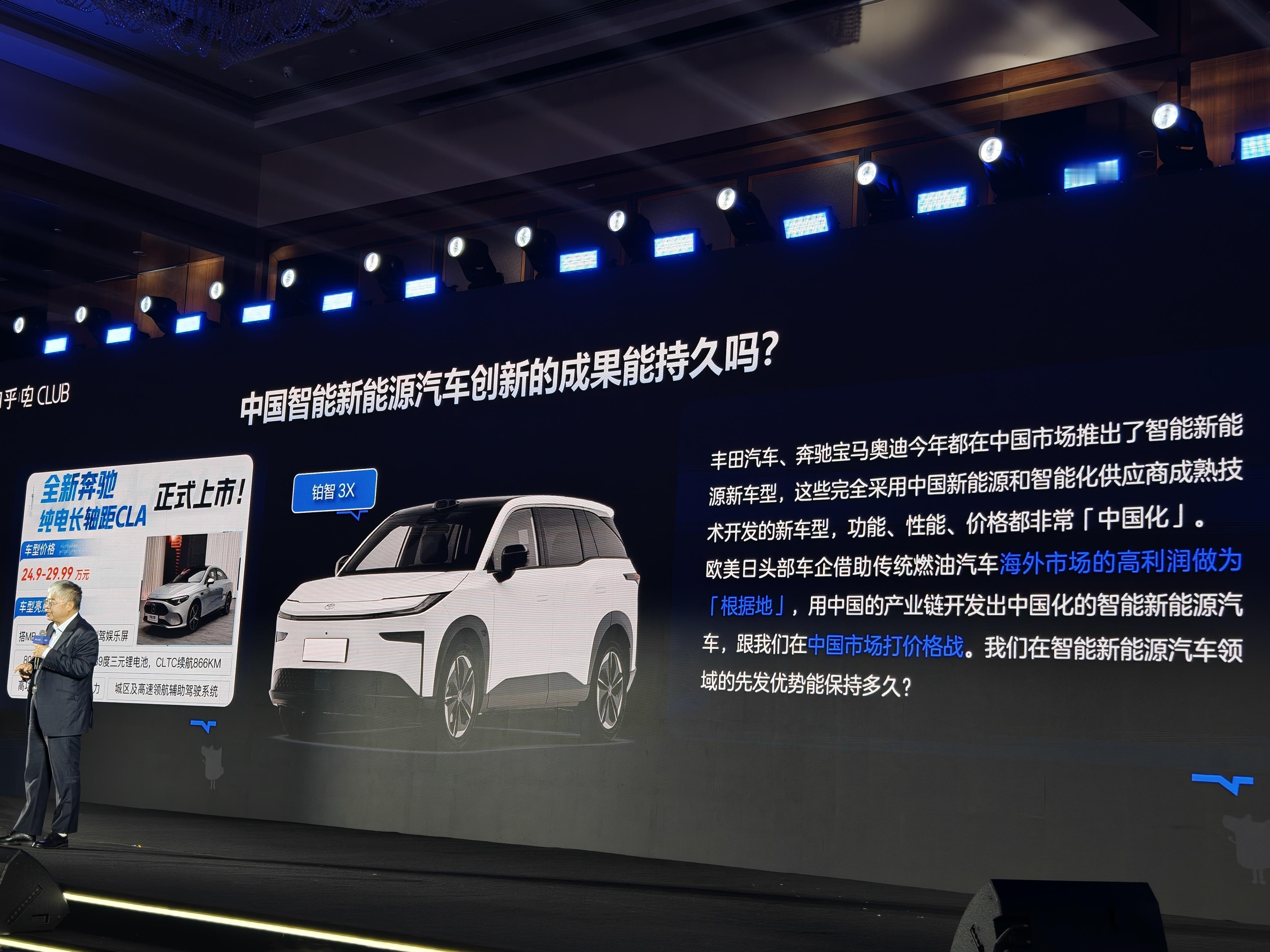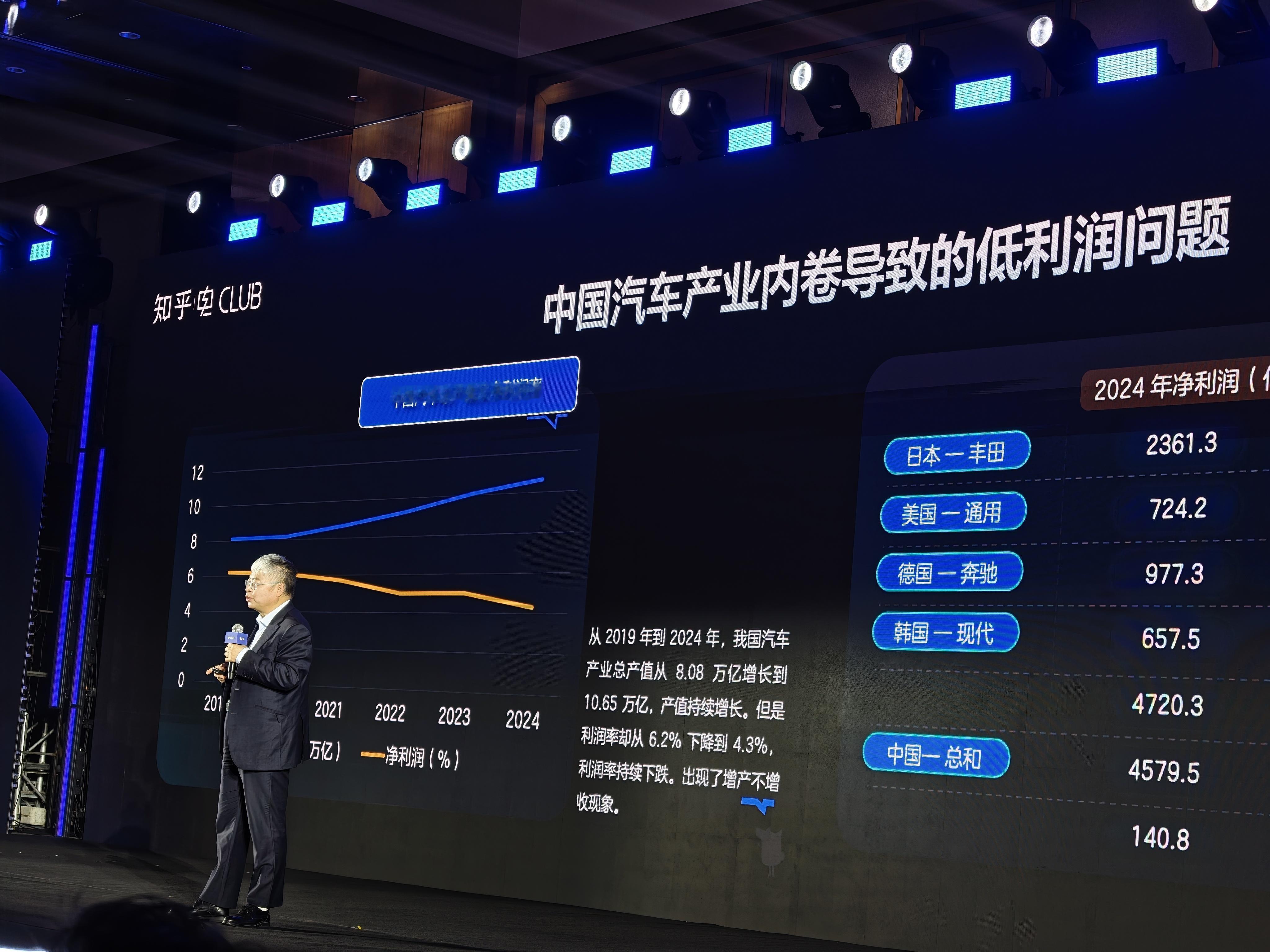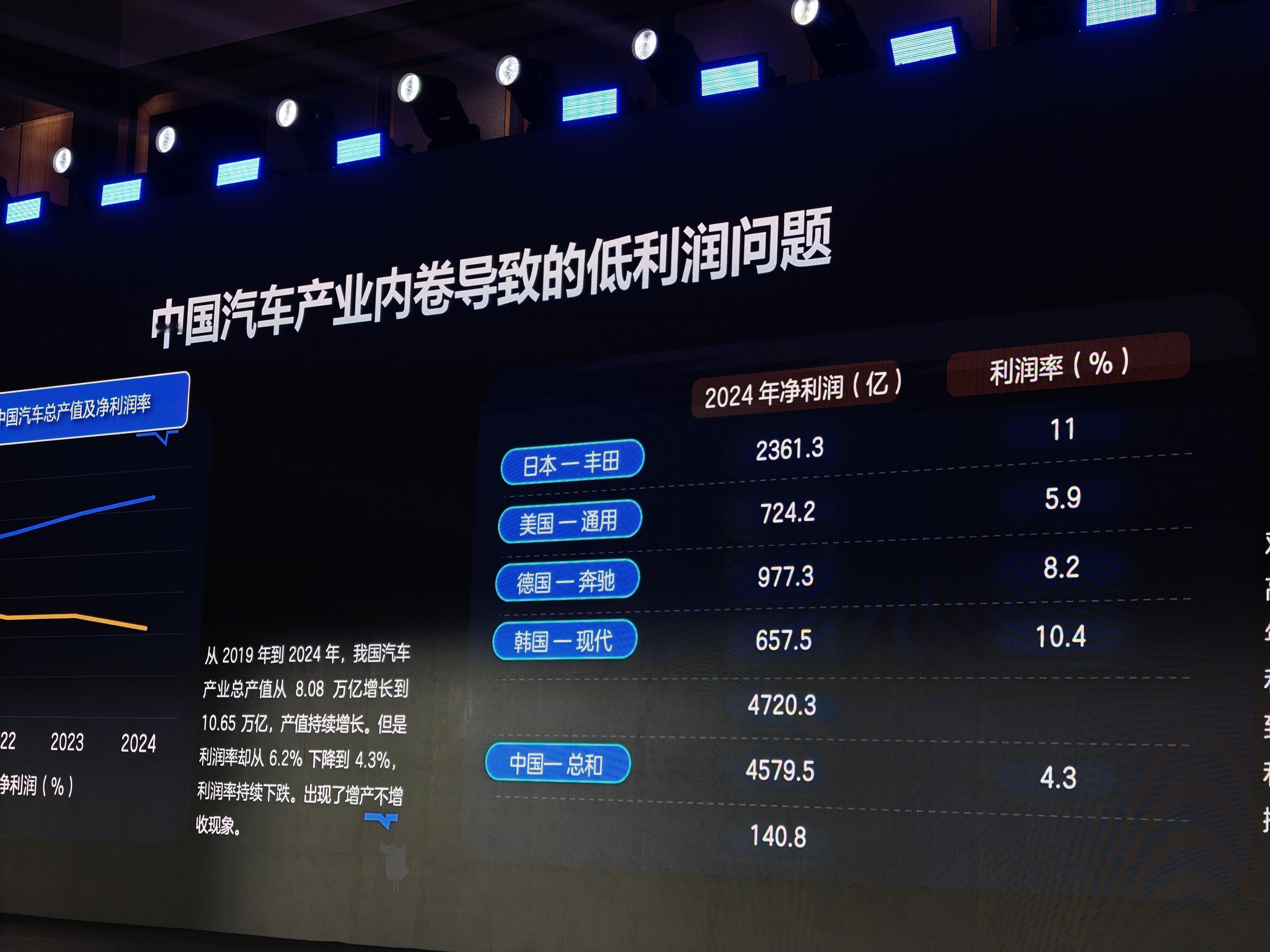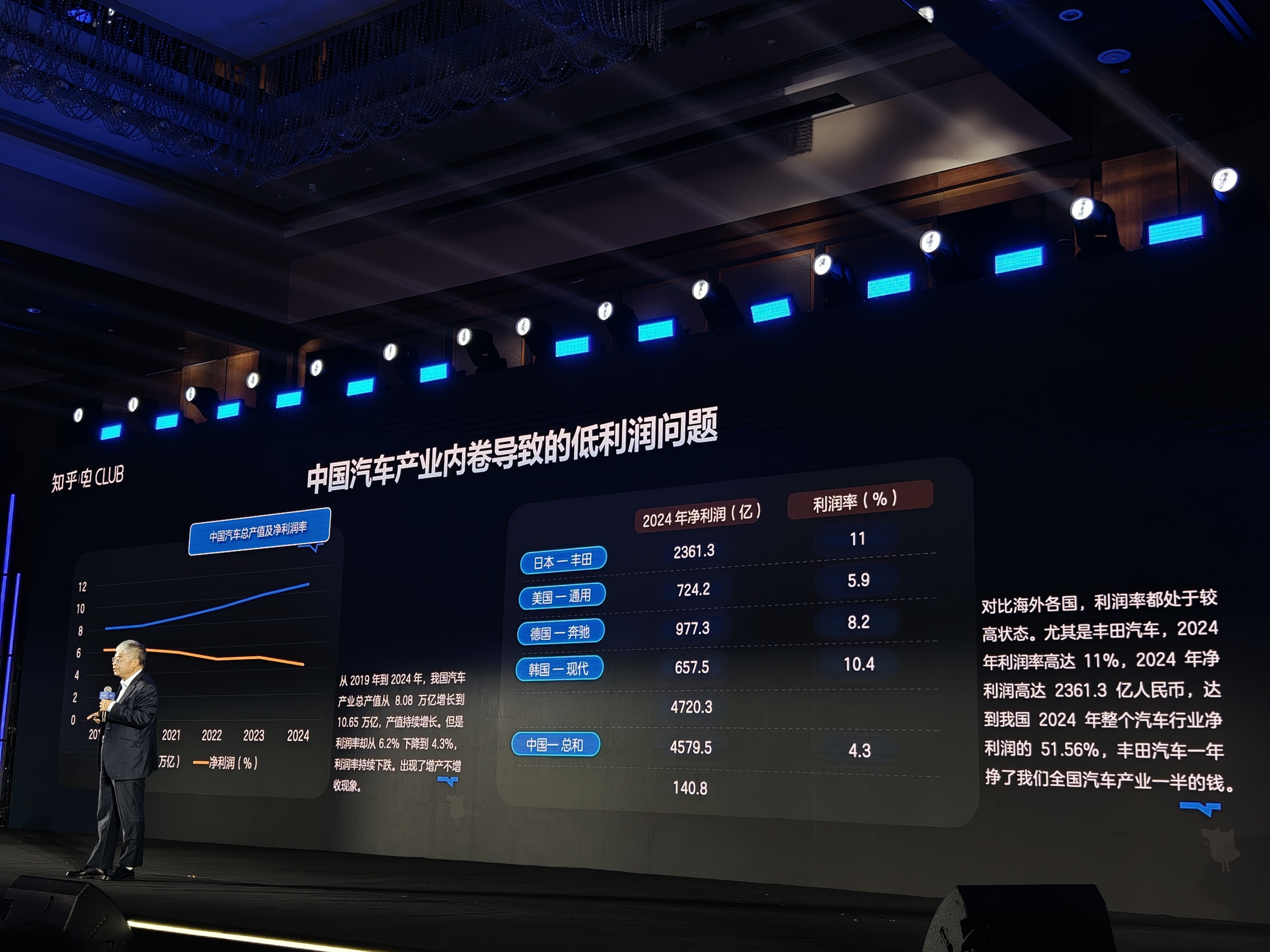 2025知乎电Club上朱西产的演讲里面有一张PPT还挺重要的,他说行业存在过度内卷与利润偏低问题:全行业平均利润率仅4.3%,远低于丰田的11%,丰田一家的利润等于中国汽车行业利润总和的56%。而且合资品牌正利用海外高利润根据地加入国内价格战,对中国车企构成生存威胁。汽场全开大v聊车