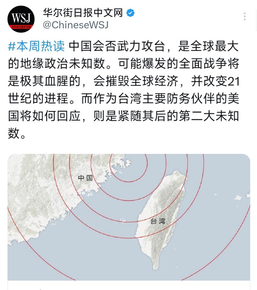 12月13日,华尔街日报发表:“中国会否武力攻台,是全球最大的地缘政治未知数。可能爆发的全面战争将是极其血腥的,会摧毁全球经济,并改变21世纪的进程。而作为台湾主要防务伙伴的美国将如何回应,则是紧随其后的第二大未知数。” 说白了,这就是美国在蓄意挑动大陆与台湾的对立,其险恶用心昭然若揭。无非就是怕中国顺利实现统一,影响其在亚太地区的“霸权垄断”。 要知道,如今中国的全方面发展趋势正在冲刺世界的顶尖水平,美国已经很难阻止,现在唯一的途径可能就是通过台湾牵制了,如果中国实现统一,台积电等全球性包揽的产业就会使中国的发展趋势更加无懈可击,从而占据全球产业链、供应链与科技竞争的核心高地,直接冲击美国在科技和经济领域的“霸权”地位。 说实话,中国从一开始就没有打算走武统的这一条路,美国纯属是在恶意炒作,他们眼里完全没有台湾同胞的安危,满脑子都是自己国家的利益,与怎么遏制中国的发展,可惜中国的立场始终不会变,那就是争取和平统一! 说到底,台湾是中国的一部分,这是铁一般的事实,虽然这次美国刻意激化矛盾,试图用台湾这枚 “棋子” 拖住中国发展,但这终究改变不了两岸同属一中的核心事实,也挡不住国家统一的历史大势。